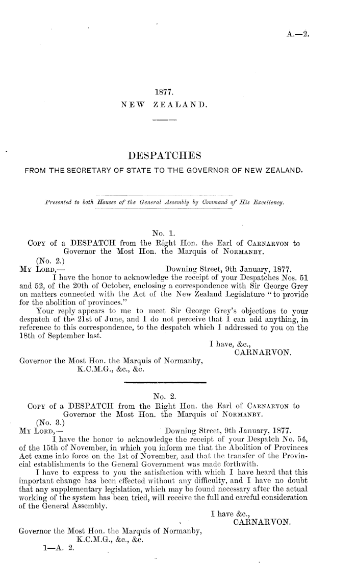 No. 2. Copy of a DESPATCH from the Right Hon. the Earl of Carnarvon to Governor the Most Hon. the Marquis of Normanby. (No. 3.) My Lord,— Downing Street, 9th January, 1877. I. have the honor to acknowledge the receipt of your Despatch No. 54, of the loth of November, in which you inform me that the Abolition of Provinces Act came into force on the Ist of November, and that the transfer of the Provincial establishments to the General Government was made forthwith. I have to express to you the satisfaction with which I have heard that this important change has been effected without any difficulty, and I have no doubt that any supplementary legislation, which may be found necessary after the actual working of the system has been tried, will receive the full and careful consideration of the General Assembly. I have &c, CARNARVON. Governor the Most Hon. the Marquis of Normanby, K.C.M.G., &c, &c. I—A. 2.