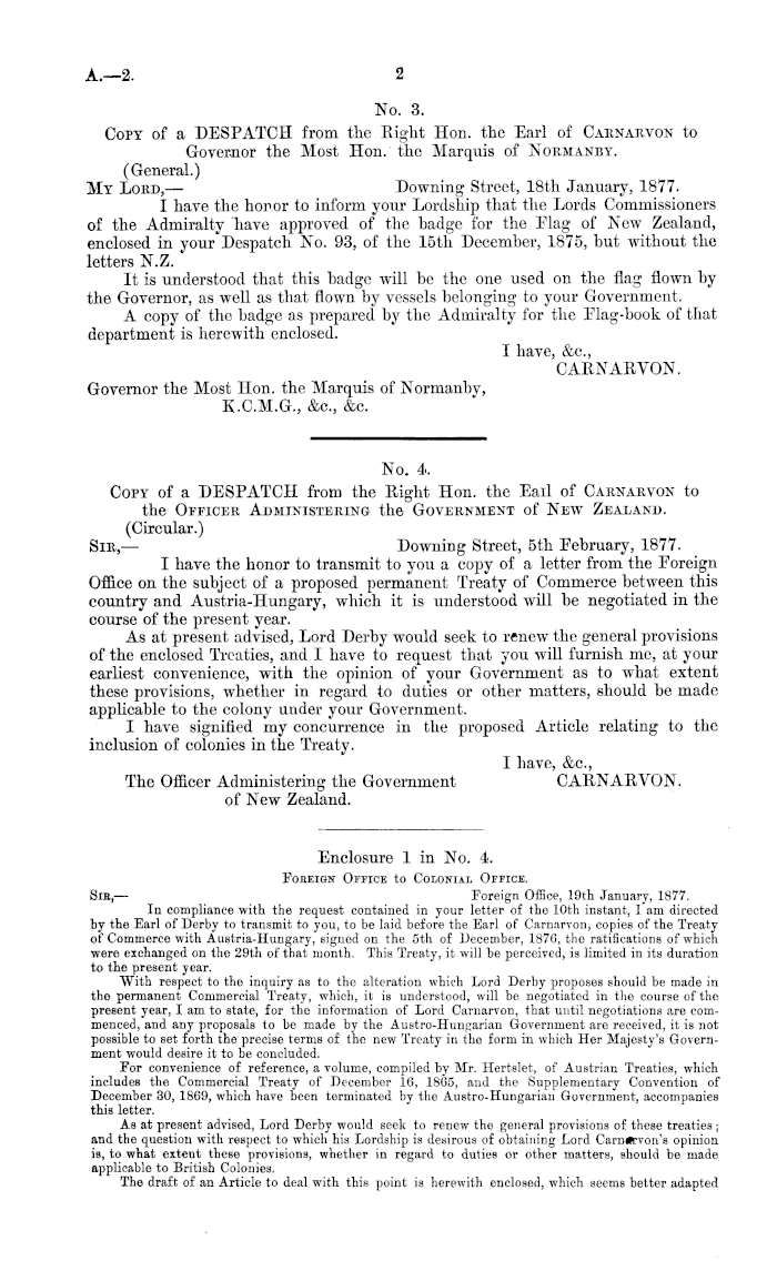 No. 3. Copy of a DESPATCH from the Right Hon. the Earl of Carnarvon to Governor the Most Hon. the Marquis of Normanby. (General.) My Lord, — Downing Street, 18th January, 1877. I have the honor to inform your Lordship that the Lords Commissioners of the Admiralty have approved of the badge for the Elag of New Zealand, enclosed in your Despatch No. 93, of the 15th December, 1875, but without the letters N.Z. It is understood that this badge will be the one used on the flag flown by the Governor, as well as that flown by vessels belonging to your Government. A copy of the badge as prepared by the Admiralty for the Elag-book of that department is herewith enclosed. I have, &c., CARNARVON. Governor the Most Hon. the Marquis of Normanby, K.C.M.G., &c., &c.