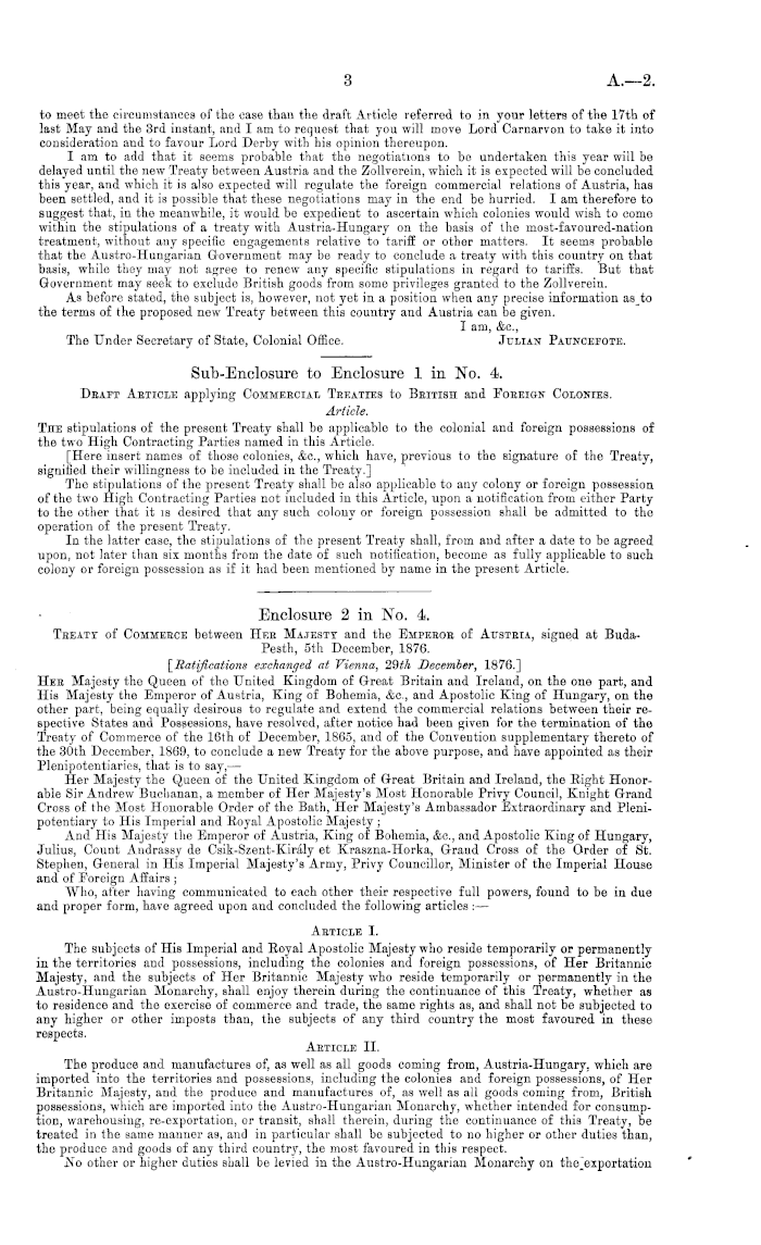 Enclosure 1 in No. 4. Foeeign Office to Colonial Office. Sib, — Foreign Office, 19th January, 1877. In compliance with the request contained in your letter of the 10th instant, 1 am directed by the Earl of Derby to transmit to you, to be laid before the Earl of Carnarvon, copies of the Treaty of Commerce with Austria-Hungary, signed on the sth of December, 1876, the ratifications of which were exchanged on the 29th of that month. This Treaty, it will be perceived, is limited in its duration to the present year. With respect to the inquiry as to the alteration which Lord Derby proposes should be made in the permanent Commercial Treaty, which, it is understood, will be negotiated in the course of the present year, I am to state, for the information of Lord Carnarvon, that until negotiations are commenced, and any proposals to be made by the Austro-Hungarian Government are received, it is not possible to set forth the precise terms of the new Treaty in the form in which Her Majesty's Government would desire it to be concluded. Eor convenience of reference, a volume, compiled by Mr. Hertslet, of Austrian Treaties, which includes the Commercial Treaty of December 16, 1865, and the Supplementary Convention of December 30, 1869, which have been terminated by the Austro-Hungarian Government, accompanies this letter. As at present advised, Lord Derby would seek to renew the general provisions of these treaties; and the question with respect to which his Lordship is desirous of obtaining Lord Carnarvon's opinion is, to what extent these provisions, whether in regard to duties or other matters, should be made applicable to British Colonies. The draft of an Article to deal with this point is herewith enclosed, which seems better adapted