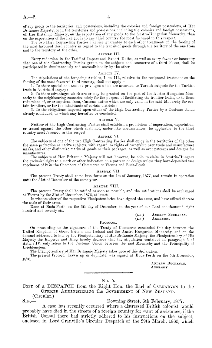 of any goods to the territories and possessions, including the colonies and foreign possessions, of Her Britannic Majesty, or in the territories and possessions, including the colonies and foreign possessions, of Her Britannic Majesty, on the exportation of any goods to the Austro-Hungarian Monarchy, than on the exportation of the like goods to any third country the most favoured in this respect. The two High Contracting Parties likewise guarantee to each other treatment on the footing of the most favoured, third country in regard to the transit of goods through the territory of the one from and to the territory of the other. Aeticle 111. Every reduction in the Tariff of Import and Export Duties, as well as every favour or immunity that one of the Contracting Parties grants to the subjects and commerce of a third Power, shall be participated in simultaneously and unconditionally by Ihe other. Aeticle IV. The stipulations of the foregoing Articles, I. to 111., relative to the reciprocal treatment on the footing of the most favoured third country, shall not apply — 1. To those special and ancient privileges which are accorded to Turkish subjects for the Turkish trade in Austria-Hungary: 2. To those advantages which are or may be granted on the part of the Austro-Hungarian Monarchy to the neighbouring countries solely for the purpose of facilitating the frontier traffic, or to those reductions of, or exemptions from, Customs duties which are only valid in the said Monarchy for certain frontiers, or for the inhabitants of certain districts : 3. To the obligations imposed upon either of the High Contracting Parties by a Customs Union already concluded, or which may hereafter be concluded. Aeticle V. Neither of the High Contracting Parties shall establish a prohibition of importation, exportation, or transit against the other which shall not, under like circumstances, be applicable to the third country most favoured in this respect. Article VI. The subjects of one of the two High Contracting Parties shall enjoy in the territories of the other the same protection as native subjects, with regard to rights of ownership over trade and manufacture marks, and other distinctive marks of goods or their packages, as well as over patterns and designs for manufactures. The subjects of Her Britannic Majesty will not, however, be able to claim in Austria-Hungary the exclusive right to a mark or other indication on a pattern or design unless they have deposited two specimens of it in the Chambers of Commerce at Vienna and Buda-Pesth. Article VII. The present Treaty shall come into force on the Ist of January, 1877, and remain in operation until the 31st of December of the same year. Article VIII. The present Treaty shall be ratified as soon as possible, and the ratifications shall be exchanged at Vienna by the 31st of December, 1876, at latest. In witness whereof the respective Plenipotentiaries have signed the same, and have affixed thereto the seals of their arms. Done at Buda-Pesth, on the sth day of December, in the year of our Lord one thousand eight hundred and seventy-six. (1.5.) Andrew Buchanan, (1.5.) Andeassy. Peotocol. On proceeding to the signature of the Treaty of Commerce concluded this day between the United Kingdom of Great Britain and Ireland and the Austro-Hungarian Monarchy, and on the demand addressed to him by the Plenipotentiary of Her Britannic Majesty, the Plenipotentiary of His Majesty the Emperor and King hereby declares that the stipulation contained in paragraph 3 of Article IV. only refers to the Customs Union between the said Monarchy and the Principality of Liechtenstein, The Plenipotentiary of Her Britannic Majesty takes note of this declaration. The present Protocol, drawn up in duplicate, was signed at Buda-Pesth on the sth December, 1876. Andrew Buchanan. Andeasst.