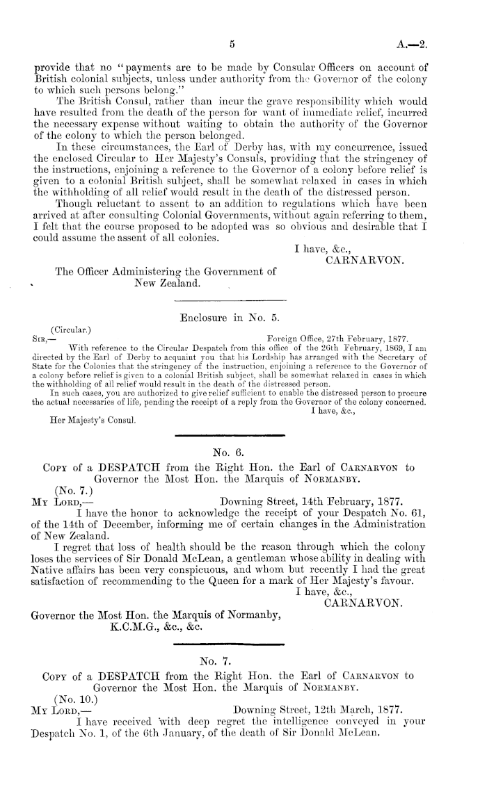 No. 5. Copy of a DESPATCH from the Right Hon. the Earl of Carnarvon to the Officer Administering the Government of New Zealand. (Circular.) Sir, — Downing Street, 6th February, 1877. A case has recently occurred where a distressed British colonist would probably have died in the streets of a foreign country for want of assistance, if the British Consul there had strictly adhered to his instructions on the subject, enclosed in Lord Granville's Circular Despatch of the 29th March, 1869, which