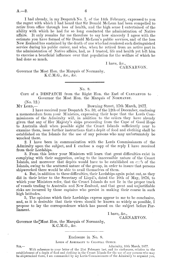 No. 8. Copy of a DESPATCH from the Right Hon. the Earl of Carnarvon to Governor the Most Hon. the Marquis of Normanby. (No. 12.) My Lord, — Downing Street, 17th March, 1877. I have received your Despatch No. 59, of the 12th of December, enclosing a memorandum from your Ministers, expressing their hope that the Lords Commissioners of the Admiralty will, in addition to the orders they have already given that any of Her Majesty's ships proceeding from the Cape of Good Hope to Australia shall when possible sight the Crozet Islands sufficiently near to examine them, issue further instructions that a depot of food and clothing shall be established on the Islands for the use of any persons who may unfortunately be wrecked there. 2. I have been in communication with the Lords Commissioners of the Admiralty upon the subject, and I enclose a copy of the reply I have received from their Lordships. 3. Erom this letter your Ministers will learn that great difficulties exist in complying with their suggestion, owing to the inaccessible nature of the Crozet Islands, and moreover that depots would have to be established on e"ch of the Islands, owing to the scattered nature of the group, in order to insure that persons shipwrecked there would be able to avail themselves of them. 4. But, in addition to these difficulties, their Lordships again point out, as they did in their letter to the Secretary of Lloyd's, dated the 10th of May, 1876, to which your Ministers refer, that the Crozet Islands do not lie in the proper track of vessels trading to Australia and New Zealand, and that great and unjustifiable risks are incurred by those captains who persist in making their course in such high latitudes. 5. The opinions which their Lordships express appear to me to be conclusive, and, as it is desirable that their views should, be known as widely as possible, I propose to lay the correspondence which has passed on the subject before Parliament. I have, &c., CARNARVON. Governor the^Most Hon. the Marquis of Normanby, K.C.M.G., &c.