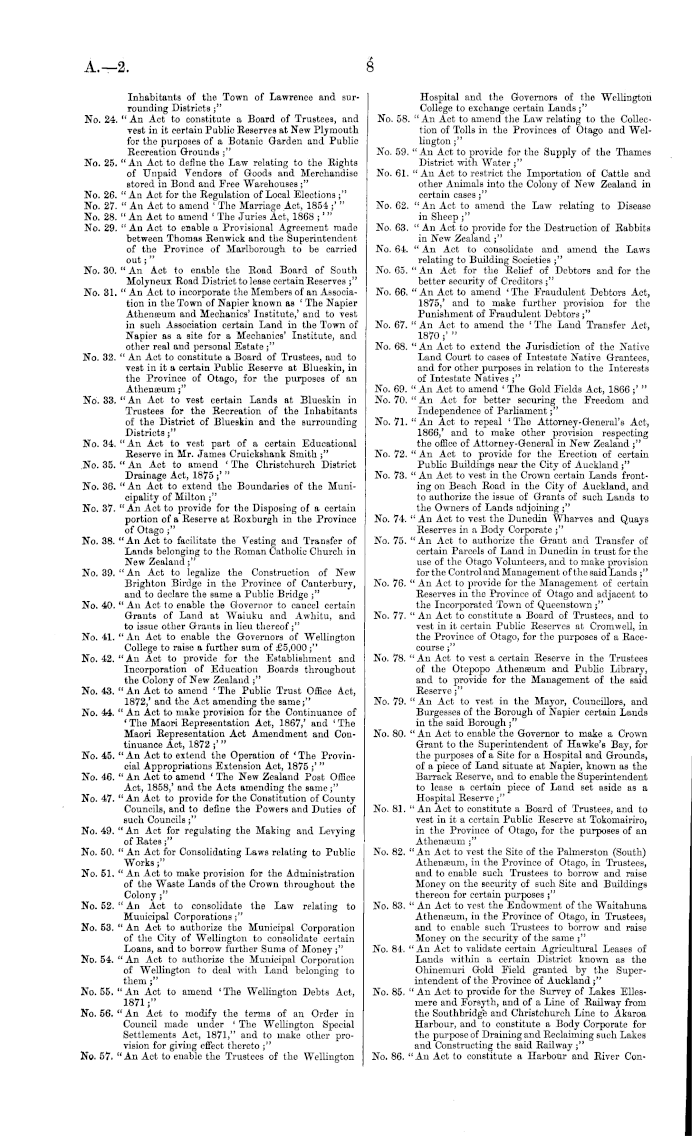 Inhabitants of the Town of Lawrence and sur- Hospital and the Governors of the Wellington rounding Districts ;" College to exchange certain Lands ;" No. 24. "An Act to constitute a Board of Trustees, and No. 58. "An Act to amend the Law relating to the Collecvest in it certain Public Reserves at New Plymouth tion of Tolls in the Provinces of Otago and Welfor the purposes of a Botanic Garden and Public lington j" Recreation Grounds ;" No. 59. " An Act to provide for the Supply of the Thames No. 25. " An Act to deflno the Law relating to the Rights District with Water ;" of Unpaid Vendors of Goods and Merchandise No. 61. "An Act to restrict the Importation of Cattle and stored in Bond and Eree Warehouses ;" other Animals into the Colony of New Zealand in No. 26. "An Act for the Regulation of Local Elections ;" certain cases j" No. 27. "An Act to amend ' The Marriage Act, 1854 ;'" No. 62. "An Act to amend the Law relating to Disease No. 28. " An Act to amend ' The Juries Act, 1868 ;'" in Sheep ;" No. 29. "An Act to enable a Provisional Agreement made No. 63. "An Act to provide for the Destruction of Rabbits between Thomas Renwick and the Superintendent in New Zealand ;" of the Province of Marlborough to be carried No. 64. "An Act to consolidate and amend the Laws out; " relating to Building Societies ;" No. 30. "An Act to enable the Road Board of South No. 65. "An Act for the Relief of Debtors and for the Molyneux Road District to lease certain Reserves ;" better security of Creditors ;" No. 31. "An Act to incorporate the Members of an Associa- No. 66. "An Act to amend 'The Fraudulent Debtors Act, tion in the Town of Napier known as ' The Napier 1875,' and to make further provision for the Athenseum and Mechanics' Institute,' and to vest Punishment of Fraudulent Debtors;" in such Association certain Land in the Town of No. 67. "An Act to amend the ' The Land Transfer Act, Napier as a site for a Mechanics' Institute, and 1870;' " other real and personal Estate;" No. 68. "An Act to extend the Jurisdiction of the Native No. 32. " An Act to constitute a Board of Trustees, aud to Land Court to cases of Intestate Native Grantees, vest in it a certain Public Reserve at Blueskin, in and for other purposes in relation lo the Interests the Province of Otago, for the purposes of an of Intestate Natives ;" Athenaeum ;" No. 69. " An Act to amend ' The Gold Fields Act, 1866 ;' " No. 33. "An Act to vest certain Lands at Blueskin in No. 70. "An Act for better securing the Freedom and Trustees for the Recreation of the Inhabitants Independence of Parliament;" of the District of Blueskin and the surrounding No. 71. "An Act to repeal ' The Attorney-General's Act, Districts;" 1866,' and to make other provision respecting No. 34. "An Act to vest part of a certain Educational the office of Attorney-General in New Zealand ;" Reserve in Mr. James Cruickshank Smith ;" No. 72. "An Act to provide for the Erection of certain No. 35. "An Act to amend ' The Christehurch District Public Buildings near the City of Auckland;" Drainage Act, 1875 ;' " No. 73. " An Act to vest in the Crown certain Lauds frontNo. 36. " An Act to extend the Boundaries of the Muni- ing on Beach Road in the City of Auckland, and cipality of Milton ;" to authorize the issue of Grants of such Lands to No. 37. "An Act to provide for the Disposing of a certain the Owners of Lands adjoining ;" portion of a Reserve at Roxburgh in the Province No. 74. "An Act to vest the Dunedin Wharves and Quays of Otago ;" Reserves in a Body Corporate ;" No. 38. "An Act to facilitate the Vesting and Transfer of No. 75. "An Act to authorize the Grant and Transfer of Lands belonging to the Roman Catholic Church in certain Parcels of Land in Dunedin in trust for the New Zealand ;" use of the Otago Volunteers, and to make provision No. 39. "An Act to legalize the Construction of New for the Control and Management of the said Lands;" Brighton Birdge in the Province of Canterbury, No. 76. "An Act to provide for the Management of certain and to declare the same a Public Bridge ;" Reserves in the Province of Otago and adjacent to No. 40. " An Act to enable the Governor to cancel certain the Incorporated Town of Queenstown ;" Grants of Land at Waiuku and Awhitu, and No. 77. "An Act to constitute a Board of Trustees, and to to issue other Grants in lieu thereof;" vest in it certain Public Reserves at Cromwell, in No. 41. "An Act to enable the Governors of Wellington the Province of Otago, for the purposes of a RaceCollege to raise a further sum of £5,000;" course;" No. 42. "An Act to provide for the Establishment and No. 78. "An Act to vest a certain Reserve in the Trustees Incorporation of Education Boards throughout of the Otepopo Athenseum and Public Library, the Colony of New Zealand;" and to provide for the Management of the said No. 43. "An Act to amend ' The Public Trust Office Act, Reserve ;" 1872,' and the Act amending the same;" No. 79. "An Act to vest in the Mayor, Councillors, and No. 44. " An Act to make provision for the Continuance of Burgesses of the Borough of Napier certain Lands 'The Maori Representation Act, 1867,' and 'The in the said Borough;" Maori Representation Act Amendment and Con- No. 80. "An Act to enable the Governor to make a Crown tinuanee Act, 1872 ;' " Grant to the Superintendent of Hawke's Bay, for No. 45. "An Act to extend the Operation of ' The Provin- the purposes of a Site for a Hospital and Grounds, cial Appropriations Extension Act, 1875 ;' " of a piece of Land situate at Napier, known as the No. 46. " An Act to amend ' The New Zealand Post Office Barrack Reserve, and to enable the Superintendent Act, 1858,' and the Acts amending the same;" to lease a certain piece of Land set aside as a No. 47. " An Act to provido for the Constitution of County Hospital Reserve;" Councils, and to define the Powers and Duties of No. 81. "An Act to constitute a Board of Trustees, and to such Councils;" vest in it a certain Public Reserve at Tokomairiro, 