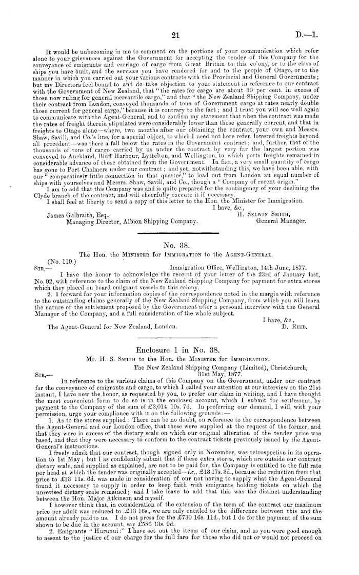 No. 37. The Hon. the Minister for Immigration to the Agent-General. (No. 117.) Sir, — Immigration Office, Wellington, 13th June, 1877. Eeferring to your letter No. 59, of the 12th January last, I have the honor to transmit, for your information, copy of a letter from Mr. Smith, General Manager of the New Zealand Shipping Company, covering copy of a letter which he addressed to Mr. Galbraith, Managing Director of the Albion Company, on the 3rd ultimo, respecting certain statements made by that gentleman with reference to the contract of the New Zealand Shipping Company for the conveyance of immigrants and cargo to this colony. I have, &c, The Agent-General for New Zealand, London. D. Eeid.
