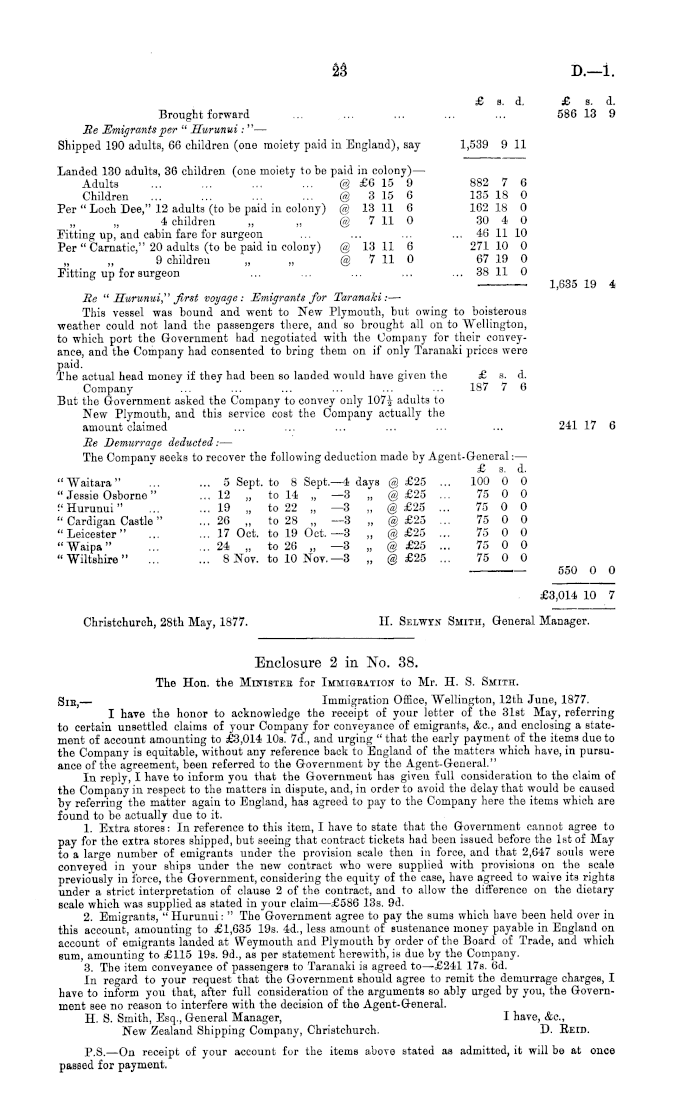 Enclosure 2 in No. 38. The Hon. the Minister for Immigration to Mr. H. S. Smith. Si E) — Immigration Office, Wellington, 12th June, 1877. I have the honor to acknowledge the receipt of your letter of the 31st May, referring to certain unsettled claims of your Company for conveyance of emigrants, &c, and enclosing a statement of account amounting to £3,014 10s. 7d., and urging " that the early payment of the items due to the Company is equitable, without any reference back to England of the matters which have, in pursuance of the agreement, been referred to the Government by the Agent-General." In reply, I have to inform you that the Government has given full consideration to the claim of the Company in respect to the matters in dispute, and, in order to avoid the delay that would be caused by referring the matter again to England, has agreed to pay to the Company here the items which are found to be actually due to it. 1. Extra stores: In reference to this item, I have to state that the Government cannot agree to pay for the extra stores shipped, but seeing that contract tickets had been issued before the Ist of May to a large number of emigrants under the provision scale then in force, and that 2,647 souls were conveyed in your ships under the new contract who were supplied with provisions on the scale previously in force, the Government, considering the equity of the case, have agreed to waive its rights under a strict interpretation of clause 2 of the contract, and to allow the difference on the dietary scale which was supplied as stated in your claim —£586 13s. 9d. 2. Emigrants, " Hurunui: " The Government agree to pay the sums which have been held over iv this account, amounting to £1,635 19s. 4d., less amount of sustenance money payable in England on account of emigrants landed at Weymouth and Plymouth by order of the Board of Trade, and which sum, amounting to £115 19s. 9d., as per statement herewith, is due by the Company. 3. The item conveyance of passengers to Taranaki is agreed to —£241 17s. 6d. In regard to your request that the Government should agree to remit the demurrage charges, I have to inform you that, after full consideration of the arguments so ably urged by you, the Government see no reason to interfere with the decision of the Agent-General. H. S. Smith, Esq., General Manager, I have, &c, New Zealand Shipping Company, Christchurch. D. Eeid. P.S.—On receipt of your account for the items above stated as admitted, it will be at once passed for payment.