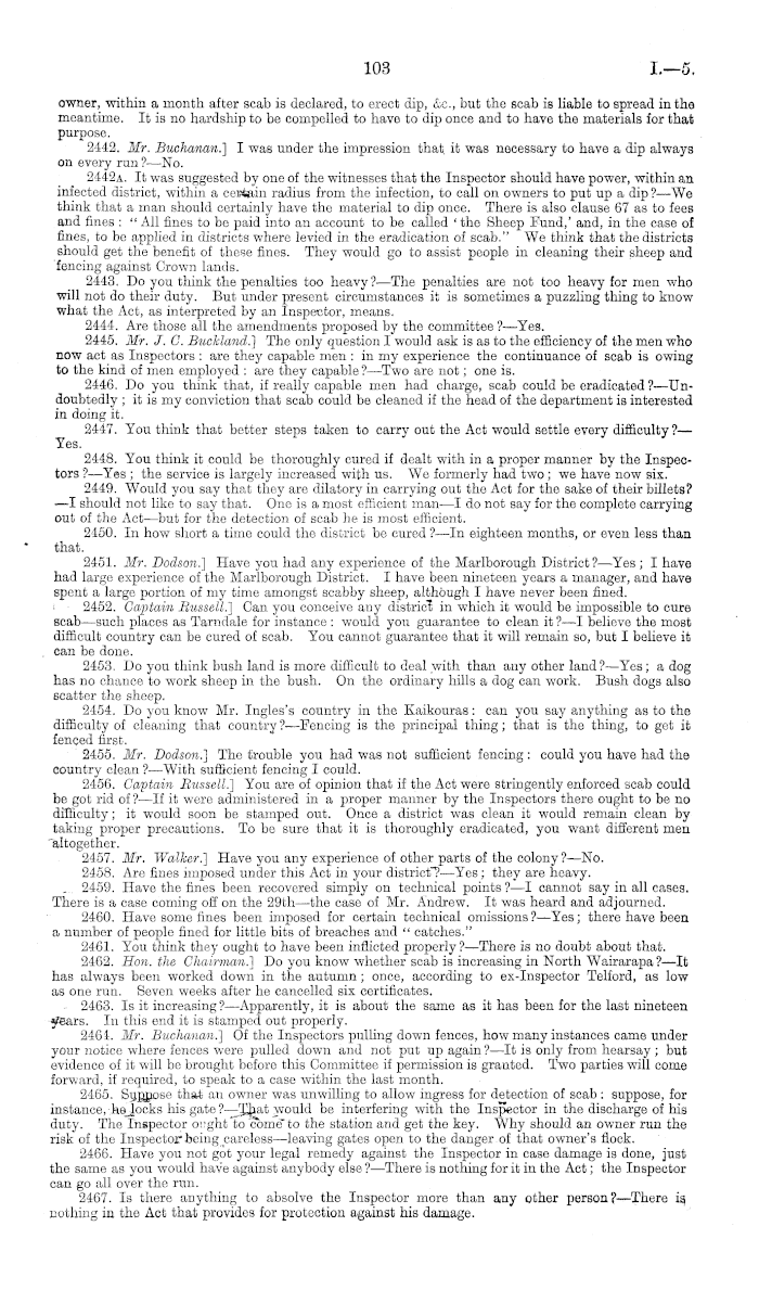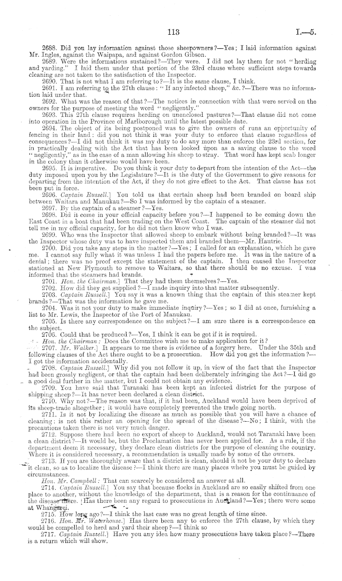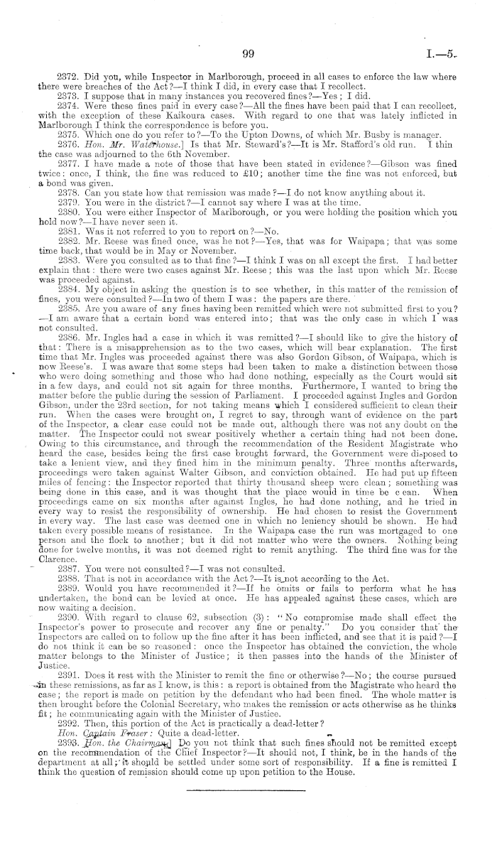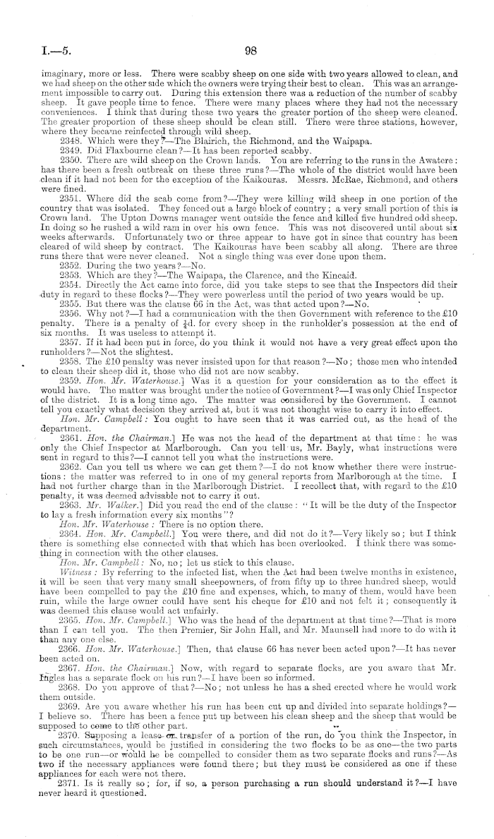510. Are you not aware of the 66th clause of the Act, which states that it shall be the duty of the Inspector to lay a fresh information [reads] ?—I take it there is a dispensing power; they need not do certain things unless they like. 511. Have you considered the 66th clause : that there is no option to the Inspector. He is bound to lay an information, and, if he does not, he is violating his duty ? —The Besident Magistrate comes from another district; but it is quite uncertain when he comes. My last conviction was on the 10th December. I think the information was laid on the 14th August, but I cannot be certain as to the day. 512. How many informations were laid against you?— Three. 513. Are you of opinion that they lay the informations regularly, according to the provisions of the Act ?—Yes; as near to six months as they can. Mr. Dodson: There have been two amendments: one, I think, for twelve, and the other for nine months. 514. Hon. Mr. Waterhouse.) Are penalties remitted as a matter of course ?—No; the second was inflicted on me. 515. Are there many cases in the Province of Marlborough of the penalties being enforced ? — No; I think in Gibson's and in two or three other cases the fines were not enforced. 516. Hon. the Chairman!) Have you any other remarks as to the w-orking of the Act?—l think generally the Sheep Act is against justice. In English law a penal Act is to be construed in favour of the defendant; here it is in favour of the plaintiff. I cannot see why, when it is shown that a man is doing his best, that you should take money from him, and put it into the consolidated revenue. I think the least you might do is to leave it in the district. 517. Hon. Mr. Waterhouse.) You stated in the letter you read that there were two watergates crossing the river ?—These are two of the difficulties. 518. Hon. the Chairman.) Could not something be done by fencing off?— No. 519. What is the objection ?—A cliff. 520. Could you not carry your fence to the top ? —No. 521. You were saying, with regard to the 23rd section, that you thought it hard to inflict a fine when a person was doing his best: do you not think that a great many persons profess to be doing their best when they are not doing so?— The Inspector ought to know. He should have the knowledge of persons who do their best. My experience of them is that they have seldom any knowledge on the subject.