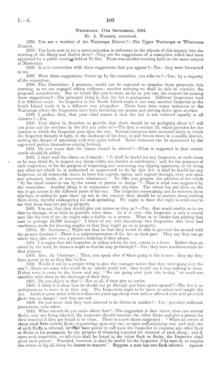 Wednesday, 17th Septembee, 1884. Mr. A. Walkeb, examined. 532. Hon. the Chairman.) Is there an inquiry prayed for in your district into the working of the Babbit Act ?—Yes; I am an aggrieved party under the present working of the Babbit Act. 533. You are managing a run?— Yes. 534. On the run you are managing is there a large number of rabbits? —We have poisoned heavily; there has been a great number. There was before I took charge. The company do all