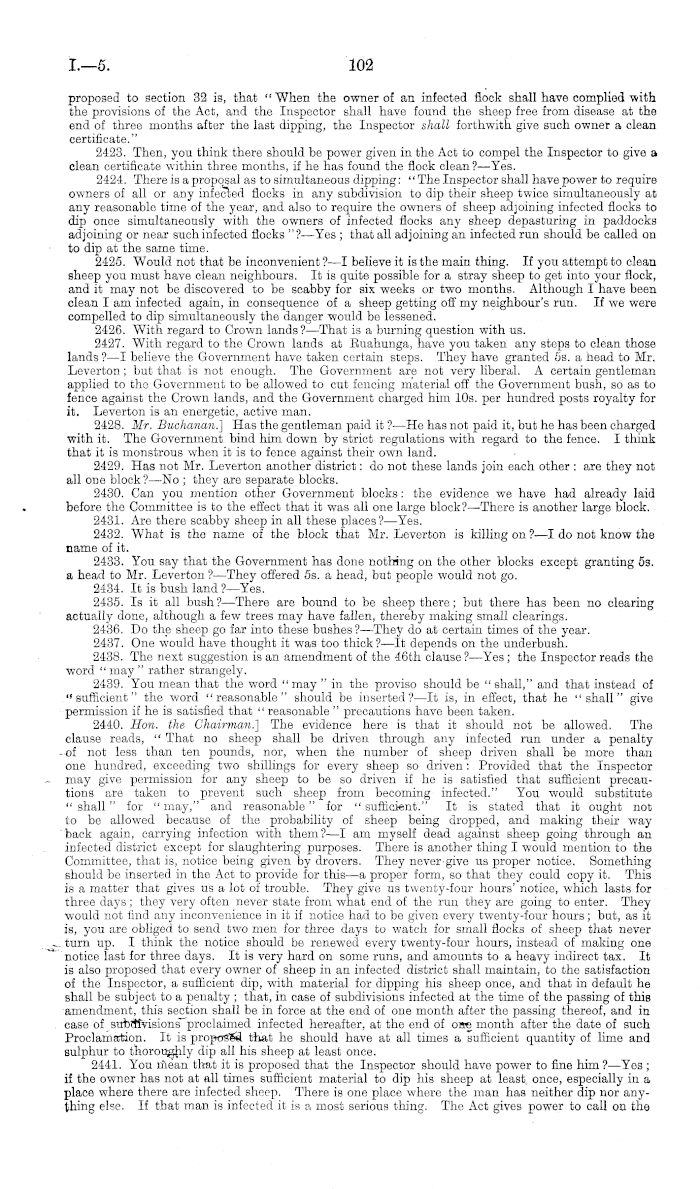 97. Hon. the Chairman.] Mr. Gibson's lease extends over the whole, so that when he drives his sheep to be shorn he does not take the sheep off his run ?—They are on his own run from the beginning to the end. But, as these were three distinct flocks, it occurred to me whether there was anything in the Act under which they might be regarded as separate runs, and treat them as such, So as to prevent sheep from being driven from one to the other. Hon. Mr. Waterhouse : They are returned as one run. 98. Hon. the Chairman.] The reserve was to provide for the shearing of the flocks of several runholders ?—lt was intended for any one who liked to use it. 99. I was about to ask how it passed into Mr. Gibson's hands ? —Mr. Gibson was the only person using it, and he offered to pay rent for it. 100. The Government accepted his offer and gave him a lease of it ?—Yes. 101. Hon. Mr. Waterhouse.) Are you aware that after the expiration of next year it will not be legal for him to run the rams among the ewes when scab is proved to exist ? The Inspector will have no discretion. When the flock is infected it will be imperative to separate the rams from the ewes, with a penalty for each ram that is not kept separate. Will not the effect of that be to ruin sheep-farmers unless they take provision for fencing in their land ? —lt will be so in many instances. I am informed that many sheep-farmers have not the means to fence, and they must submit to be ruined. 102. Are individual interests to be considered in preference to public interests when individual interests threaten to inflict on the public serious loss ?—I am not prepared to answer that. 103. Is it not within your knowledge that, if the numbers of flocks are curtailed, it is in every person's power to get rid of scab ? In the case of Mr. Gibson, has he not increased his flock from 24,000 to 43,000 ?—I believe so. 104. Is it possible that he can so readily keep clean 43,000 as 24,000: by increasing his flock he has increased his difficulty in cleansing them ?—The danger which these flocks constitute to the neighbourhood is undoubted. 105. Hon. Sir. G. S. Whitmore.) Is it the case that some Sheep Inspectors in that part of the country have made arrangements with some persons to take their bond, allowing them to spend the money represented by that bond in cleaning their sheep ?—That is an arrangement not with the Inspector but with the Government, after the Inspector has prosecuted and obtained a conviction. When the conviction is obtained, the Inspector has nothing more to do with the case. 106. You are not aware under what law that is done ?—I believe it is under the Governor in Council. 107. Has the Governor in Council power to give a man money for the purpose of cleaning his flocks ?—I believe the Governor in Council has power to do anything he likes. 108. Hon. the Chairman.) Have you any other remarks to make as to the working of the Act ?—No. 109. Mr. Buchanan.) I would like to ascertain the general opinion of Mr. Wood on this point: whether the greatest bar to cleaning sheep is the want of capital *. that relates to what is to be done or what ought to be done to get rid of scab ?—I hardly know how to answer that question; because I have been told by one of Mr. Gibson's overseers that he has plenty of capital at his back, and that he intends to carry out the arrangement so far as his run is concerned. But I think that is the great difficulty at the present time; it is the great difficulty in most cases. 110. Then, your general answer would be " Yes;" that the want of capital is the greatest bar to getting rid of scab ? —Yes. 111. Hon. Mr. Nurse.) Do you think that any great public injury would be inflicted if these shearing sheds were abolished, or resumed and sold by the Government ?—-I think that at the present time, although called a shearing reserve, it is the property of Mr. Gibson. The Government could not, therefore, at present resume and sell it. It is used now, but Mr. Gibson rents the land, and although used it is not now a reserve for shearing purposes. 112. Then you think it is not open to any one to shear there ? —I think not. 113. Hon. the Ghairmani] In dipping, do owners use various kinds of dip, or do they generally use the same dip ? —I think the rule is to use lime and sulphur. 114. Does the Inspector direct what kind is to be used ?—I do not think he does. lam not sure. We have always used lime and sulphur, and that has been approved. 115. Are you aware of any case where other material has been used, and the owner having failed to clean his sheep expressed an opinion that the Inspector had ordered him to use that other material ? —I do not know of it. 116. Do you think that the Act should prescribe a dip for scab?—l do think it is necessary. 117. What do you consider the best dip ? —Lime and sulphur. 118. Experienced persons would use that dip ?—Yes ; it is always used in our neighbourhood ; it is considered the best. There might be some improvement upon it, but lam not aware of any.