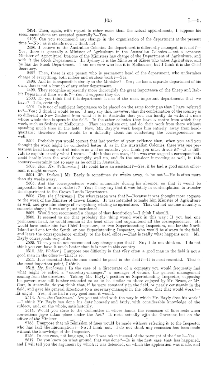 618. Have you sent a circular as to the best methods which he should adopt ? —Yes; I sent a circular. [Circular put in.] 619. Hon. Captain Fraser.) Was that the last ?—No, there was a subsequent one. 620. Was that sent to the agents ?—We do not know tho agents. 621. Hon. the Chairman.) You say that the Inspectors are responsible for the agents?— Yes. 622. Mr. Dodson.) But you sent a copy of that document to each Inspector?— Yes. 623. Hon. the Chairman!) Apparently, in these instructions there is no reference to the point alluded to; that is, as to the power of the Inspector to compel an owner to adopt a certain course ? —It has never been held that such should be done ; but the Inspector might do a good deal by recommending from his own experience certain things to be done. 624. Would you leave him discretion ?—He has to see that rabbits are kept down: it does not matter to the department what steps are takon. If rabbits are found on a place notice is sent to the owner. 625. That he must kill ?—Yes. 626. After that if they are found, and that, in the opinion of the Inspectors, sufficient means havo not been taken to clear them, the owner is summoned and fined. It would appear from that that the " opinion of the Inspector " has to guide the course to be adopted?—He must give information as to how it should be done, if ha knows. I know of no instance where that course has been taken in which any difficulty occurred: it is only where sufficient steps havo not been taken. 627. You leave the Inspectors to act upon the results of the steps that have been taken?— Yes. 628. But where the owner had killed a great number, not only on his own land, but coining from infested land adjoining, the results would not be shown ?—-There it would be the duty of the Inspector to proceed against that person. He could not adjudicate himself ;ho would leave it to the Bench to decide whether it was a serious breach of the Act or otherwise. 629. My object in asking the question is that some of the witnesses in their evidence have complained that the Inspector ordered them to put down the pest with rabbiters and dogs ?—lf the Inspector ordered that I hold that he decidedly made a mistake. 630. Mr. Dodson!) What is that ?—lf the Inspector gave a distinct order for that he exceeded his authority. 631. Hon. the Chairman.) Do you examine the diaries ? —lnvariably. 631 a. Then you would sco whether the order was given or not ?—Yes. Mr. Walker : We have had before us a witness who spoke to a prosecution and conviction in his own case, because he refused to put on rabbiters. Hon. the Chairman : What case was that ? Mr. Walker : Mr. Bell's case. There it was stated the officer ordered him to do certain things which were against his (Mr. Bell's) judgment. Mr. Dodson : He said it was against what he (Mf. Bell) thought the proper means, and as a consequence that he (Mr. Bell) gave up ferrets. 632. Mr. Walker!) Could you produce that Inspector's diary?— Yes; you can every one in the service if it is required. 633. Mr. Dodson!) When : within what time ?—Within a quarter of an hour. 634. Hon. Captain Fraser.) How often do they send in their diaries? —Every month. 635. Hon. the Chairman.) Mr. Bell's evidence was in effect that the order to put on rabbiters caused the loss of all the money that had been expended upon turning out the ferrets, which were killed by traps and dogs ?—Here are papers connected with Mr. Bell's case. 636. Was it brought under your notice ?—Not in the way it is put. I received several communications ; one a very long letter from Mr. Bell in respect to which a gentleman was appointed to make inquiries; in another case, the Besident Magistrate was requested to furnish particulars; in another case, the Chief Inspector was sent to inquire : none of their decisions—for what reason I do not know—were favourable to Mr. Bell. 637. Mr. Dodson.) But these probably were concerned in the convictions?— None of the inquirers blamed the department. 638. But the real question is whether Mr. Bell ever received instructions from the Inspector to employ dogs. He said he did, and the consequence was that the ferrets were killed by the traps and dogs?— That, as a formal complaint, never reached -me. I was aware of a petition with a copy of a letter attached to the petition from Mr. Corbet and others. 639. Mr. Buchanan.] I think it an instructive question to put to Mr. Bayly whether, having so many complaints coming before him as Superintendent Inspector, he visited the locality and inquired into the circumstances, so forming his judgment on the spot ?—I went once for the purpose mentioned; I next went at the instigation of people who complained of the state that Mr. Bell's country was in. I think Mr. J. McKenzie, M.H.8., Waihemo, knows more about that affair than any one else. 640. Hon the Chairman. —-Not the gentleman who is on this Committee? —No. 641. His name was mentioned as offering evidence?— Yes ; I made inquiries and rode over the whole of that—or rather over the greater part; it was overrun then; in some places very thickly. 642. If such an order were given would it have issued from you?—lt would have issued from the Inspector. 643. Not from an agent ? —Certainly not: he has no power to give an order at all; he has no power whatever; he has nothing to do with it at all; he has no right to interfere. 644. As to the.lnspectors, are they in every case Inspectors under the Sheep Act as well?— They are —that is, the Inspectors. 615. The districts being counties?— Yes. 646. Are you satisfied with these Inspectors: are they persons that you can trust with the powers which they appear to exercise under the Act; are they fitted for their duties ?—I am satisfied with them as a body. They are not all perfect; but, as a body, lam satisfied with them-