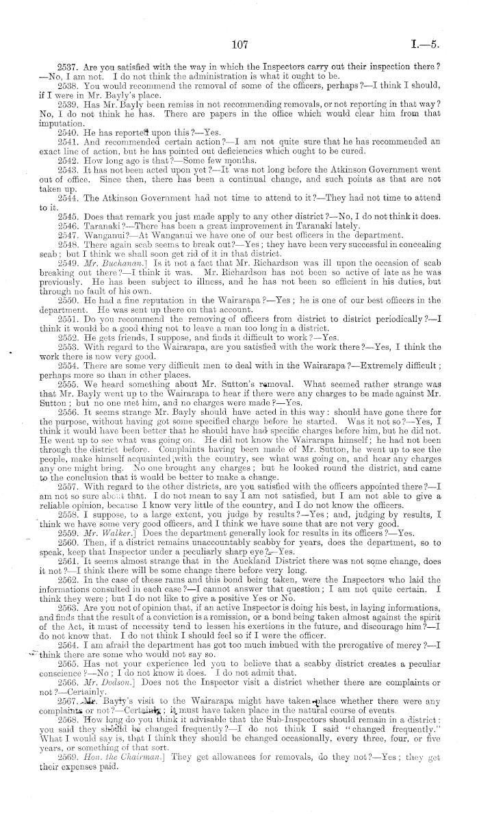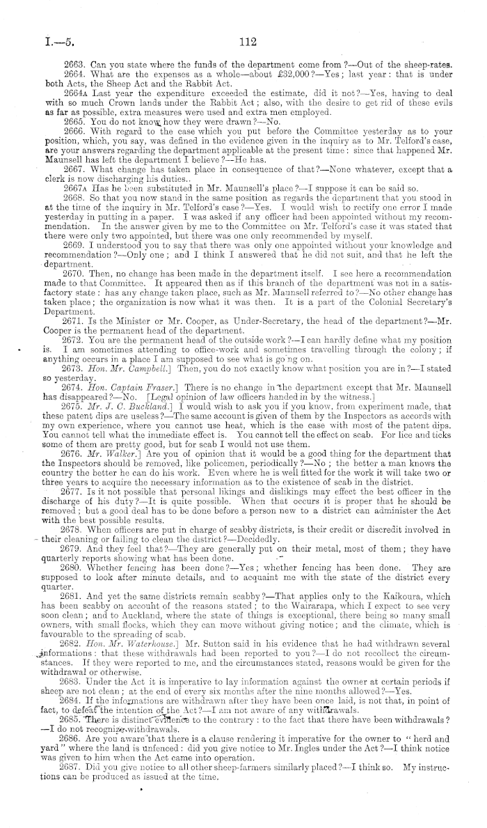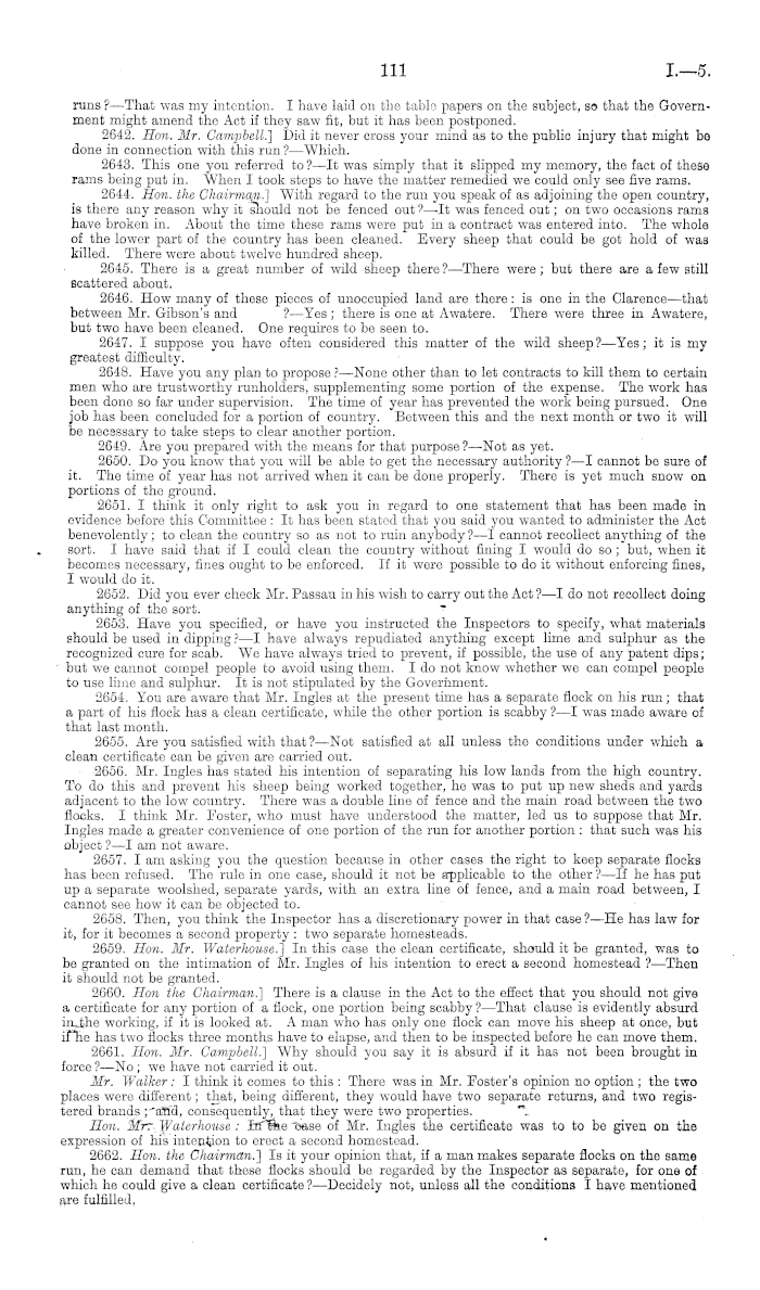 Feidat, 12th Septembee, 1834. Mr. Walteb Gibson, examined. 119. Hon. the Chairman.] I would ask you, first, some questions in regard to the working of the Sheep Act. You are the lessee of a sheep-run in the Province &i Marlborough?—Yes, in the Kaikouras, in the Provincial.District of Marlborough. The Warden, Tytler, and Jam are the names of these runs. 120. Is there scab on that run?— There is a little; there are three runs that are joined and worked together. 121. You say "a little." Have they been scabby long?—-When first stocked the country •2—l. 5.