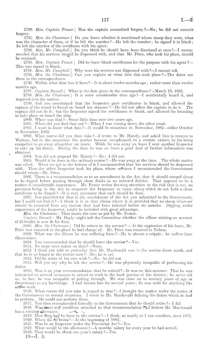 Feidat, 12th Septembee, 1834. Mr. Walteb Gibson, examined. 119. Hon. the Chairman.] I would ask you, first, some questions in regard to the working of the Sheep Act. You are the lessee of a sheep-run in the Province &i Marlborough?—Yes, in the Kaikouras, in the Provincial.District of Marlborough. The Warden, Tytler, and Jam are the names of these runs. 120. Is there scab on that run?— There is a little; there are three runs that are joined and worked together. 121. You say "a little." Have they been scabby long?—-When first stocked the country •2—l. 5.