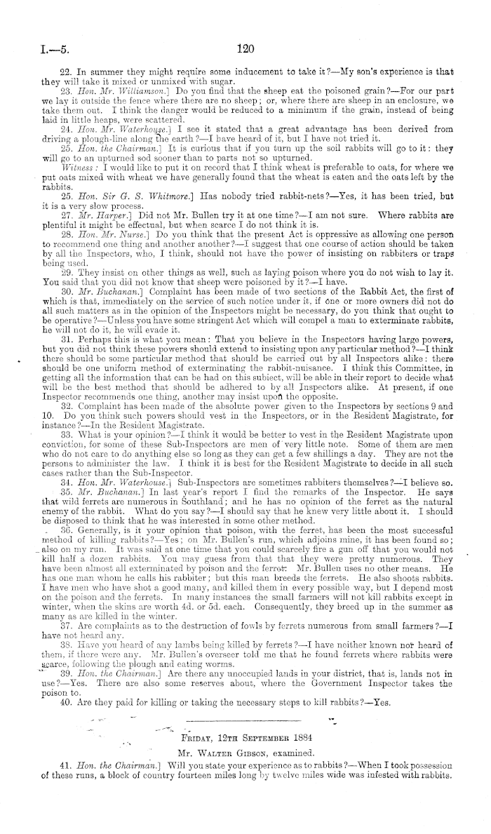 Wednesday, 17th Septembee, 1884. Mr. A. Walkeb, examined. 532. Hon. the Chairman.) Is there an inquiry prayed for in your district into the working of the Babbit Act ?—Yes; I am an aggrieved party under the present working of the Babbit Act. 533. You are managing a run?— Yes. 534. On the run you are managing is there a large number of rabbits? —We have poisoned heavily; there has been a great number. There was before I took charge. The company do all