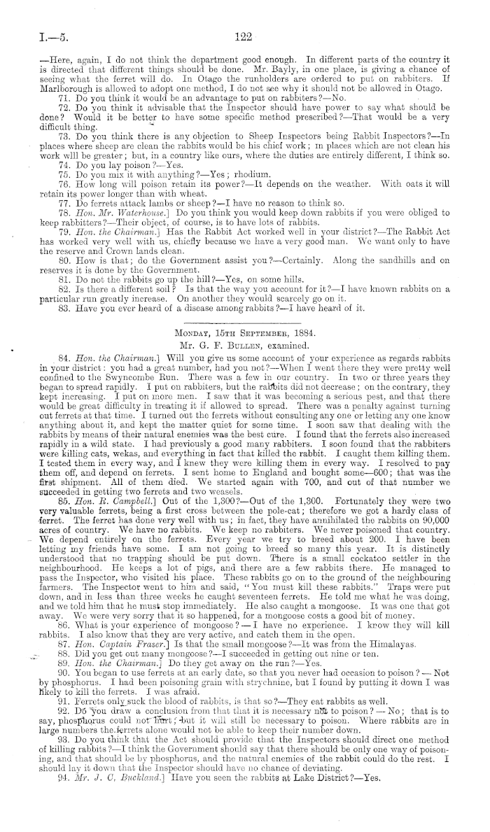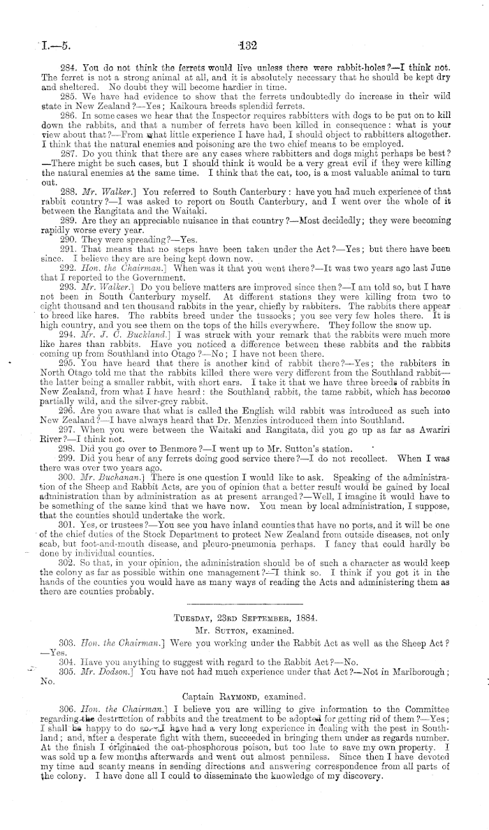 Tuesday, 23ed Septembee, 1884. Mr. Sutton, examined. 303. Hon. the Chairman.) Were you working under the Rabbit Act as well as the Sheep Act ? —Yes. 304. Have you anything to suggest with regard to the Rabbit Act ? —No. 305. Mr. Dodson.) You have not had much experience under that Act ?—Not in Marlborough; No. Captain Raymond, examined. 306. Hon. the Chairman.] I believe you are willing to give information to the Committee regarding the destruction of rabbits and the treatment to be adopted for getting rid of them ? —Yes; I shall be happy to do so. I have had a very long experience in dealing with the pest in Southland ; and, after a desperate fight with them, succeeded in bringing them under as regards number. At the finish I originated the oat-phosphorous poison, but too late to save my own property. I was sold up a few months afterwards and went out almost penniless. Since then I have devoted my time and scanty means in sending directions and answering correspondence from all parts of the colony. I have done all I could to disseminate the knowledge of my discovery.