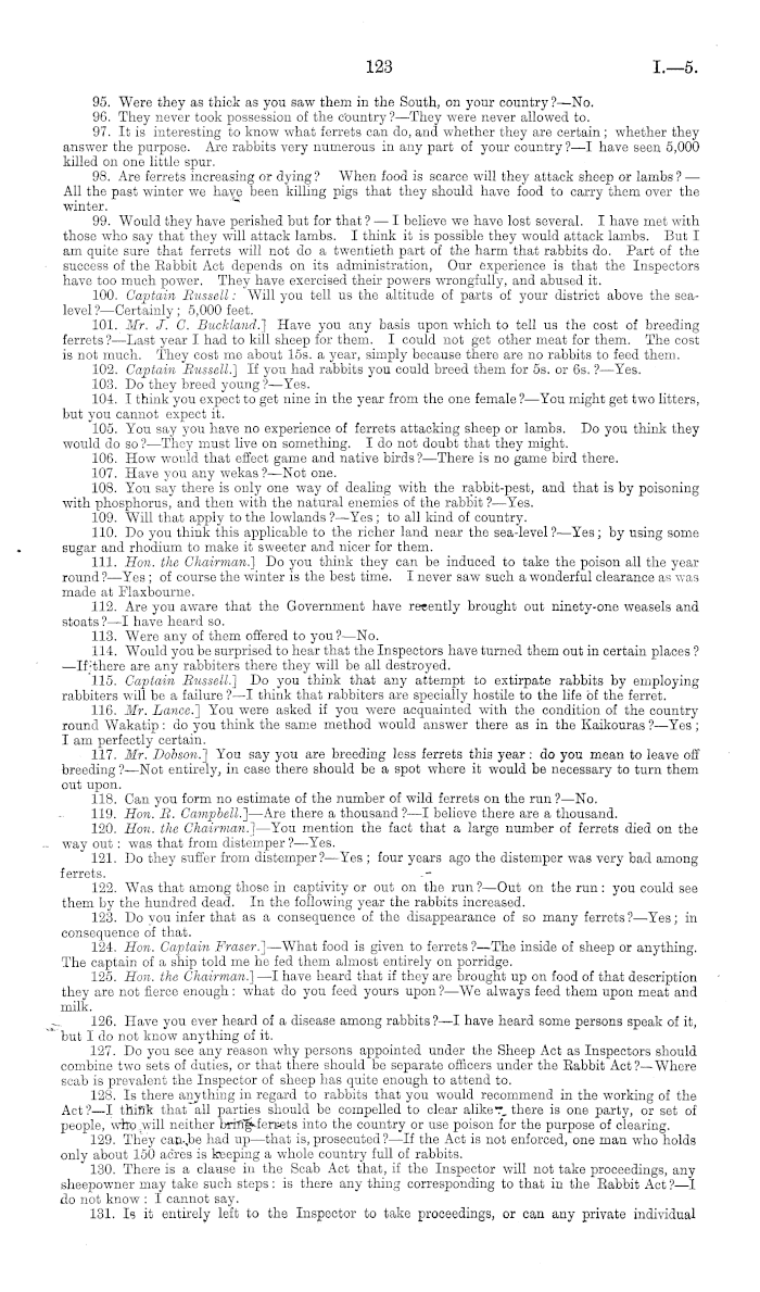 95. Were they as thick as you saw them in the South, on your country?— No. 96. They never took possession of the country ? —They were never allowed to. 97. It is interesting to know what ferrets can do, and whether they are certain; whether they answer the purpose. Are rabbits very numerous in any part of your country ?—-I have seen 5,000 killed on one little spur. 98. Are ferrets increasing or dying ? When food is scarce will they attack sheep or lambs ? — All the past winter we have been killing pigs that they should have food to carry them over the winter. 99. Would they have perished but for that ?— I believe we have lost several. I have mot with those who say that they will attack lambs. I think it is possible they would attack lambs. But I am quite sure that ferrets will not do a twentieth part of the harm that rabbits do. Part of the success of the Rabbit Act depends on its administration, Our experience is that the Inspectors have too much power. They have exercised their powers wrongfully, and abused it. 100. Captain Bussed: Will you tell us the altitude of parts of your district above the sealevel ?—Certainly; 5,000 feet. 101. Mr. J. G. Buckland.) Have you any basis upon which to tell us the cost of breeding ferrets ? —Last year I had to kill sheep for them. I could not get other meat for them. The cost is not much. They cost me about 15s. a year, simply because there are no rabbits to feed them. 102. Captain Bussed.) If you had rabbits you could breed them for ss. or 6s. ?—Yes. 103. Do they breed young ? —Yes. 104. I think you expect to get nine in the year from the one female ?—You might get two litters, but you cannot expect it. 105. You say you have no experience of ferrets attacking sheep or lambs. Do you think they would do so ?—They must live on something. Ido not doubt that they might. 106. How would that effect game and native birds?— There is no game bird there. 107. Have you any wekas?—Not one. 108. You say there is only one way of dealing with the rabbit-pest, and that is by poisoning with phosphorus, and then with the natural enemies of the rabbit ? —Yes. 109. Will that apply to the lowlands ?—Yes ; to all kind of country. 110. Do you think this applicable to the richer land near the sea-level ?—Yes; by using some sugar and rhodium to make it sweeter and nicer for them. 111. Hon. the Chairman!) Do you think they can be induced to take the poison all the year round?— Yes ; of course the winter is the best time. I never saw such a wonderful clearance as was made at Flaxbourne. 112. Are you aware that the Government have recently brought out ninety-one weasels and stoats?—l have heard so. 113. Were any of them offered to you?— No. 114. Would you be surprised to hear that the Inspectors have turned them out in certain places ? —If*there are any rabbiters there they will be all destroyed. 115. Captain Bussed.) Do you think that any attempt to extirpate rabbits by employing rabbiters will be a failure ?—I think that rabbiters are specially hostile to the life of the ferret. 116. Mr. Lance.) You were asked if you were acquainted with the condition of the country round Wakatip : do you think the same method would answer there as in the Kaikouras ?—Yes ; I am perfectly certain. 117. Mr. Dobson!) You say you are breeding less ferrets this year: do you mean to leave off breeding ?—Not entirely, in case there should be a spot where it would be necessary to turn them out upon. 118. Can you form no estimate of the number of wild ferrets on the run ?—No. 119. Hon. B. Campbell!) —Are there a thousand ?—I believe there are a thousand. 120. Hon. the Chairman.) —You mention the fact that a large number of ferrets died on the way out: was that from distemper ? —Yes. 121. Do they suffer from distemper?— Yes ; four years ago the distemper was very bad among ferrets. 122. Was that among those in captivity or out on the run ?—Out on the run : you could see them by the hundred dead. In the following year the rabbits increased. 123. Do you infer that as a consequence of the disappearance of so many ferrets ?—Yes; in consequence of that. 124. Hon. Captain Eraser!) —What food is given to ferrets?— The inside of sheep or anything. The captain of a ship told me ho fed them almost entirely on porridge. 125. Hon. the Chairman.) —I have heard that if they are brought up on food of that description they are not fierce enough : what do you feed yours upon ?—We always feed them upon meat and milk. 126. Have you ever heard of a disease among rabbits?—l have heard some persons speak of it, but I do not know anything of it. 127. Do you see any reason why persons appointed under the Sheep Act as Inspectors should combine two sets of duties, or that there should be separate officers under the Rabbit Act ?—Where scab is prevalent the Inspector of sheep has quite enough to attend to. 128. Is there anything in regard to rabbits that you would recommend in the working of the Act?—l think thatall parties should be compelled to clear alike -"•_ there is one party, or set of people, who will neither brilig^ferrets into the country or use poison for the purpose of clearing. 129. They can.be had vp —that is, prosecuted ? —lf the Act is not enforced, one man who holds only about 150 acres is keeping a whole country full of rabbits. 130. There is a clause in the Scab Act that, if the Inspector will not take proceedings, any sheepowner may take such steps : is there any thing corresponding to that in the Rabbit Act ? —I do not know : I cannot say. 131. Is it entirely left to the Inspector to take proceedings, or can any private individual