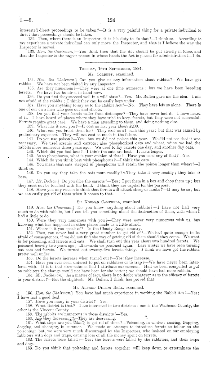 Tuesday, 16th Septembee, 1884. Mr. Coebett, examined. 134. Hon. the Chairman!) Can you give us any information about rabbits? —We have got rabbits. We have not been visited by any Inspector. 135. Are they numerous ?—They were at one time numerous; but we have been breeding ferrets. We have two hundred in hand now. 136. Do you find they succeed well in a wild state ?—Yes. Mr. Bullen gave me the idea. lam not afraid of the rabbits ; I think they can be easily kept under. 137. Have you anything to say as to the Babbit Act ?—No. They have left us alone. There is one of our own men who goes out and shoots. 138. Do you find your ferrets suffer from distemper? —They have never had it. I have heard of it. I have heard of places where they have tried to keep ferrets, but they were not successful. Ferrets require great care. We have a man attending to them, and doing nothing else. 139. What has it cost you ?—lt cost us last year about £200. 140. What can you breed them for ?—They cost us £1 each this year; but that was caused by preliminary expenses. They will not cost so much in the future. 141. Do you use poison ? —Yes; but we did not poison this year. We did not see that it was necessary. We used arsenic and carrots; also phosphorized oats and wheat, when we had the rabbits more numerous three years ago. We used to lay carrots one day, and another day oats. 142. Which did you find best? —I think the oats are best. It lasts longer. 143. As to phosphorus, what is your opinion of that? Have you used any of that?— Yes. 144. Which do you think best with phosphorus ?—I think the oats. 145. You mean that oats steeped in phosphorus will retain the poison longer than wheat ?—I think so. 146. Do you say they take the oats more readily ?-**-They take it very readily ; they take it best. 147. Mr. Dodson.) Do you slice the carrots ?—Yes; I put them in a box and chop them up; but they must not be touched with the hand. I think they are capital for the purpose. 148. Have you any reason to think that ferrets will attack sheep or lambs ?—lt may be so ; but we can easily get rid of them when it comes to that. Sir Noeman Campbell, examined. 149. Hon. the Chairman.) Do you know anything about rabbits?—l have not had very much to do with rabbits, but I can tell you something about the destruction of them, with which I had a little to do. 150. Were they very numerous with you? —They were never very numerous with us, but knowing what has happened in other places made us a little afraid. 151. Where is it you speak of ?—ln the Cloudy Bange country. — 152. Then, you never had a very great number to get rid of?—We had quite enough to be afraid of consequences, if we did not find the way of getting rid of them should they come. We went in for poisoning, and ferrets and cats. We shall turn out this year about two hundred ferrets. We poisoned heavily two years ago ; afterwards we poisoned again. Last winter we have been turning out cats and ferrets. We turned out twenty-five ferrets lately. I think we have got the rabbits pretty well under. 153. Do the ferrets increase when turned out ? —Yes, they increase. 154. Have you ever been ordered to put on rabbiters or to trap ? —We have never been interfered with. It is to that circumstance that I attribute our success. Had we been compelled to put on rabbiters the change would not have been for the better; we should have had more rabbits. 155.' Mr. Buchanan.) As a matter of fact, there is no doubt whatever as to the efficacy of ferrets in your district ? —Not the slightest. Mr. Bullen, I think, has proved that. Mr. Alfeed Dillon Bell, examined. 156. Hon. the Chairman!) You have had much experience in working the Babbit Act?— Yes; I have had a good deal. 157. Have you many in your district ?—Yes. 158. What district is that ? —I am interested in two districts ; one is the Waihemo County, the other is tho Vincent County. 159. Thejabbits are numerous in those districts ? —Yes. 160. Are they decreasing?— They are decreasing. 161. What steps are you taking* to get rid of them?— Poisoning, in winter: snaring, trapping, dogging, and shooting, in summer. We made an attempt to introduce ferrets to follow on the poisoning; but, we were very much discouraged by the Inspectors, who insisted on our employing rabbiters with dogs and traps, causing loss of all the money spent on ferrets. 162. The ferrets were killed?— Yes; the ferrets were killed by the rabbiters, and their traps and dogs. 163. Do you think that poisoning and ferrets together will keep down or exterminate the