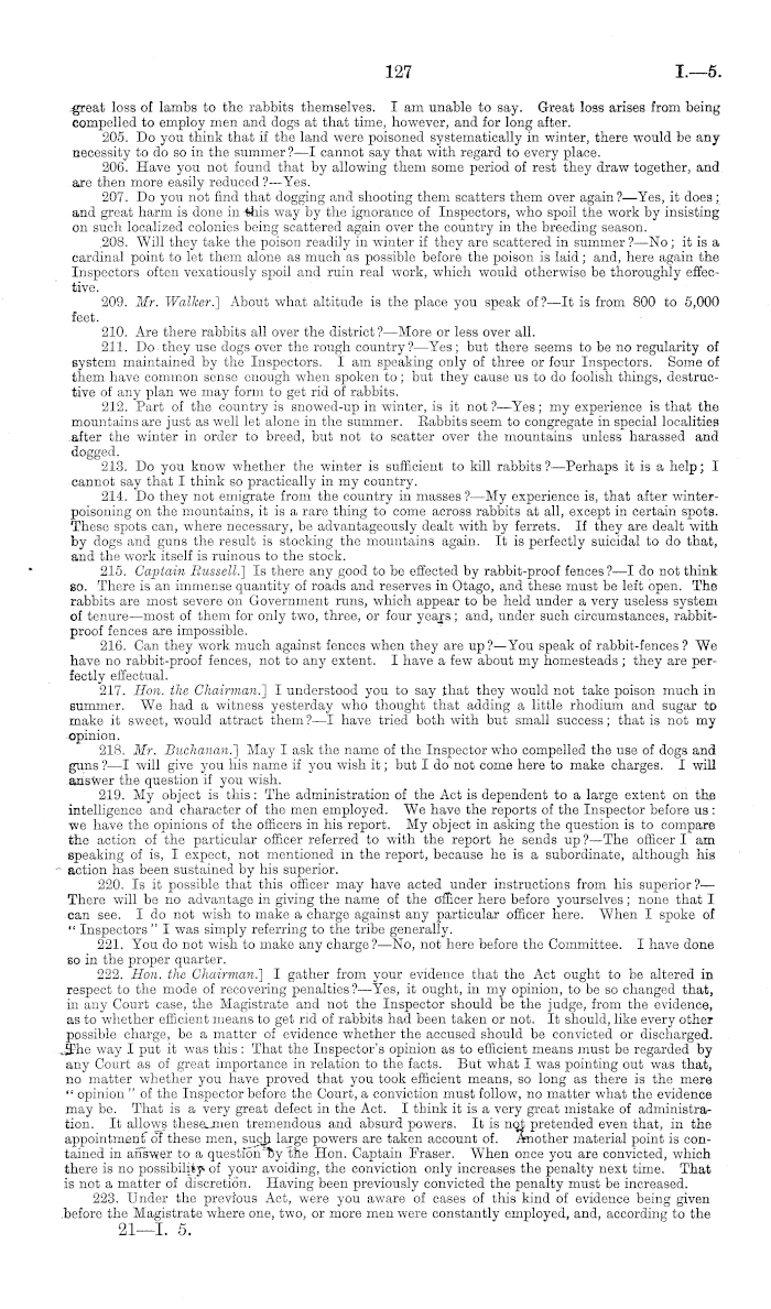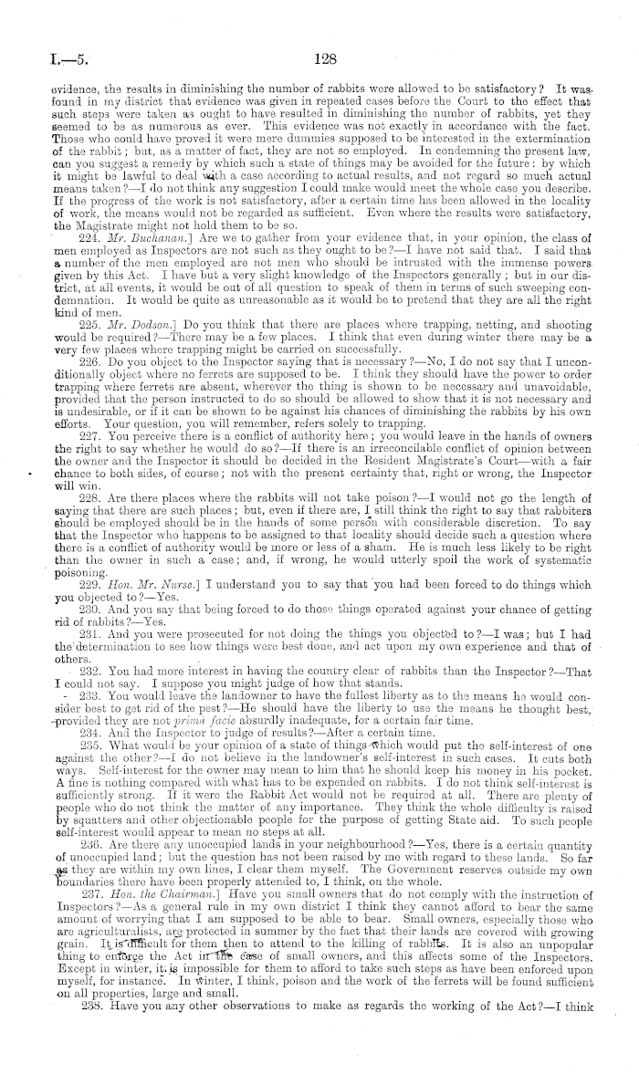 evidence, the results in diminishing the number of rabbits were allowed to be satisfactory ? It was found in my district that evidence was given in repeated cases before the Court to the effect that such steps were taken as ought to have resulted in diminishing the number of rabbits, yet they seemed to be as numerous as ever. This evidence was not exactly in accordance with the fact. Those who could have proved it were mere dummies supposed to be interested in the extermination of the rabbit; but, as a matter of fact, they are not so employed. In condemning the present law, can you suggest a remedy by which such a state of things may be avoided for the future: by which it might be lawful to deal with a case according to actual results, and not regard so much actual means taken ? —I do not think any suggestion I could make would meet the whole case you describe. If the progress of the work is not satisfactory, after a certain time has been allowed in the locality of work, the means would not be regarded as sufficient. Even where the results were satisfactory, the Magistrate might not hold them to be so. 224. Mr. Buchanan.) Are we to gather from your evidence that, in your opinion, the class of men employed as Inspectors are not such as they ought to be ? —I have not said that. I said that a number of the men employed are not men who should be intrusted with the immense powers given by this Act. I have but a very slight knowledge of the Inspectors generally ; but in our district, at all events, it would be out of all question to speak of them in terms of such sweeping condemnation. It would be quite as unreasonable as it would be to pretend that they are all the right kind of men. 225. Mr. Dodson.) Do you think that there are places where trapping, netting, and shooting would be required?— There may be a few places. I think that even during winter there may be a very few places where trapping might bo carried on successfully. 226. Do you object to the Inspector saying that is necessary ?—No, I do not say that I unconditionally object where no ferrets are supposed to be. I think they should have the power to order trapping where ferrets are absent, wherever the thing is shown to be necessary and unavoidable, provided that the person instructed to do so should be allowed to show that it is not necessary and is undesirable, or if it can be shown to be against his chances of diminishing the rabbits by his own efforts. Your question, you will remember, refers solely to trapping. 227. You perceive there is a conflict of authority here ; you would leave in the hands of owners the right to say whether he would do so ? —lf there is an irreconcilable conflict of opinion between the owner and the Inspector it should be decided in the Besident Magistrate's Court—with a fair chance to both sides, of course; not with the present certainty that, right or wrong, the Inspector will win. 228. Are there places where the rabbits will not take poison ?—I would not go the length of saying that there are such places; but, even if there are, I still think the right to say that rabbiters should be employed should be in the hands of some person with considerable discretion. To say that the Inspector who happens to be assigned to that locality should decide such a question where there is a conflict of authority would be more or less of a sham. He is much less likely to be right than the owner in such a case; and, if wrong, he would utterly spoil the work of systematic poisoning. 229. Hon. Mr. Nurse!) I understand you to say that you had been forced to do things which you objected to ? —Yes. 230. And you say that being forced to do those things operated against your chance of getting rid of rabbits ?—Yes. 231. And. you were prosecuted for not doing the things you objected to? —I was; but I had the determination to see how things were best done, and act upon my own experience and that of others. 232. You had more interest in having the country clear of rabbits than the Inspector ?—That I could not say. I suppose you might judge of how that stands. - 233. You would leave the landowner to have the fullest liberty as to the means ho would consider best to get rid of the pest ?—He should have the liberty to use the moans he thought best, provided they are not prima facie absurdly inadequate, for a certain fair time. 234. And the Inspector to judge of results? —After a certain time. 235. What would be your opinion of a state of things-which would put the self-interest of one against the other?—l do not believe in the landowner's self-interest in such cases. It cuts both ways. Self-interest for the owner may mean to him that he should keep his money in his pocket. A fine is nothing compared with what has to be expended on rabbits. Ido not think self-interest is sufficiently strong. If it were the Babbit Act would not bo required at all. There are plenty of people who do not think the matter of any importance. They think the whole difficulty is raised by squatters and other objectionable people for the purpose of getting State aid. To such people self-interest would appear to mean no steps at all. 236. Are there any unoccupied lands in your neighbourhood ?—Yes, there is a certain quantity of unoccupied land; but the question has not been raised by me with regard to these lands. So far as they are within my own linos, I clear them myself. The Government reserves outside my own boundaries there have been properly attended to, I think, on the whole. 237. Hon. the Chairman.) Have you small owners that do not comply with the instruction of Inspectors ?—As a general rule in my own district I think they cannot afford to bear the same amount of worrying that I am supposed to be able to bear. Small owners, especially those who are agriculturalists, are protected in summer by the fact that their lands are covered with growing grain. It is difficult for them then to attend to tho killing of rabbits. It i