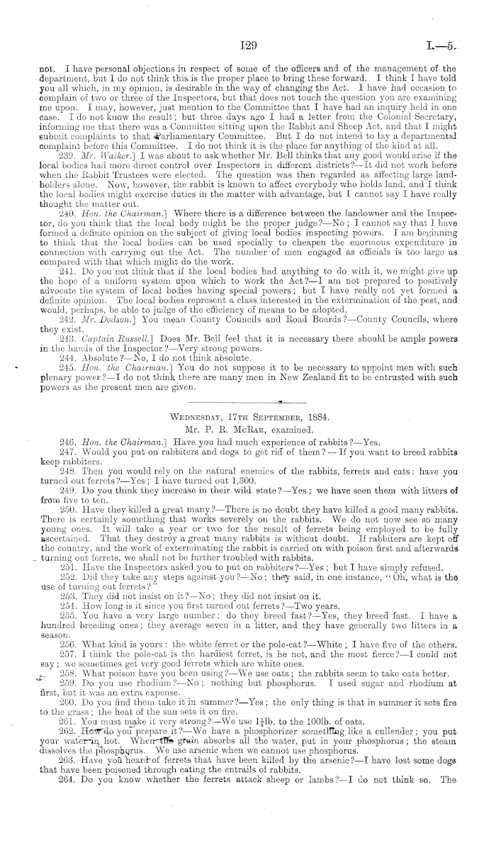 Wednesday, 17th Septembee, 1884. Mr. P. B. Mcßae, examined. 246. Hon. the Chairman.) Have you had much experience of rabbits?— Yes. 247. Would you put on rabbiters and dogs to get rid of them? —If you want to breed rabbits keep rabbiters. 248. Then you would rely on the natural enemies of the rabbits, ferrets and cats: have you turned out ferrets?— Yes ; I have turned out 1,300. 249. Do you think they increase in their wild state ?—Yes ; we have seen them with litters of from five to ton. 250. Have they killed a great many? —There is no doubt they have killed a good many rabbits. There is certainly something that works severely on the rabbits. Wo do not now see so many young ones. It will take a year or two for the result of ferrets being employed to be fully ascertained. That they destroy a great many rabbits is without doubt. If rabbiters are kept off the country, and the work of exterminating the rabbit is carried on with poison first and afterwards turning out ferrets, we shall not be further troubled with rabbits. 251. Have the Inspectors asked you to put on rabbiters?—Yes ; but I have simply refused. 252. Did they take any steps against you? —No ; they said, in one instance, " Oh, what is the use of turning out ferrets ? " 253. They did not insist on it?—No; they did not insist on it. 254. How long is it since you first turned out ferrets?— Two years. 255. You have a very large number: do they breed fast ?—Yes, they breed fast. I have a hundred breeding ones; they average seven in a litter, and they have generally two litters in a season. 256. What kind is yours : the white ferret or the pole-cat ?—White ; I have five of the others.. 257. I think the pole-cat is the hardiest ferret, is he not, and the most fierce ?—I could not say; we sometimes get very good ferrets which are white ones. 258. What poison have you been using?—We use oats; the rabbits seem to take oats better. 259. Do you use rhodium?—No; nothing but phosphorus. I used sugar and rhodium at first, but it was an extra expense. 260. Do you find them take it in summer?— Yes; the only thing is that in summer it sets fire to the grass; the heat of the sun sets it on fire. 261. You must make it very strong?—We use ljlb. to the 1001b. of oats. 262. HoW'do you prepare it?—We have a phosphorizer something like a cullender; you put your water in hot. When the grain absorbs all the water, put in your phosphorus ; the steam dissolves the phosphorus. We use arsenic when we cannot use phosphorus. 263. Have you heard of ferrets that have been killed by the arsenic? —I have lost some dogs that have been poisoned through eating the entrails of rabbits. 264. Do you know whether the ferrets attack sheep or lambs?—l do not think so. The