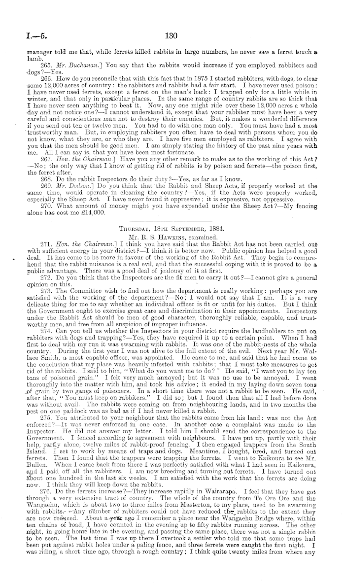 Thursday, 18th Septembee, 1884. Mr. B. S. Hawkins, examined. 271. Hon. the Chairman!) I think you have said that the Rabbit Act has not been carried out with sufficient energy in your district ? —I think it is better now. Public opinion has helped a good deal. It has come to be more in favour of the working of the Rabbit Act. They begin to comprehend that the rabbit nuisance is a real evil, and that the successful coping with it is proved to be a public advantage. There was a good deal of jealousy of it at first. 272. Do you think that the Inspectors are the fit men to carry it out ? —I cannot give a general opinion on this. 273. The Committee wish to find out how the department is really working : perhaps you are satisfied with the working of the department ? —No; I would not say that I am. It is a very delicate thing for me to say whether an individual officer is fit or unfit for his duties. But I think the Government ought to exercise great care and discrimination in their appointments. Inspectors under the Babbit Act should be men of good character, thoroughly reliable, capable, and trustworthy men, and free from all suspicion of improper influence. 274. Can you tell us whether the Inspectors in your district require the landholders to put on rabbiters with dogs and trapping?— Yes, they have required it up to a certain point. When I had first to deal with my run it was swarming with rabbits. It was one of the rabbit-nests of the whole country. During the first year I was not alive to the full extent of the evil. Next year Mr. Wallace Smith, a most capable officer, was appointed. He came to me, and said that he had come to the conclusion that my place was heavily infested with rabbits; that I must take measures to get rid of the rabbits. I said to him, "What do you want me to do? " He said, "I wantyou to lay ten tons of poisoned grain." I felt very much annoyed; but it was no use to be annoyed. I went thoroughly into the matter with him, and took his advice ; it ended in my laying down seven tons of grain by two gangs of poisoners. In a short time there was not a rabbit to be seen. He said, after that, " You must keep on rabbiters." I did so; but I found then that all I had before done was without avail. The rabbits were coming on from neighbouring lands, and in two months the pest on one paddock was as bad as if I had never killed a rabbit. 275. You attributed to your neighbour that the rabbits came from his land: was not the Act enforced? —It was never enforced in one case. In another case a complaint was made to the Inspector. He did not answer my letter. I told him I should send the correspondence to the Government. I fenced according to agreement with neighbours. I have put up, partly with their help, partly alone, twelve miles of rabbit-proof fencing. I then engaged trappers from the South Island. I set to work by means of traps and dogs. Meantime, I bought, bred, and turned out ferrets. Then I found that the trappers were trapping the ferrets. I went to Kaikoura to see Mr. Bullen. When I came back from there I was perfectly satisfied with what I had seen in Kaikoura, and I paid off all the rabbiters. lam now breeding and turning out ferrets. I have turned out about one hundred in the last six weeks. lam satisfied with the work that the ferrets are doing now. I think they will keep down the rabbits. 276. Do the ferrets increase?— They increase rapidly in Wairarapa. I feel that they have got through a very extensive tract of country. The whole of the country from Te Ore Ore and the Wangaohu, which is about two to throe miles from Masterton, to my place, used to be swarming with rabbits.-- -"■""Any number of rabbiters could not have reduced the-^ rabbits to the extent they are now reduced. About a-year ago I remember a place near the Wangaehu Bridge where, within ten chains of road, I have counted in the evening up to fifty rabbits running across. The other night, in going home late in the evening, and passing the same place, there was not a single rabbit to be seen. The last time I was up there I overtook a settler who told me that some traps had been put against rabbit holes under a paling fence, and three ferrets were caught the first night. I was riding, a short time ago, through a rough country; I think quite twenty miles from where any