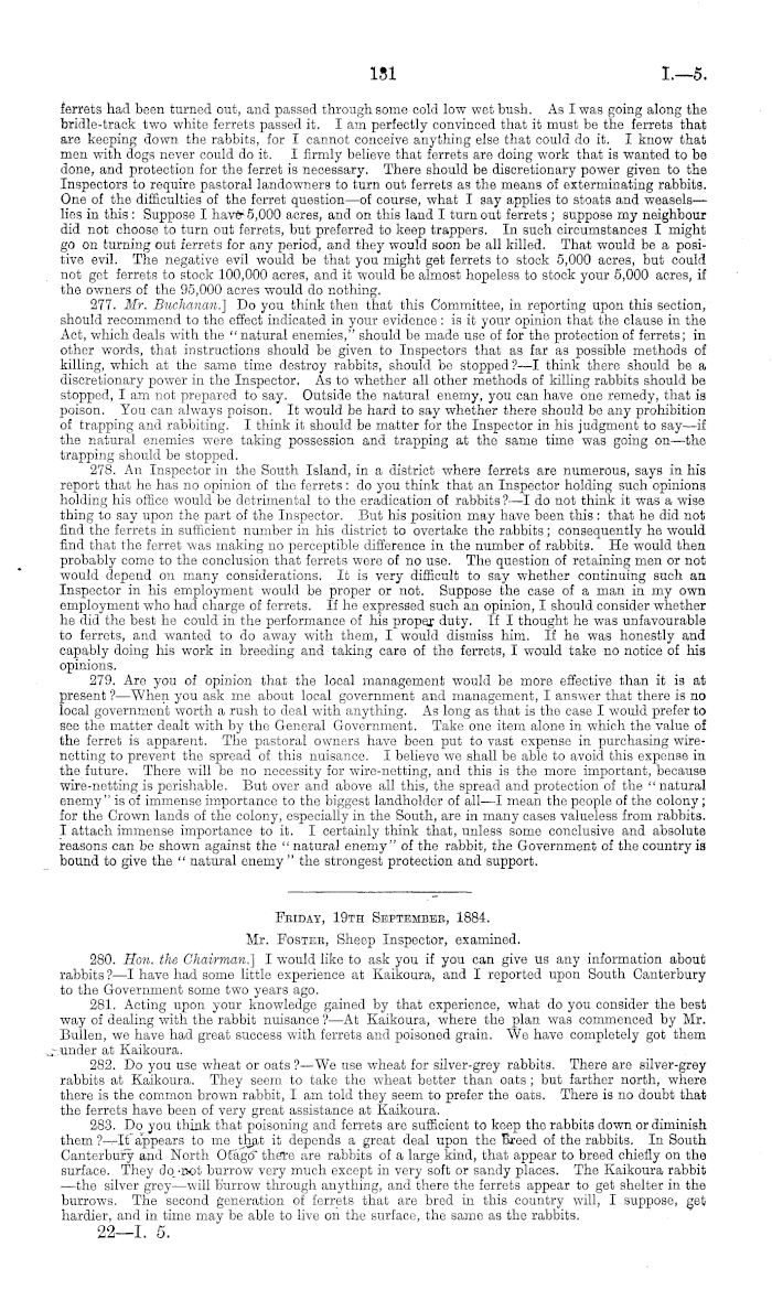 Feiday, 19th Septembee, 1884. Mr. Fostee, Sheep Inspector, examined. 280. Hon. the Chairman!) I would like to ask you if you can give us any information about rabbits ? —I have had some little experience at Kaikoura, and I reported upon South Canterbury to the Government some two years ago. 281. Acting upon your knowledge gained by that experience, what do you consider the best way of dealing with the rabbit nuisance ? —At Kaikoura, where the plan was commenced by Mr. Bullen, we have had great success with ferrets and poisoned grain. We have completely got them under at Kaikoura. 282. Do you use wheat or oats ? —We use wheat for silver-grey rabbits. There are silver-grey rabbits at Kaikoura. They seem to take the wheat better than oats; but farther north, where there is the common brown rabbit, I am told they seem to prefer the oats. There is no doubt that the ferrets have been of very great assistance at Kaikoura. 283. Do you think that poisoning and ferrets are sufficient to keep the rabbits down or diminish them ? —lt appears to me that it depends a great deal upon the breed of the rabbits. In South Canterbury and North Otago there are rabbits of a large kind, that appear to breed chiefly on the surface. They do -not burrow very much except in very soft or sandy places. The Kaikoura rabbit ■ —the silver grey —will burrow through anything, and there the ferrets appear to get shelter in the burrows. The second generation of ferrets that are bred in this country will, I suppose, get hardier, and in time may be able to live on the surface, the same as the rabbits. 22—1. 5.