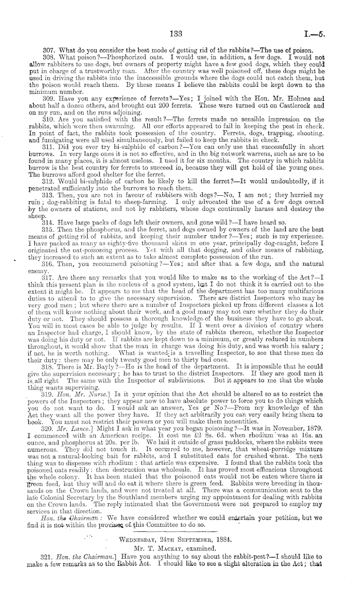 Wednesday, 24th Septembee, 1884. Mr. T. Mackay, examined. 321. Hon. the Chairman.) Have you anything to say about the rabbit-pest?—l should like to make a few remarks as to the Rabbit Act. I should like to see a slight alteration in the Act; that