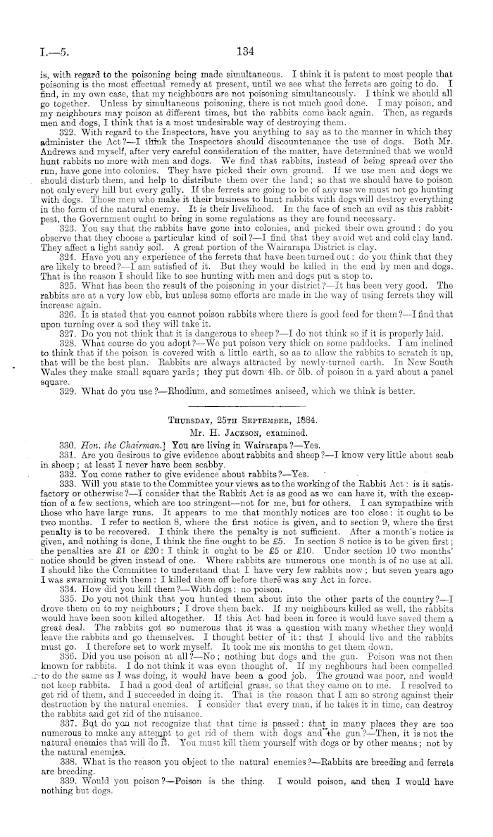 Thuesday, 25th Septembee, 1884. Mr. H. Jackson, examined. 330. Hon. the Chairman!) You are living in Wairarapa ?—Yes. 331. Are you desirous to give evidence about rabbits and sheep?—l know very little about scab in sheep ; at least I never have been scabby. 332. You come rather to give evidence about rabbits?— Yes. 333. Will you state to the Committee your views as to the working of the Babbit Act: is it satisfactory or otherwise ?—I consider that the Babbit Act is as good as we can have it, with the exception of a few sections, which are too stringent —not for me, but for others. I can sympathize with those who have large runs. It appears to me that monthly notices are too close: it ought to be tw-o months. I refer to section 8, where the first notice is given, and to section 9, where the first penalty is to be recovered. I think there the penalty is not sufficient. After a month's notice is given, and nothing is done, I think the fine ought to be £5. In section 8 notice is to be given first; the penalties are £1 or £20: I think it ought to be £5 or £10. Under section 10 two months' notice should be given instead of one. Where rabbits are numerous one month is of no use at all. I should like the Committee to understand that I have very few rabbits now ; but seven years ago I was swarming with them : I killed them off before there was any Act in force. 334. How did you kill them ?—With dogs : no poison. 335. Do you not think that you hunted them about into the other parts of the country?—l drove them on to my neighbours ; I drove them back. If my neighbours killed as well, the rabbits would have been soon killed altogether. If this Act had been in force it would have saved them a great deal. The rabbits got so numerous that it was a question with many whether they would leave the rabbits and go themselves. I thought better of it: that I should live and the rabbits must go. I therefore set to work myself. It took me six months to get them down. 336. Did you use poison at all ?—No ; nothing but dogs and the gun. Poison was not then known for rabbits. Ido not think it was even thought of. If my neghbours had been compelled to do the same as I was doing, it, would have been a good job. The ground was poor, and would not keep rabbits. I had a good deal of artificial grass, so that they came on to me. I resolved to get rid of them, and I succeeded in doing it. That is the reason that lam so strong against their destruction by the natural enemies. I consider that every man, if he takes it in time, can destroy the rabbits and get rid of the nuisance. 337. But do you not recognize that that time is passed: that in many places they are too numerous to make any attempt to get rid of them with dogs and'the gun?— Then, it is not the natural enemies that will do ft. You must kill them yourself with dogs or by other means; not by the natural enemies. 338. What is the reason you object to the natural enemies?— Babbits are breeding and ferrets are breeding. 339. Would you poison?— Poison is the thing. I would poison, and then I would have nothing but dogs.