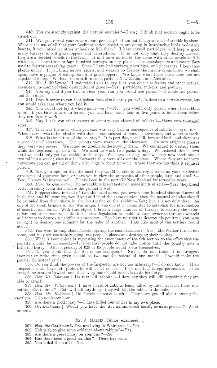 340. You are strongly against the natural enemies ?—I am ; I think that section ought to be struck out. 341. Will you repeat your reason more precisely?—l am put to a great deal of trouble by them. What is the use of all that your Acclimatization Societies are doing in introducing birds to destroy insects, if you introduce other animals to kill them? I have myself partridges, and keep a good many turkeys to kill grasshoppers and caterpillars. It is not only that they destroy insects, they are a decided benefit to the farm. It is, I have no doubt, the same with other people as it is with me. I have three or four hundred turkeys on my place. The grasshoppers and caterpillars used to destroy everything green. Since I have had turkeys, partridges, and pheasants, I kept that plague under. If you bring ferrets, stoats, and weasels to destroy tho insectivorous birds, we shall again have a plague of caterpillars and grasshoppers. We know what these have done and are capable of doing. We have them still in some parts of New Zealand and Australia. 342. Mr. J. McKcnzic!) I understand you to say that you object to ferrets and other natural enemies on account of their destruction of game ?—Yes ; partridges, turkeys, and poultry. 343. You say that if you had to clear your run you would use poison ?—I would use poison, and then dogs. 344. Does it occur to you that poison does also destroy game ?—lt does to a certain extent, but you would take care where you laid it. 345. You would not lay it where game were ?—No; you would only poison where the rabbits were. If you have to turn to ferrets, you will have some four or five years to breed them before they can do any work. 346. May I ask you what extent of country you cleared of rabbits ?—About two thousand acres. 347. That was the area which you said was very bad in consequence of rabbits being on it ?— When I saw I was to be infested with them I commenced at once. I have sons, and we set to work. 348. What is the nature of the country ?—lt is part flat, part hill, fern and bush, and there was a good deal of clearance. The rabbits were worse on the clearance. On new artificial grasses they were very severe. We found no trouble in destroying them. We continued to destroy them while the dogs could go to work. We used to work two packs a day. We reduced them down until we couid only get two rabbits in the day. We have six dogs, and we may now catch one or two rabbits a week ; that is all. Formerly they were all over the place. Where they are not very numerous you can get rid of them with dogs without poison ; where they are too thick it requires poison. 349. Is it your opinion that the most they would be able to destroy is based on your particular experience of your own land, or have you in view the properties of other people, large and small ?— Yes; I know Wairarapa well. I have been in the north "of New Zealand for forty-five years. 350. Hon. the Chairman!) Do not rabbits breed faster on some kinds of soil?— Yes; they breed better in sandy loam than where the ground is wet. 351. Suppose that, instead of two thousand acres, you owned one hundred thousand acres of bush, flat, and hill country, would you still be of the same opinion, that the natural enemies should be excluded from their share in the destruction of the rabbit ?—Yes ; but it is not only that. As one of the small farmers in the Wairarapa, I was one of a committee to establish the introduction of insectivorous birds. With this object I bred a large number of turkeys to destroy the caterpillars and other insects. I think it is class-legislation to enable a large owner to turn out weasels and ferrets to destroy a neighbour's property. You have no right to destroy his poultry ; you have no right to destroy one industry for the sake of another. lam like most of the settlers round about. 352. You were talking about ferrets injuring tho small farmers ?—Yes ; Mr. Walker turned out some, and they are constantly going into people's places and destroying their poultry. 353. What is your object in suggesting the amendment of the 9th section to the effect that the penalty should be increased ?—lt is because people do not take notice until the penalty gets a little too heavy. After a penalty of £20 or £5 people would bestir themselves. 354. Do you think that the Act is too stringent?—No; I do not think it is stringent enough; only the time given should be two months instead of one month. I would make the penalty £5 instead of £1. 355. Do you think the powers of the Inspector are not too arbitrary ? —I do not know. If an Inspector must have interpreters he will be of no use. Ido not like things permissive. I like everything straightforward, and that every one should be made to do his duty. 356. Hon. Mr. Bobinson.) Do rats kill rabbits ?—I dare say they will kill anything they are able to attack. 357. Hon. Mr. Williamson.) I have heard of rabbits being killed by rats: at least there was nothing else to do it ?—Bats will kill anything; they will kill the rabbit in the hole. 358. Hon. Mr. Bobinson.] Do ferrets increase much?— They have got all about among the settlers. Ido not know how. 359. Are there a good many ?—I have killed four or five in my own place. 360. Mr. Buchanan.) Would you have the Act administered locally or as at present ?—As at present. ■> \mm^. Mr. J. Maetin, Junior, examined. „ 361. Hon. the Chairman.) You are living in Wairarapa ?—Yes. 362. You wish to give some evidence about rabbits ?—Yes. 363. Are there a great many on your run ?—No. 364. Has there been a great number?— There has been. 365. You killed them all ?—Yes,