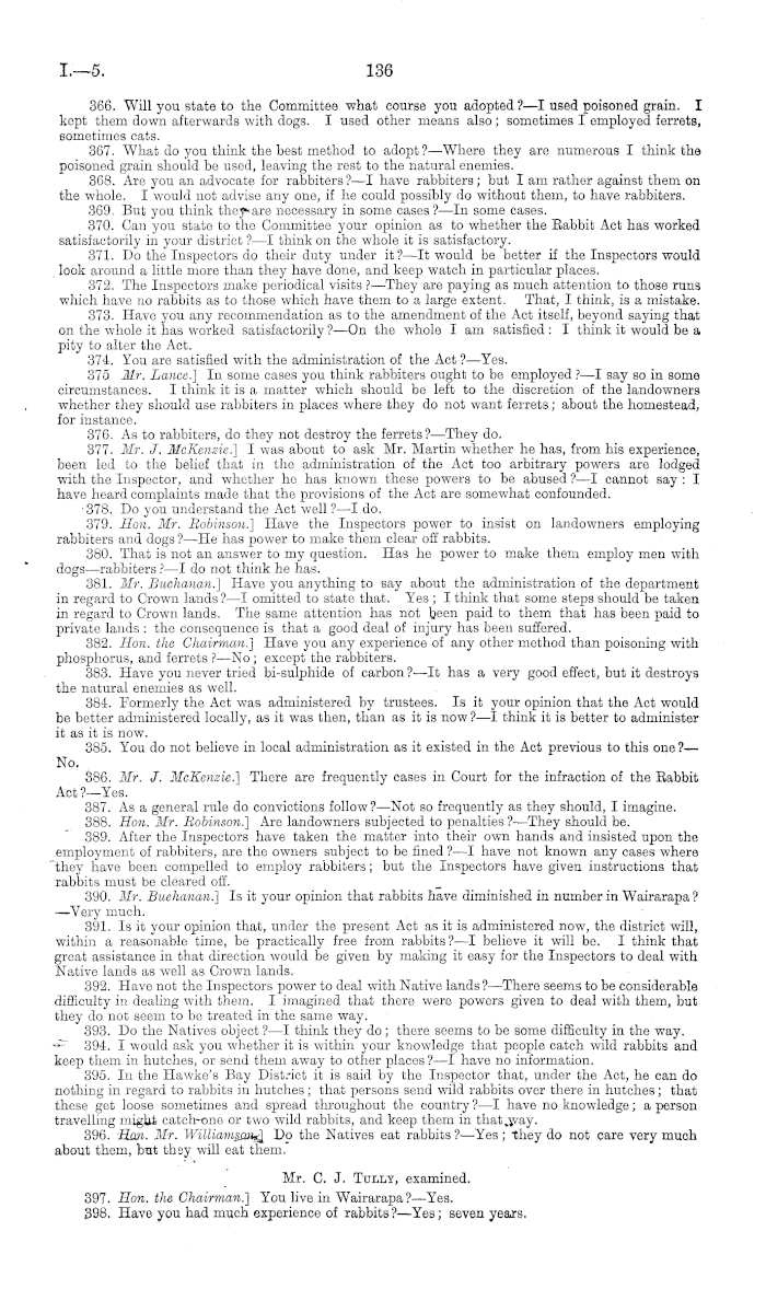 366. Will you state to the Committee what course you adopted ?—I used poisoned grain. I kept them down afterwards with dogs. I used other means also; sometimes I employed ferrets, sometimes cats. 367. What do you think the best method to adopt?— Whore they are numerous I think the poisoned grain should be used, leaving the rest to the natural enemies. 368. Are you an advocate for rabbiters ?—I have rabbiters; but lam rather against them on the whole. I would not advise any one, if he could possibly do without them, to have rabbiters. 369. But you think they-are necessary in some cases?—ln some cases. 370. Can you state to the Committee your opinion as to whether the Babbit Act has worked satisfactorily in your district ?—I think on tho whole it is satisfactory. 371. Do the Inspectors do their duty under it? —It would be better if the Inspectors would look around a little more than they have done, and keep watch in particular places. 372. The Inspectors make periodical visits ?—They are paying as much attention to those runs which have no rabbits as to those which have them to a large extent. That, I think, is a mistake. 373. Have you any recommendation as to the amendment of the Act itself, beyond saying that on the whole it has worked satisfactorily ? —On the whole I am satisfied : I think it would be a pity to alter the Act. 374. You are satisfied with the administration of the Act ?—Yes. 375 Mr. Lance.) In some cases you think rabbiters ought to be employed ?—I say so in some circumstances. I think it is a matter which should be left to the discretion of the landowners whether they should use rabbiters in places where they do not want ferrets; about the homestead, for instance. 376. As to rabbiters, do they not destroy the ferrets?— They do. 377. Mr. J. McKenzie!) I was about to ask Mr. Martin whether he has, from his experience, been led to the belief that in the administration of the Act too arbitrary powers are lodged with the Inspector, and whether he has known these powers to be abused ?—I cannot say : I have heard complaints made that the provisions of the Act are somewhat confounded. •378. Do you understand the Act well ?—I do. 379. Hon. Mr. Robinson!) Have the Inspectors power to insist on landowners employing rabbiters and dogs ? —He has power to make them clear off rabbits. 380. That is not an answer to my question. Has he power to make them employ men with dogs—rabbiters ? —I do not think he has. 381. Mr. Buchanan.) Have you anything to say about the administration of tho department in regard to Crown lands? —I omitted to state that. Yes ; I think that some steps should be taken in regard to Crown lands. The same attention has not been paid to them that has been paid to private lands : the consequence is that a good deal of injury has been suffered. 382. Hon. the Chairman.) Have you any experience of any other method than poisoning with phosphorus, and ferrets ?- —No; except the rabbiters. 383. Have you never tried bi-sulphide of carbon ?■ —It has a very good effect, but it destroys the natural enemies as well. 384. Formerly the Act was administered by trustees. Is it your opinion that the Act would be better administered locally, as it was then, than as it is now ?—I think it is better to administer it as it is now. 385. You do not believe in local administration as it existed in the Act previous to this one?— No. 386. Mr. J. McKenzie.) There are frequently cases in Court for the infraction of the Babbit Act ?—Yes. 387. As a general rule do convictions follow?— Not so frequently as they should, I imagine. 388. Hon. Mr. Bobinson.) Are landowners subjected to penalties?— They should be. 389. After the Inspectors have taken the matter into their own hands and insisted upon the employment of rabbiters, are the owners subject to be fined ?—I have not known any cases where they have been compelled to employ rabbiters; but the Inspectors have given instructions that rabbits must be cleared off. 390. Mr. Buchanan.) Is it your opinion that rabbits have diminished in number in Wairarapa ? —Very much. 391. Is it your opinion that, under the present Act as it is administered now, the district will, within a reasonable time, be practically free from rabbits ? —I believe it will be. I think that great assistance in that direction would be given by making it easy for the Inspectors to deal with Native lands as well as Crown lands. 392. Have not the Inspectors power to deal with Native lands ?—There seems to be considerable difficulty in dealing with them. I imagined that there were powers given to deal with them, but they do not seem to be treated in the same way. 393. Do the Natives object ?—I think they do; there seems to be some difficulty in the way. 394. I would ask you whether it is within your knowledge that people catch wild rabbits and keep them in hutches, or send them away to other places? —I have no information. 395. In the Hawke's Bay District it is said by the Inspector that, under the Act, he can do nothing in regard to rabbits in hutches; that persons send wild rabbits over there in hutches; that these get loose sometimes and spread throughout the country ? —I have no knowledge; a person travelling might catch-one or two wild rabbits, and keep them in that.way--396. Hon. Mr. Williamson.) Do the Natives eat rabbits ? —Yes ; they do not care very much about them, but they will eat them. Mr. C. J. Tully, examined. 397. Hon. the Chairman!) You live in Wairarapa?—Yes. 398. Have you had much experience of rabbits?— Yes; seven years.