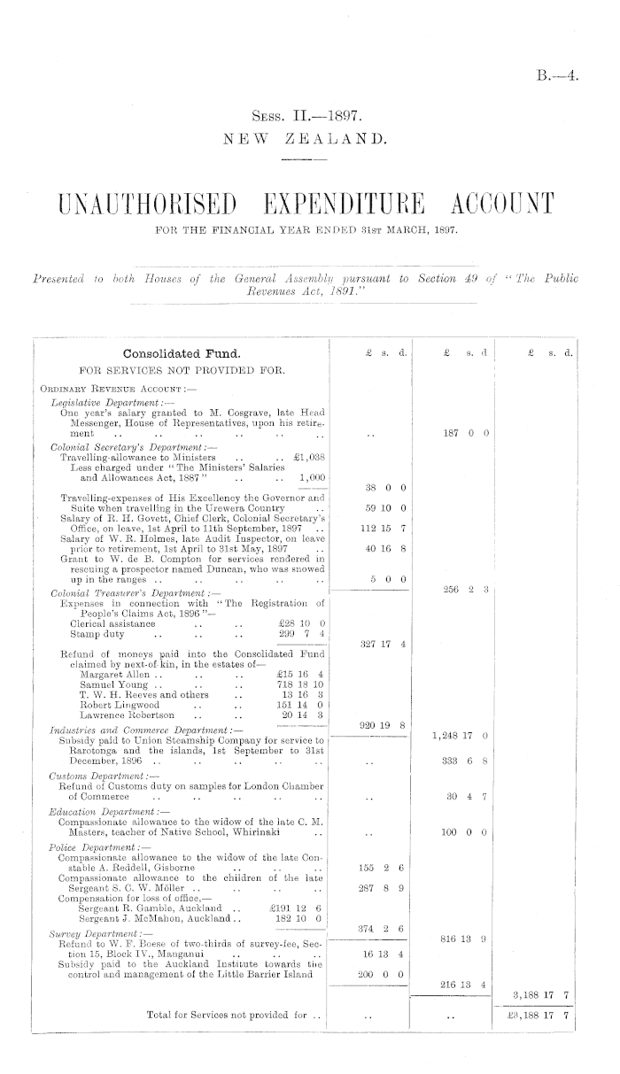 UNAUTHORISED EXPENDITURE ACCOUNT FOR THE FINANCIAL YEAR ENDED 31st MARCH, 1897., Appendix to the Journals of the House of Representatives, 1897 Session II, B-04
