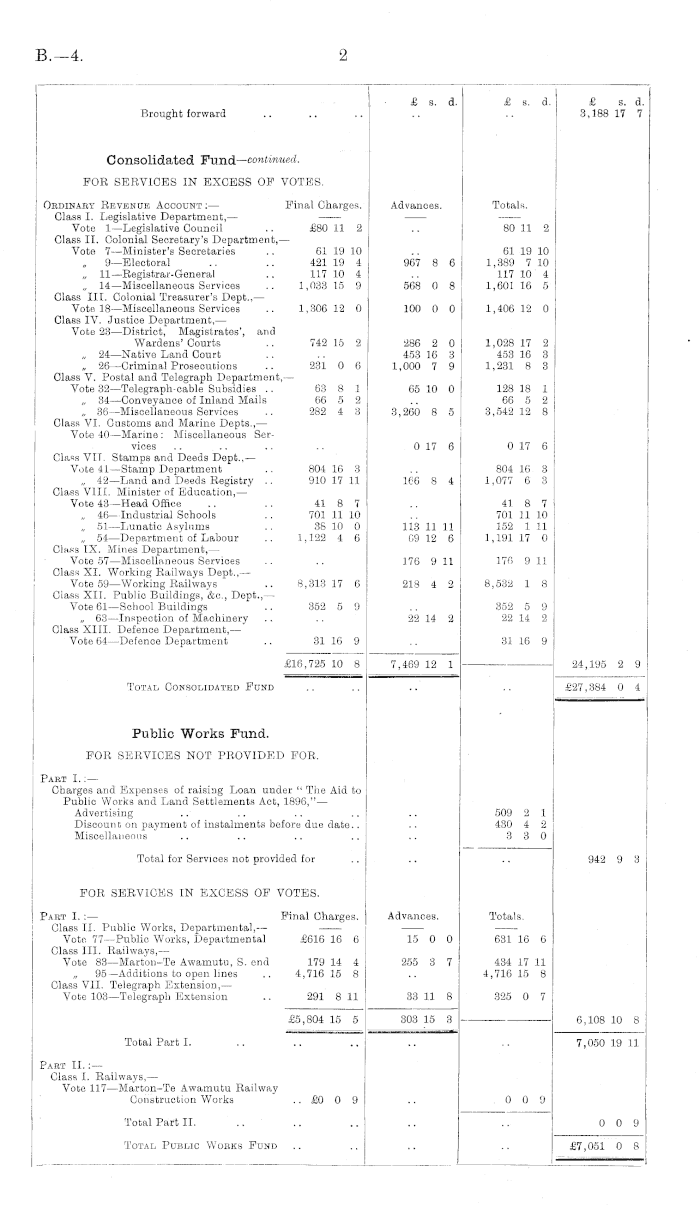 £ s. d. £ s. d. £ s. d. 3,188 17 7 Brought forward Consolidated Fund— eontmued. FOR SERVICES IN EXCESS OF VOTES. Advances. Totals. Oedihaby Revenue Account :— Final Charges. Class I. Legislative Department,— Vote 1—Legislative Council .. £80 11 2 Class II. Colonial Secretary's Department,— Vote 7—Minister's Secretaries .. 61 19 10 9—Electoral .. .. 421 19 4 „ 11—Registrar-General .. 117 10 4 „ 14—Miscellaneous Services .. 1,033 15 9 Class III. Colonial Treasurer's Dept.,— Vote 18—Miscellaneous Services .. 1,306 12 0 Class IV. Justice Department,— Vote 23 —District, Magistrates', and Wardens'Courts .. 742 15 2 24 —Native Land Court „ 26—Criminal Prosecutions .. 231 0 6 Glass V. Postal and Telegraph Department,— Vote 32—Telegraph-cable Subsidies .. 63 8 1 „ 34—Conveyance of Inland Mails 66 5 2 „ 36—Miscellaneous Services .. 282 4 3 Class VI. Customs and Marine Depts.,— Vote 40—Marine : Miscellaneous Services .. ... Class VIT. Stamps and Deeds Dept.,— Vote 41—Stamp Department .. 804 16 3 „ 42—Land and Deeds Registry .. 910 17 11 Class VIII. Minister of Education, — Vote 43—Head Office .. .. 41 8 7 „ 46— Industrial Schools .. 701 11 10 „ 51—Lunatic Asylums .. 38 10 0 „ 54—Department of Labour .. 1,122 4 6 Class IX. Mines Department,— Vote 57—Miscellaneous Services Class XL Working Railways Dept.,— Vote 59—Working Railways .. 8,313 17 6 Class XII. Public Buildings, &o., Dept.,— Vote 61—School Buildings .. 352 5 9 „ 63—Inspection of Machinery Class XIII. Defence Department,— Vote 64—Defence Department .. 31 16 9 967 8 6 568 0 8 100 0 0 286 2 0 453 16 3 1,000 7 9 65 10 0 3,260 8 5 80 11 2 61 19 10 1,389 7 10 117 10 4 1,601 16 5 1,406 12 0 1,028 17 2 453 16 3 1,231 8 3 128 18 1 66 5 2 3,542 12 8 24,195 2 9 0 17 6 0 17 6 166 8 4 804 16 3 1,077 6 3 113 11 11 69 12 6 41 8 7 701 11 10 152 1 11 1,191 17 0 176 9 11 176 9 11 218 4 2 8,532 1 8 22 14 2 352 5 9 22 14 2 31 16 9 £16,725 10 8 7,469 12 1 Total Consolidated Fund £27,384 0 4 Public Works Fund. FOR SERVICES NOT PROVIDED FOR. Past I.:— Charges and Expenses of raising Loan under " The Aid to Public Works and Land Settlements Act, 1896," — Advertising Discount on payment of instalments before due date.. Miscellaneous 509 2 1 430 4 2 3 3 0 Total for Services not provided for 942 9 3 FOR SERVICES IN EXCESS OF VOTES. Advances. Totals. Pakt I.: — Final Charges. Class II. Public Works, Departmental,— Vote 77—Public Works, Departmental £616 16 6 Class III. Railways,— Vote 83—Marton-Te Awamutu, S. end 179 14 4 „ 95—Additions to open lines .. 4,716 15 8 Class VII. Telegraph Extension, — Vote 103—Telegraph Extension .. 291 8 11 £5.804 15 5 15 0 0 255 3 7 631 16 6 434 17 11 4,716 15 8 6,108 10 8 33 11 8 325 0 7 *0,HU4 10 0 Total Part I. £5,804 15 5 303 15 3 Part II.:— Class I. Railways,— Vote 117—Marton-Te Awamutu Railway Construction Works .. £0 0 9 7,050 19 11 0 0 9 0 0 9 Total Part II. Total Public Works Fund £7,051 0 8