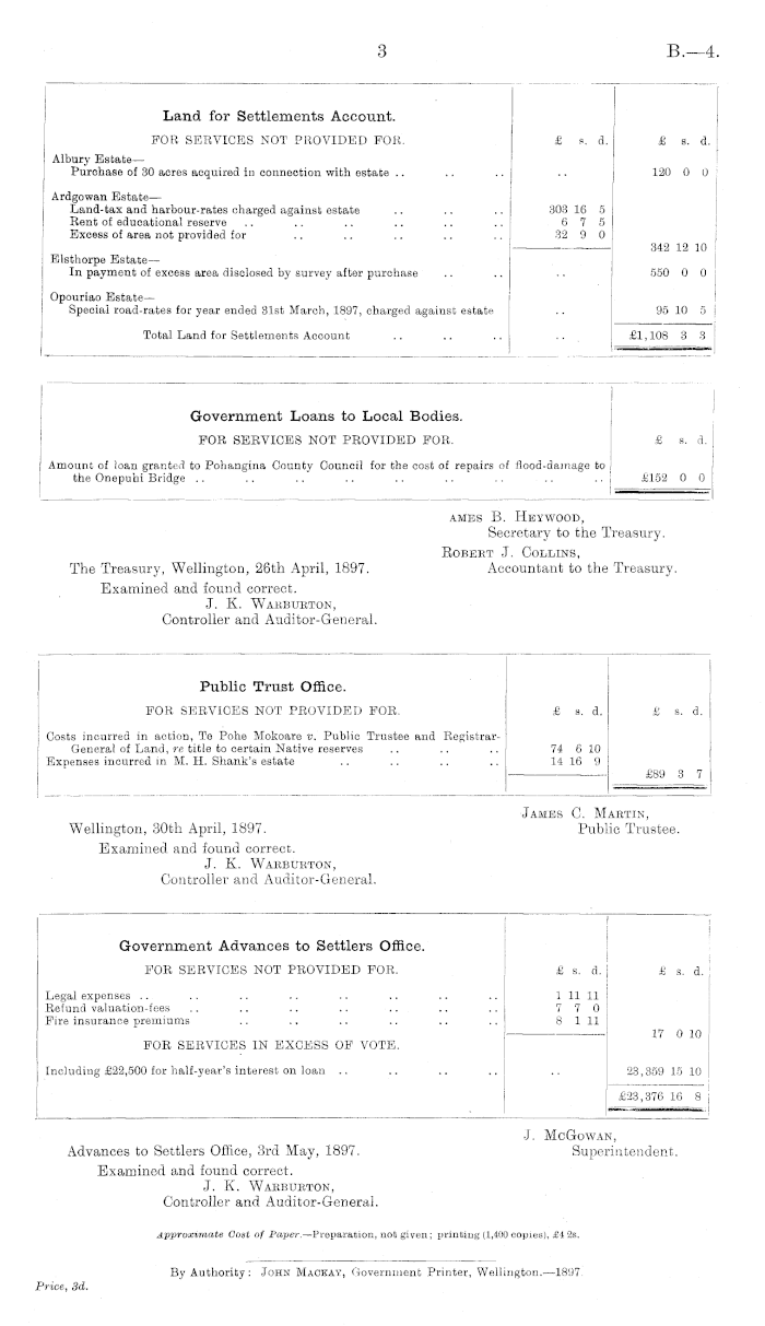 •J. McGowan, Advances to Settlers Office, 3rd May, 1897. Superintendent. Examined and found correct. J. K. Wabbukton, Controller and Auditor-General. Approximate Cost of Paper. —Preparation, not given ; printing (1,400 copies), £i 2s.