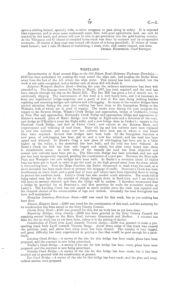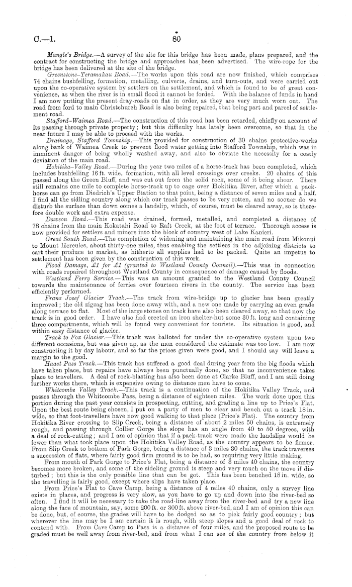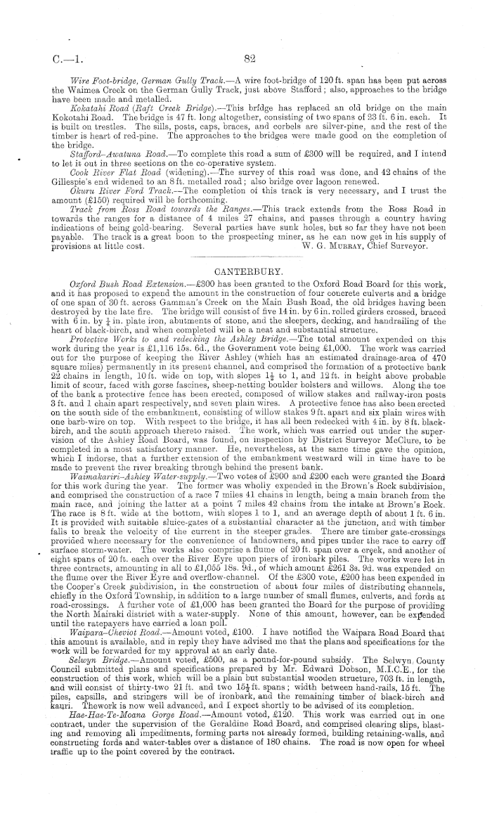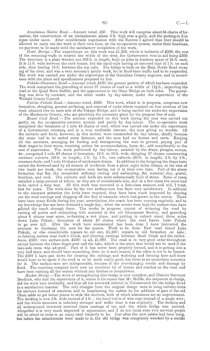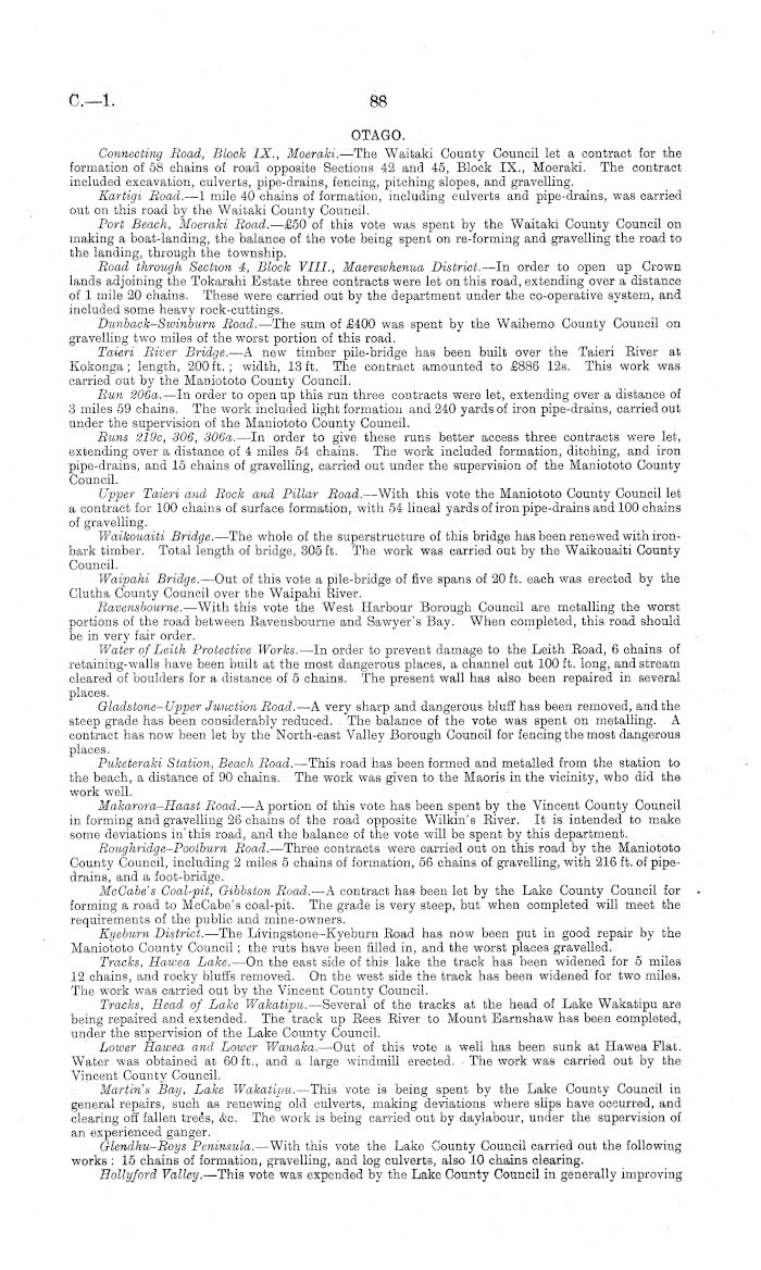 In Marlborough, the most important work in hand has been the construction of the road south from Kaikoura, towards the Conway Eiver, about thirteen miles and a half of dray-road having been completed. It is anticipated that this road, besides giving access to the lands recently selected south of Kaikoura, will eventually form a main line connecting Kaikoura with Cheviot, and will probably take a good deal of the traffic that at present passes by the Kaikoura-Waiau Eoad, the grades being much better. In Nelson and Westland the main road, Belgrove to Eeefton and Westport, has been maintained, and numerous bridges repaired and renewed. A large bridge over the Buller, from designs by Mr. Hay, of the Public Works Department, is contracted for, and two other bridges over dangerous streams are in course of erection. This road suffered very much in the floods of March, 1897, and the necessary repairs have cost a considerable sum. The main south road in Westland has also been extended southward, so as to open up some country for settlement. On the Hokitika-Christehurch Eoad the floods before referred to did great damage, which has been put right during the year; but a succession of floods caused considerable additional damage, necessitating constant attention to keep the road open, a work which is very necessary, as this is the only overland means of communication between Canterbury and Westland. Expensive deviations will still have to be made in consequence of the destruction caused by these floods. In Canterbury the road from Pukaki to Mount Cook has been much improved, and travelling rendered easier for the numerous tourists that now visit the " Hermitage." In the neighbourhood of Mount Cook several tracks have been made, and a hut built on the Malte Brun Eange, at about 5,500 ft. above sea-level, all of which works aid materially in allowing visitors to see the magnificent mountain and glacier scenery in the neighbourhood. In Otago, besides numerous extensions of district roads, the main line from Catlin's to Waipawa has been improved and repaired. This is an important road, as it leads through districts lately settled; and, although metalling will be expensive, it must be done in order to carry the produce of the district to the railway and a market. The Waiau Eiver to Preservation Sound Track has been in hand during the past year, in Southland, and over forty miles of 10 ft. track is now available for foot traffic; it leads through much broken country, but will be a boon to the miners at Preservation Sound when finished. Works have also been going on at Milford Sound in continuing the widening of the road to give access to the Sutherland Falls, but much remains to be done before this road is available for wheeled traffic.
