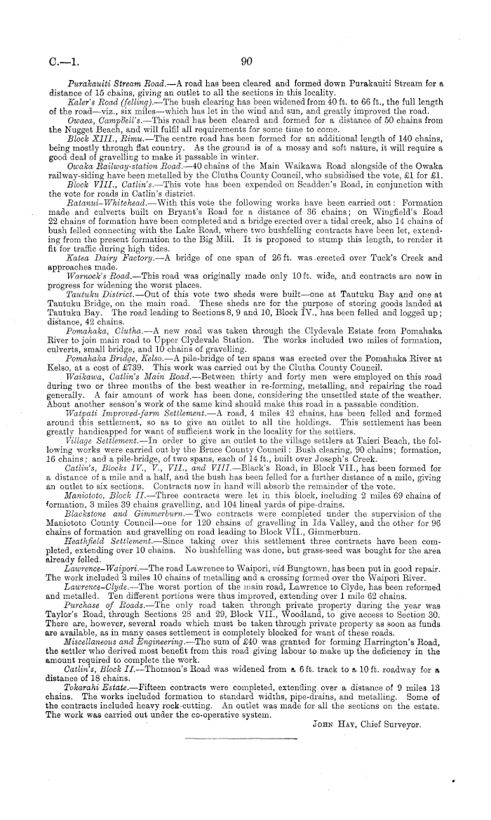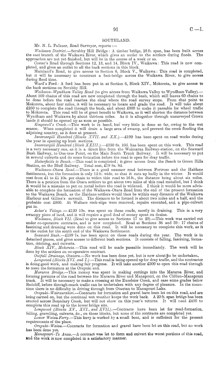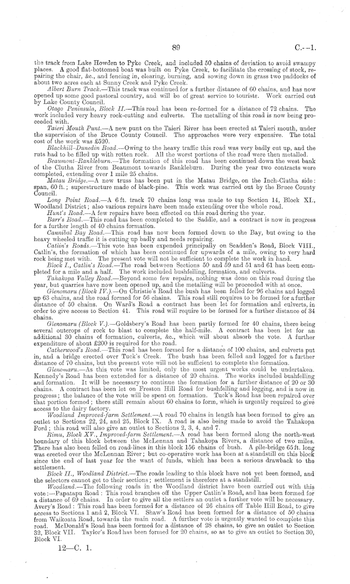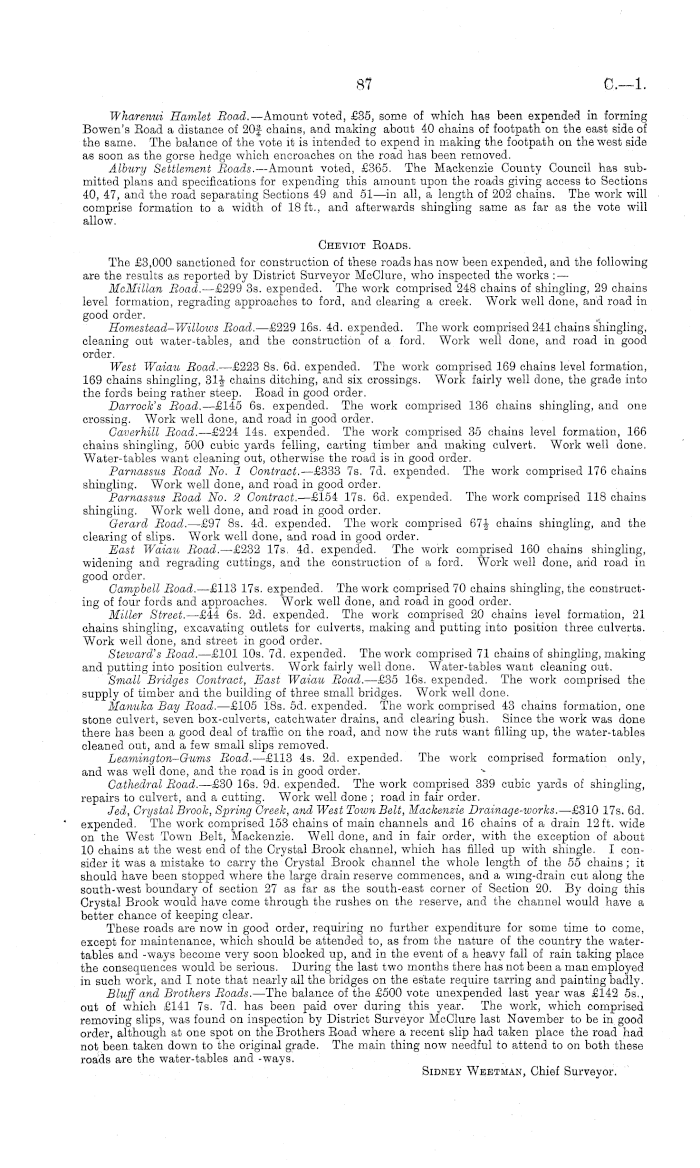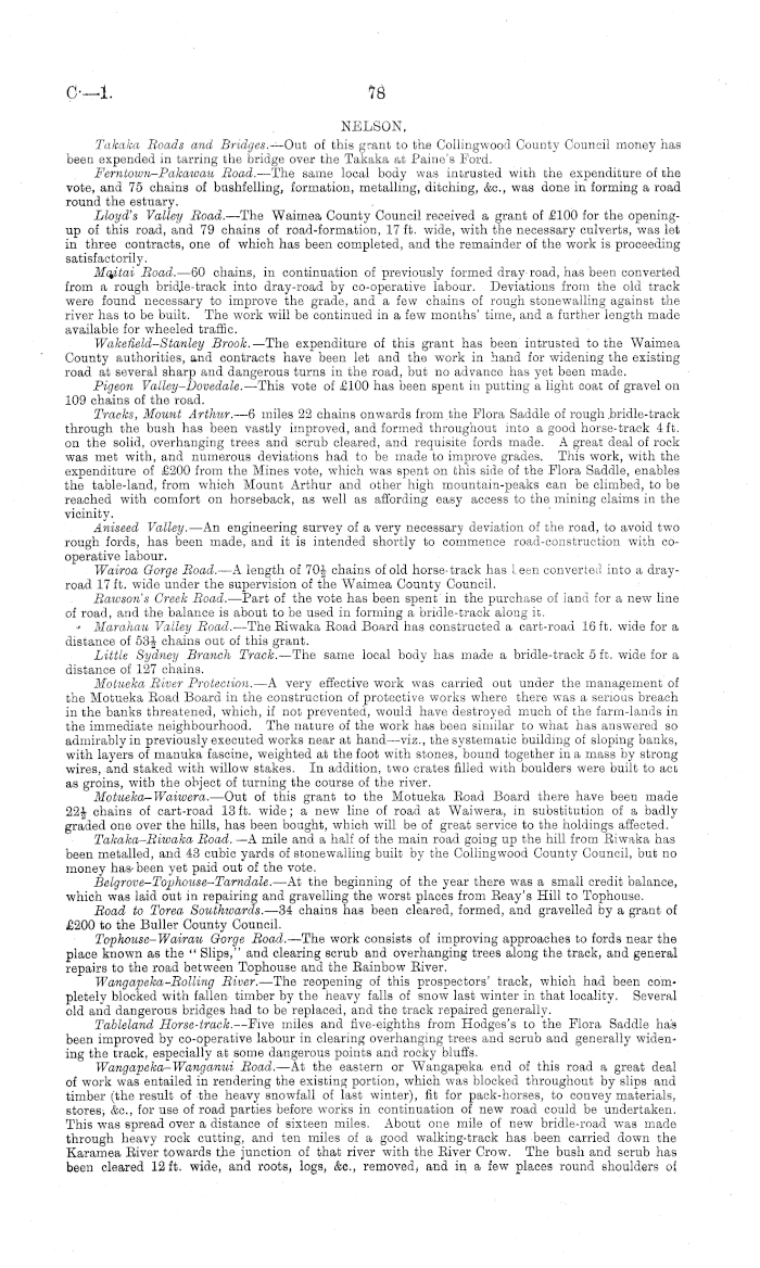Waimamaku-Pakanae Road 0 10 1 9 0 6 6 0 7 6| 0 6 7 8 ._ 488 11 2 9 6 3 497 17 5 56 chains engineering survey. Four contracts in hand. Takahue Road Opua-Waimate Road Opuawhanga-Whananaki.. Waiwera-Warkworth Road \ North Shore-Awanui(Wai- [ temata ) North Shore-Awanui (Rodney County) North Shore-Awanui (Whangaroa County) North Shore-Awanui (Whangarei County) North Shore-Awanui (Bay of Islands County) North Shore-Awanui (Mongonui County) North Shore-Awanui (Otamatea County) Paparoa Road Maungatapere Road repairs Swanson Village Settlement Roads Maramarua (Taupiri Block Roads) Auckland Special Settlement Roads Marlborough Block Roads.. Motukaraka Village Settlement Roads Mangapiko-Maire Kohukohu-Motukaraka Rd. Main Road to Waiwera Springs Onewhero-Opuatia Road .. Hunua-Ararimu (Whiskey Creek) Mongonuiowae-Whangapae Road Matakohe-Mongonui Road 1 3 3 2 6 6 5 3 7 5 1 3 4 4 3 2 2 3 4 4 3 3 3 •3 3 4 0 20 1 29 0 22 1 42 1 63 1 76 2 0 0 36 0 55 0 20 1 0 0 48 6' 9 6*27 0 20 1 50 4 50 0 504 1 50 0 60 0 36 0 55 040 0 2 018 4 0 5 38 0'76J 0 6 0 0 5 6 0 6 0 0 6 0 0 5 4 0 5 5 0 6 0 0 5 9 0 6 0 0 5 10 0 6 0 0 6 0 0 4 10 0 6 0 0 7 0 0 7 0 0 7 0 0 7 0 0 7 0 0 7 0 0 7 3 0 7 2 0 6 8 0 6 0 0 7 0 0 5 8 0 6 0 0 6 2 0 6 6 0 6 6 0 6 2 0 6 4 0 6 6 0 6 0 0 6 5 0^3 0 6 0 0 6 8 0 5 2 8 8 8 8 . 8 8 8 8 8 8 8 8 8 _. 35 6 8 140 17 9 48 9 6 420 3 0 450 2 3 271 8 7 359 10 6 229 2 3 757 7 0 257 8 6 41 3 5 199 10 11 120 8 9 1017 3 2 7 5 5 18 0 1 15 6 24 11 5 14 18 6 8 18 0 75 5 0 10 12 2 2"5 3 35 6 8 151 15 0 50 16 11 426 1 0 451 17 9 296 0 0 374 9 0 238 0 3 832 12 0 268 0 8 41 3 5 199 10 11 144 12 10 17 chains engineering survey. One contract in hand. Wharf repaired. 2 0 0 50 44 1 0 7 14 0 51 15 0 £21 18s. SlOd. paid for fencing material. Two miles engineering survey. Two contracts in hand. 1 mile 60 chains engineering survey. 3 6 2 14 2 60 4 6 5 33 0 6 6 0 7 6 0 7 0 8 607 14 8 33 10 1 641 4 9 8 1 4 3 3 56 1 60 0 40 0 63 2 21 0 6 0 0 6 10 0 7 0 0 6 10 0 6 6 0 6 10 8 8 3. 677 9 1 11 18 0 24 15 6 702 4 7 11 18 0 4 ' 7 4 2 4 4 0 40 1 60 1 28 6 40 0 20 0 6 6 0 6 2 0 6 3 0 6 8 0 7 6 0 7 6 0 6 7 0 7 0 0 6 10 8 8 8 99 8 0 386 1 6 339 19 7 0 12 0 4 5 6 8 14 10 100 0 0 390 7 0 348 14 5 One 31 ft. bridge. 1 5 Five miles engineering survey. 1 2 3 3 0 38 0 28 0 30 037 0 5 0 0 5 6 0 5 0 0 6 0 0 5 0 0 5 9 8 8 94 8 9 58 18 7 1 14 6 2 0 7 96 3 3 60 19 2 3 4 0 63 1 70 3 30 0 6 10 0 7 0 0 6 11 8 __ 165 18 0 3 4 6 169 2 6 This includes 14 miles engineering survey. 1 6 " 1 1 0 5 9 0 5 9 0 5 9 8 89 18 0 109 5 0 199 3 0 Hukerenui, Blocks I., XL.. Main Road through Block XIV., Hukerenui Road, Block XII., Paparoa Ahipara-Herekino Road, Blocks X. and XL, Rangiriri Motatau Road .. Karamea-Ruarangi Road.. Old North Road, Waipu .. Tokatoka Swamp drains, &c. 4 2 3 13 5 3 3 4 2 5 1 70J 1 56 0 22 9 0 226 020 0 20 019 1 "i 0 5 6 0 5 9 0 5 10 0 5 0 0 5 0 0 7 0 0 6 7 0 6 6 0 8 7J 0 5 0 0 6 4J 0 6 2 0 6 2 0 5 9| 0 5 0 8 8 8 8 8 129 6 9 98 11 8 117 12 0 146 10 0 183 7 1 10 10 0 6 8 0 6 0 0 11 14 6 139 16 9 98 11 8 124 0 0 152 10 0 195 1 7 Wharf being erected; 1 mile 52 chains railway; six flood-gates. 1 2 6 18 2 3 3 5 0 10 0 74 1 4 0 34 0 34 040 0 26 0 56 1 52 0 6 0 0 6 0 0 6 0 0 7 0 0 6 0 0 7 0 0 8 0 0 9 0 0 6 0 0 6 6 0 6 8 0 7 6 8 8 8 8 20 8 0 45 9 0 177 9 6 3,314 10 2 ■1 10 7 3 15 0 13 6 2 347 1 4 21 18 7 49 4 0 190 15 8 3,661 11 6 _V ••