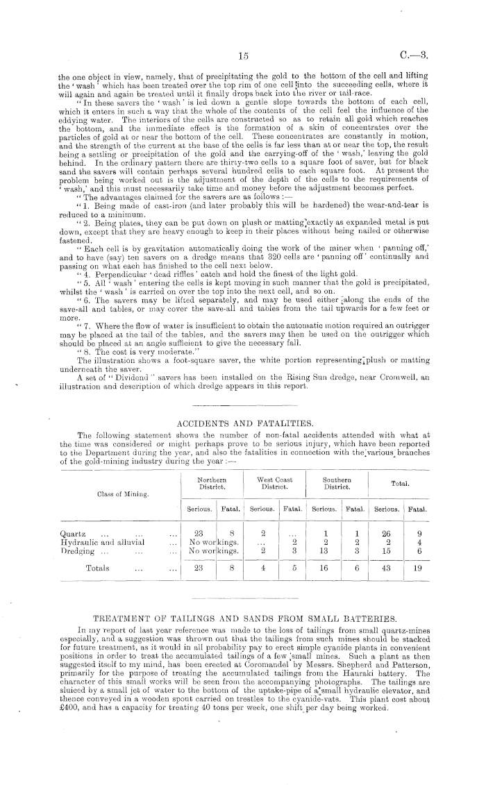 TREATMENT OF TAILINGS AND SANDS FROM SMALL BATTERIES. In my report of last year reference was made to the loss of tailings from small quartz-mines especially, and a suggestion was thrown out that the tailings from such mines should be stacked for future treatment, as it would in all probability pay to erect simple cyanide plants in convenient positions in order to treat the accumulated tailings of a few [small mines. Such a plant as then suggested itself to my mind, has been erected at Coromandel by Messrs. Shepherd and Patterson, primarily for the purpose of treating the accumulated tailings from the Hauraki battery. The character of this small works will be seen from the accompanying photographs. The tailings are sluiced by a small jet of water to the bottom of the uptake-pipe of a'small hydraulic elevator, and thence conveyed in a wooden spout carried on trestles to the cyanide-vats. This plant cost about £400, and has a capacity for treating 40 tons per week, one shift per day being worked.