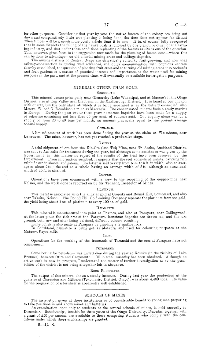SCHOOLS OF MINES. The instruction given at these institutions is of considerable benefit to young men preparing to take positions in and about mines and batteries. An examination, open only to students at the several schools of mines, is held annually in December. Scholarships, tenable for three years at the Otago University, Dunedin, together with a grant of £50 per annum, are available to those competing students who comply with the conditions under which these scholarships are granted.