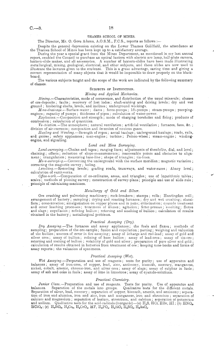 THAMES SCHOOL OF MINES. The Director, Mr. 0. Gore Adams, A.0.5.M., F.C.S., reports as follows :— Despite the general depression existing on the Lower Thames Goldfield, the attendance at the Thames School of Mines has been kept up to a satisfactory average. During the year a special grant from the Mines Department, as mentioned in my last annual report, enabled the Council to purchase an optical lantern with electric arc lamp, half-plate camera, lantern-slide maker, and all accessories. A number of lantern-slides have been made illustrating metallurgical, mining, geological, electrical, and other subjects, and these slides are now used to illustrate the lectures given to the students. This is a great advantage, saving time and giving a correct representation of many objects that it would be impossible to draw properly on the blackboard. The various subjects taught and the scope of the work are indicated by the following summary of classes. Subjects of Instruction. Mining and Applied Mechanics. Mining. —Characteristics, mode of occurrence, and distribution of the usual minerals; classes of ore-deposits; faults; recovery of lost lodes; shaft-sinking and driving levels; dry and wet ground ; timbering shafts, levels, and inclines; underground workings. Mine-drainage.— Surface-water; dams; force-pumps; lift-pumps; steam-pumps; pumpingengines ; capacity of pumps ; thickness of pipes ; calculation of water-power. Explosives. —Composition and strength ; mode of charging boreholes and firing; products of combustion ; calculation of quantities. Vβ'.illation.— The atmosphere; natural ventilation; artificial ventilation ; furnaces, fans, &c. ; division of air-currents ; composition and detection of noxious gases. Hauling and Winding. —Strength of ropes; aerial haulage ; underground haulage ; roads, rails, and guides ; safety appliances; man-engine ; turbine ; Pelton-wheel; steam-engine ; windingengine, and signalling. Land and Mine Surveying. Land-surveying. —Chains and tapes ; ranging lines; adjustments of theodolite, dial, and level; chaining; offsets; reduction of slope-measurements; inaccessible points and obstacles to alignment ; iriangulation ; measuring base-line ; shape of triangles ; tie-lines. Mine-surveying. —Connecting the underground with the surface meridian; magnetic variation ; correcting the magnetic survey; holing. Levelling. —Eecording levels; grading roads, tramways, and water-races ; Abney level; calculation of earthworks. Office-nork. —Computation of co-ordinates, areas, and triangles; use of logarithmic tables; scales ; methods of plotting survey; construction of survey-plans; principle and use of slide rule ; principle of calculating-machines. Metallurgy of Gold and Silver. Ore crushing and pulverising machinery ; rock-breakers ; stamps ; rolls ; Huntingdon mill; arrangement of battery; sampling; drying and roasting furnaces ; dry and wet crushing; classifiers ; concentration; amalgamation on copper plates and in pans; chlorination; cyanide treatment and other leaching processes; treatment of slimes; agitation; fitter-presses; smelting; fluxes and slags ; cupellation ; refining bullion ; retorting and smelting of bullion ; calculation of results obtained in the battery ; metallurgical problems. Practical Assaying (Dry). Dry Assaying. —The furnaces and assay appliances; the fuels and fluxes ; methods of sampling; preparation of the ore-sample; fusion and cupellation ; parting; weighing and valuation of the bullion ; sources of error in fire assaying; assay of litharge and red-lead; assay of gold and silver ores; assay of bullion; refining of base bullion ; assay of lead-ores ; assay of tin-ore ; retorting and melting of bullion ; volatility of gold and silver ; preparation of pure silver ar.d gold ; calculation of results obtained in batteries from treatment of ore ; keeping note-books and forms of assay reports ; the valuation of specimens. Practical Assaying (Wet). Wet Assaying. —Preparation and use of reagents; tests for purity; use of apparatus and balances; assay of iron-ores, of copper, lead, zinc, antimony, bismuth, mercury, manganese, nickel, cobalt, arsenic, chrome-iron, and silver ores; assay of slags; assay of sulphur in fuels; assay of ash and coke in fuels; assay of lime in limestone; assay of cyanide-solutions. Practical Chemistry. Junior Class. and use of reagents. Tests for purity. Dse of apparatus and balances. Separation of the metals into groups. Qualitative tests for the different metals. Separation of silver, lead, mercury ; separation of copper, bismuth, arsenic, and antimony; separation of iron and alumina, iron and zinc, iron and manganese, iron and chromium ; separation of calcium and magnesium ; separation of barium, strontium, and calcium; separation of potassium and sodium. Qualitative tests for the acid-radicals (inorganic)— (a) H 2 S, HCI, HBr, HI; (b) HN0 8 , HClOs; (c) H. 80,, H a Co 8 , H a Cr0 4 , HP, H B PO<, H 4 SiO, H S SO 4 , H,AsO«.