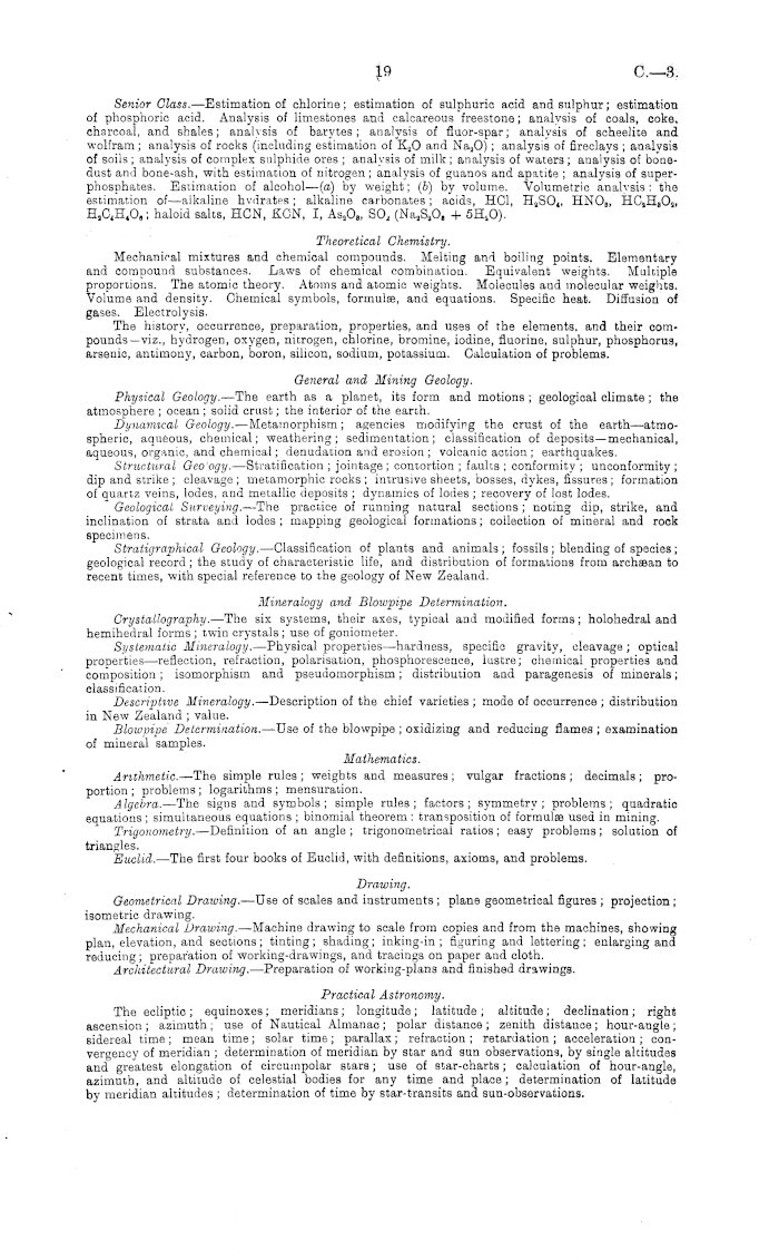 Senior Class. —Estimation of chlorine; estimation of sulphuric acid and sulphur; estimation of phosphoric acid. Analysis of limestones and calcareous freestone; analysis of coals, coke, charcoal, and shales; analysis of barytes; analysis of fluor-spar; analysis of scheelice and wolfram; analysis of rocks (including estimation of K 2 O and Na 2 O); analysis of fireclays ; analysis of soils ; analysis of complex sulphide ores ; analysis of milk ; analysis of waters ; analysis of bonedust and bone-ash, with estimation of nitrogen; analysis of guanos and apatite ; analysis of superphosphates. Estimation of alcohol— (a) by weight; (b) by volume. Volumetric analysis : the estimation of—alkaline hydrates ; alkaline carbonates; acids, HCI, Hj,SO 4 , HNO 8 , HC a H B Oi, H,C,H 4 0,; haloid salts, HCN, KCN, I, As 2 O 8 . SO, (Na,S a O, + 5H s 0). Theoretical Chemistry. Mechanical mixtures and chemical compounds. Melting and boiling points. Elementary and compound substances. Laws of chemical combination. Equivalent weights. Multiple proportions. The atomic theory. Atoms and atomic weights. Molecules and molecular weights. Volume and density. Chemical symbols, formulae, and equations. Specific heat. Diffusion of gases. Electrolysis. The history, occurrence, preparation, properties, and uses of the elements, and their compounds—viz., hydrogen, oxygen, nitrogen, chlorine, bromine, iodine, fluorine, sulphur, phosphorus, arsenic, antimony, carbon, boron, silicon, sodium, potassium. Calculation of problems. General and Mining Geology. Physical Geology. —The earth as a planet, its form and motions ; geological climate; the atmosphere ; ocean; solid crust; the interior of the earth. Dynamical Geology. —Metamorphism ; agencies modifying the crust of the earth—atmospheric, aqueous, chemical; weathering; sedimentation; classification of deposits—mechanical, aqueous, organic, and chemical; denudation and erosion ; volcanic action ; earthquakes. Structural Geoogy. —Stratification ; jointage ; contortion ; faults ; conformity ; unconformity; dip and strike ; cleavage ; metamorphic rocks ; intrusive sheets, bosses, dykes, fissures ; formation of quartz veins, lodes, and metallic deposits ; dynamics of lodes ; recovery of lost lodes. Geological Surveying. —The practice of running natural sections; noting dip, strike, and inclination of strata and lodes ; mapping geological formations; collection of mineral and rock specimens. Stratigraphical Geology. —Classification of plants and animals ; fossils; blending of species; geological record; the study of characteristic life, and distribution of formations from archaean to recent times, with special reference to the geology of New Zealand. Mineralogy and Blowpipe Determination. Crystallography. —The six systems, their axes, typical and modified forms; holohedral and hemihedral forms ; twin crystals ; use of goniometer. Systematic Mineralogy. —Physical properties—hardness, specific gravity, cleavage ; optical properties —reflection, refraction, polarisation, phosphorescence, lustre; chemical properties and composition; isomorphism and pseudomorphism; distribution and paragenesis of minerals; classification. Descriptive Mineralogy. —Description of the chief varieties ; mode of occurrence ; distribution in New Zealand ; value. Blowpipe Determination. —Use of the blowpipe ; oxidizing and reducing flames ; examination of mineral samples. Mathematics. Arithmetic. —The simple rules; weights and measures; vulgar fractions; decimals; proportion ; problems ; logarithms ; mensuration. Algebra.— -The signs and symbols; simple rules; factors; symmetry; problems; quadratic equations ; simultaneous equations ; binomial theorem : transposition of formula used in mining. Trigonometry. —Definition of an angle ; trigonometrical ratios; easy problems; solution of triangles. Euclid. —The first four books of Euclid, with definitions, axioms, and problems. Drawing. Geometrical Drawing. —Use of scales and instruments ; plane geometrical figures ; projection; isometric drawing. Mechanical Drawing. —Machine drawing to scale from copies and from the machines, showing plan, elevation, and sections; tinting; shading; inking-in ; figuring and lettering; enlarging and reducing; preparation of working-drawings, and tracings on paper and cloth. Architectural Drawing. —Preparation of working-plans and finished drawings. Practical Astronomy. The ecliptic ; equinoxes; meridians; longitude; latitude ; altitude; declination ; right ascension; azimuth; use of Nautical Almanac; polar distance ; zenith distance; hour-angle; sidereal time; mean time; solar time; parallax; refraction; retardation ; acceleration ; convergency of meridian ; determination of meridian by star and sun observations, by single altitudes and greatest elongation of circumpolar stars; use of star-charts; calculation of hour-angle, azimuth, and altitude of celestial bodies for any time and place; determination of latitude by meridian altitudes ; determination of time by star-transits and sun-observations.