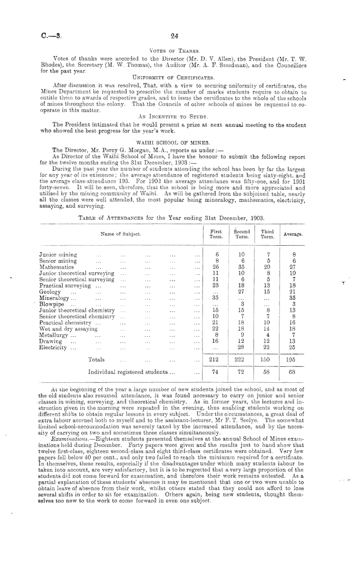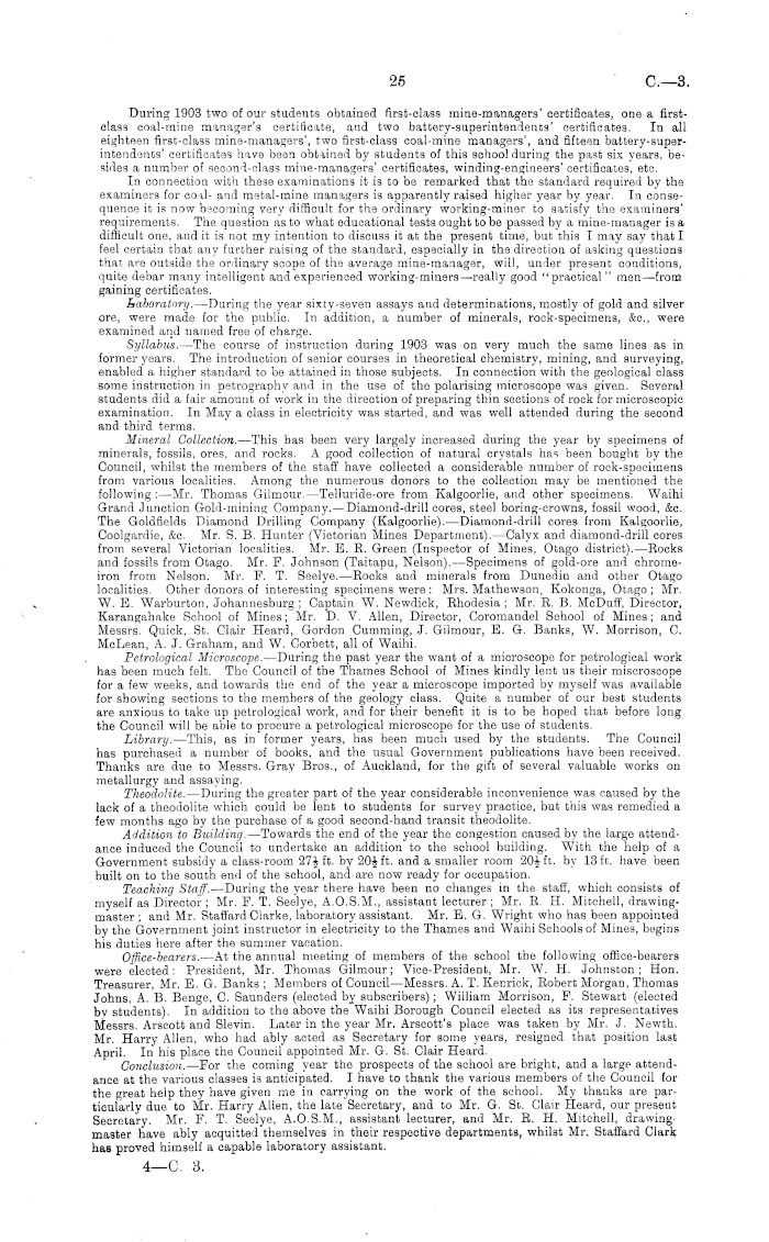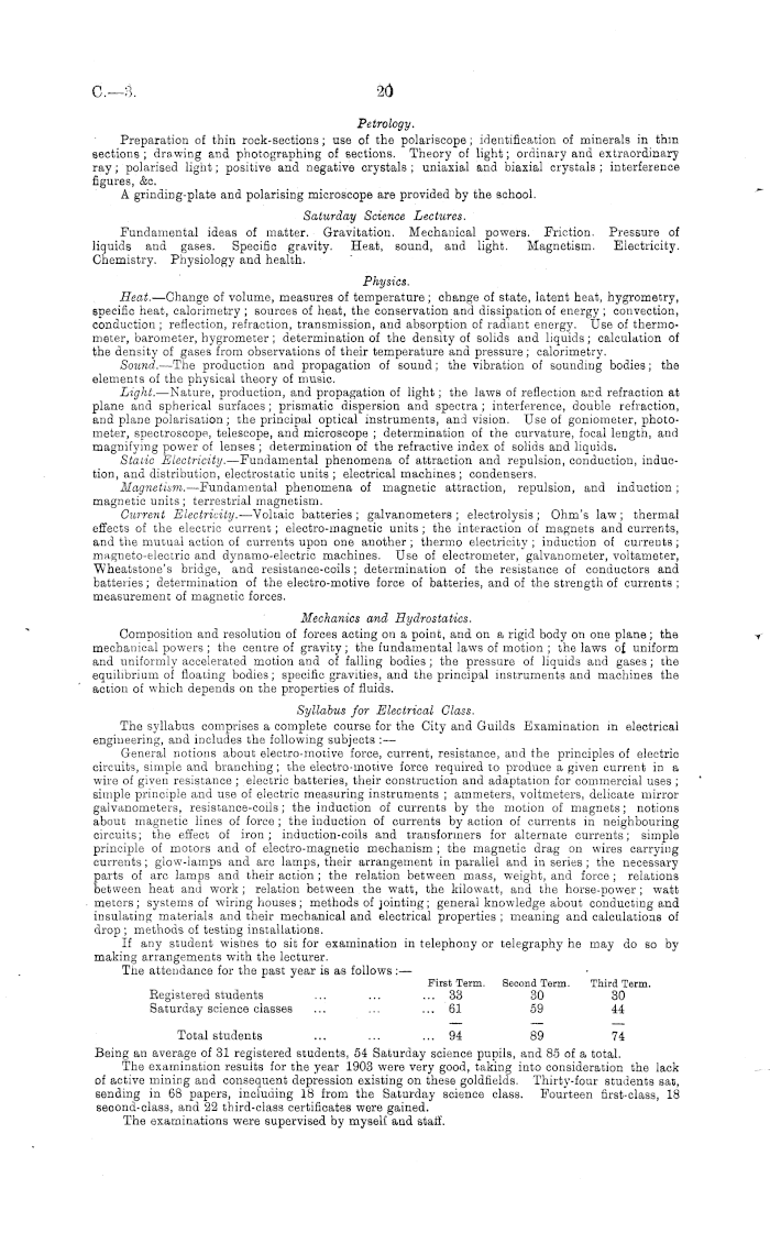Petrology. Preparation of thin rock-sections; use of the polariscope; identification of minerals in thin sections; drawing and photographing of sections. Theory of light; ordinary and extraordinary ray; polarised light; positive and negative crystals; uniaxial and biaxial crystals ; interference figures, &c. A grinding-plate and polarising microscope are provided by the school. Saturday Science Lectures. Fundamental ideas of matter. Gravitation. Mechanical powers. Friction. Pressure of liquids and gases. Specific gravity. Heat, sound, and light. Magnetism. Electricity. Chemistry. Physiology and health. Physics. Heat. —Change of volume, measures of temperature; change of state, latent heat, hygrometry, specific heat, calorimetry ; sources of heat, the conservation and dissipation of energy ; convection, conduction; reflection, refraction, transmission, and absorption of radiant energy. Use of thermometer, barometer, hygrometer ; determination of the density of solids and liquids; calculation of the density of gases from observations of their temperature and pressure; calorimetry. Sound. —The production and propagation of sound; the vibration of sounding bodies; the elements of the physical theory of music. Light. —Nature, production, and propagation of light; the laws of reflection and refraction at plane and spherical surfaces; prismatic dispersion and spectra; interference, double refraction, and plane polarisation; the principal optical instruments, and vision. Use of goniometer, photometer, spectroscope, telescope, and microscope ; determination of the curvature, focal length, and magnifying power of lenses ; determination of the refractive index of solids and liquids. Static Electricity. —Fundamental phenomena of attraction and repulsion, conduction, induction, and distribution, electrostatic units; electrical machines; condensers. Magnetism. —Fundamental phenomena of magnetic attraction, repulsion, and induction; magnetic units ; terrestrial magnetism. Current Electricity. —Voltaic batteries ; galvanometers ; electrolysis ; Ohm's law ; thermal effects of the electric current; electro-magnetic units; the interaction of magnets and currents, and the mutual action of currents upon one another ; thermo electricity ; induction of currents; magneto-electric and dynamo-electric machines. Use of electrometer, galvanometer, voltameter, "Wheatstone's bridge, and resistance-coils; determination of the resistance of conductors and batteries; determination of the electro-motive force of batteries, and of the strength of currents ; measurement of magnetic forces. Mechanics and Hydrostatics. Composition and resolution of forces acting on a point, and on a rigid body on one plane; the mechanical powers ; the centre of gravity; the fundamental laws of motion ; the laws of uniform and uniformly accelerated motion and of falling bodies ; the pressure of liquids and gases; the equilibrium of floating bodies; specific gravities, and the principal instruments and machines the action of which depends on the properties of fluids. Syllabus for Electrical Class. The syllabus comprises a complete course for the City and Guilds Examination in electrical engineering, and includes the following subjects : — General notions about electro-motive force, current, resistance, and the principles of electric circuits, simple and branching; the electro-motive force required to produce a given current in a wire of given resistance ; electric batteries, their construction and adaptation for commercial uses ; simple principle and use of electric measuring instruments ; ammeters, voltmeters, delicate mirror galvanometers, resistance-coils; the induction of currents by the motion of magnets; notions about magnetic lines of force ; the induction of currents by action of currents in neighbouring circuits; the effect of iron; induction-coils and transformers for alternate currents; simple principle of motors and of electro-magnetic mechanism ; the magnetic drag on wires carrying currents; glow-lamps and arc lamps, their arrangement in parallel and in series ; the necessary parts of arc lamps and their action ; the relation between mass, weight, and force ; relations between heat and work; relation between the watt, the kilowatt, and the horse-power; watt meters ; systems of wiring houses ; methods of jointing ; general knowledge about conducting and insulating materials and their mechanical and electrical properties ; meaning and calculations of drop ; methods of testing installations. If any student wishes to sit for examination in telephony or telegraphy he may do so by making arrangements with the lecturer. The attendance for the past year is as follows: — First Term. Seoond Term. Third Term. Eegistered students ... ... ... 33 30 30 Saturday science classes ... ... ... 61 59 44 Total students ... ... ... 94 89 74 Being an average of 31 registered students, 54 Saturday science pupils, and 85 of a total. The examination results for the year 1903 were very good, taking into consideration the lack of active mining and consequent depression existing on these goldfields. Thirty-four students san, sending in 68 papers, including 18 from the Saturday science class. Fourteen first-class, 18 second-class, and 22 third-class certificates were gained. The examinations were supervised by myself and staff.