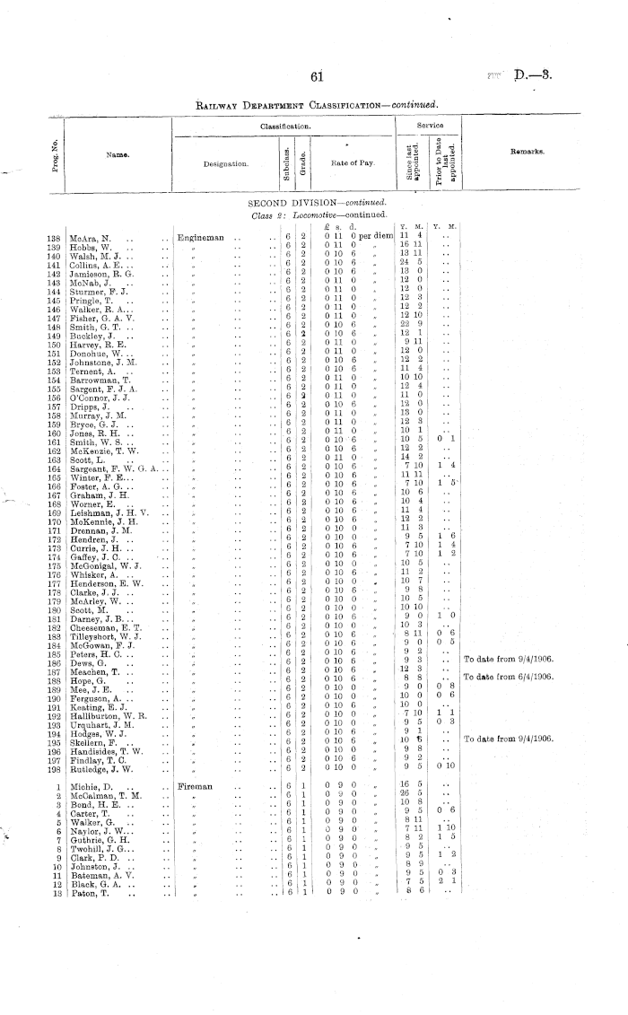 83,886MEMBERS OF THE RAILWAY DEPARTMENT: LIST SETTING OUT IN ORDER OF CLASSIFICATION THE NAME, STATUS, AND PAY OF EACH MEMBER, AND THE NUMBER OF YEARS HE HAS BEEN IN THE SERVICE OF THE DEPARTMENT ON 1st APRIL, 1906. Appendix to the Journals of the House of Representatives, 1906 Session II, D-03