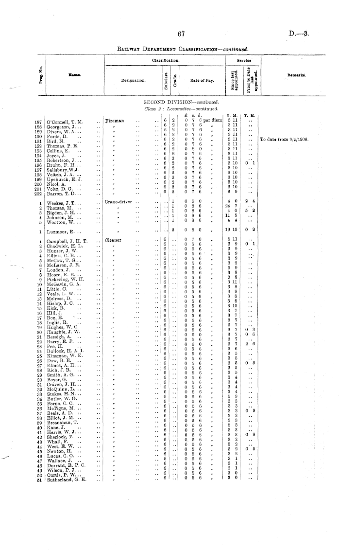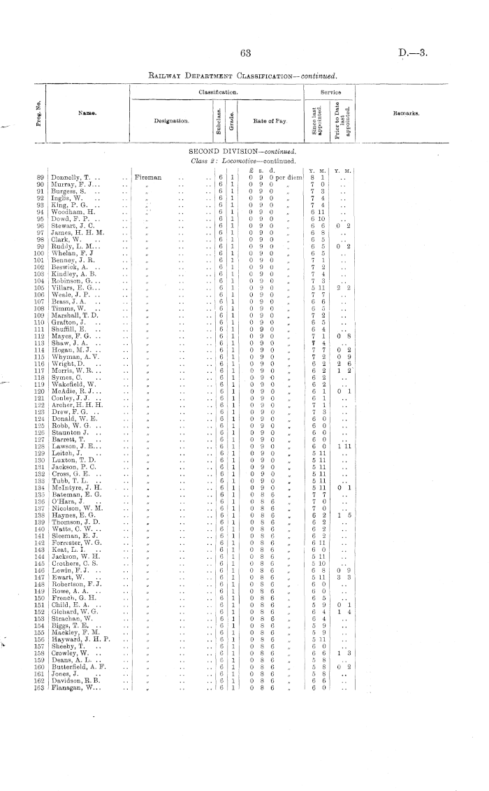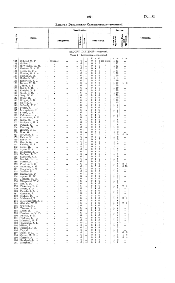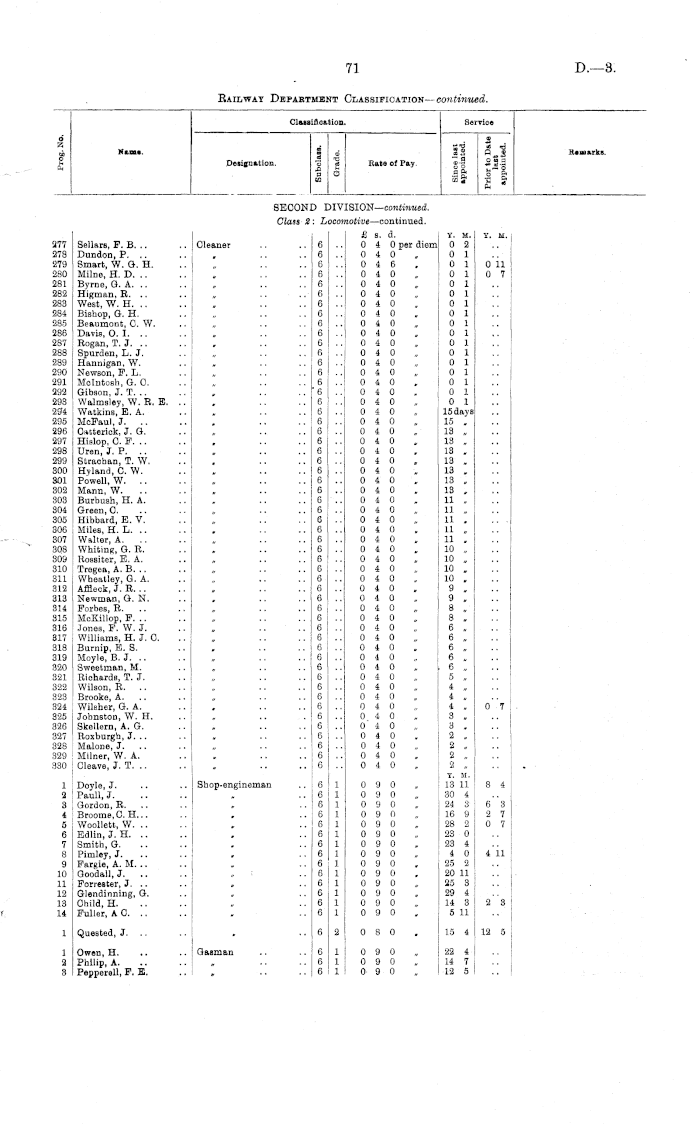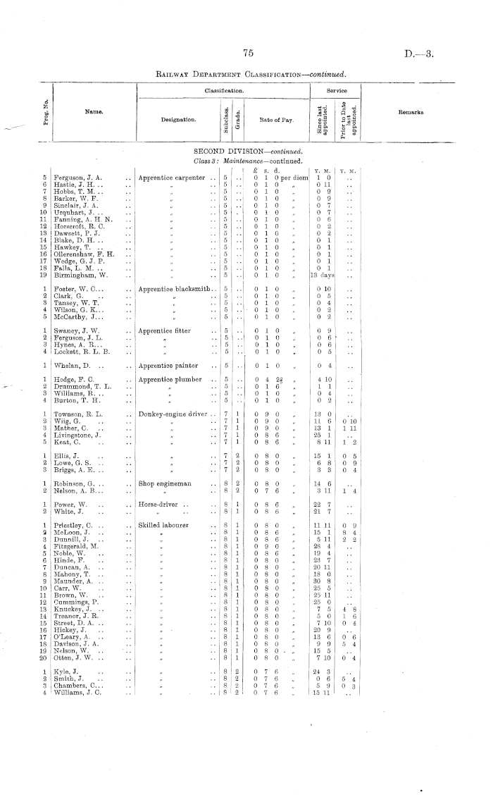 Classification. Service d X O I Nam*. m | .a 3 CO ■a i Bali* of Pay. © it hi •Sg 3 a Remarks. Designation. SECOl D iIV BION— continued. Class i : oco\ notive —oontinued. 4 5 Clark, J. A. .. Hodgson, T. .. Gasman 6 6 1 1 £ s. d. 0 9 0 per diem 0 9 0 Y. II. 9 1 13 8 Y. M. 1 2 Crawley, J. A. M. Toner, E. S. .. 6 6 2 2 0 8 0 0 8 0 8 9 4 0 s"6 1 2 3 Roxborough, R. Rickards, W. .. Watson, T Watchman « • ■ . ■ 7 7 7 2 2 0 per week 2 2 0 2 2 0 18 1 21 11 4 0 5*1 1 2 3 4 5 6 7 8 9 Bowman, 0. R. O'Neill, D. .. Ireland, H. D. Jones, E. W. .. Brown, D. Fuller, W. B Price, J. Hall, W. E. .. Kelly, H. Junior machinist lifter .. machinist 7 7 7 7 7 7 7 7 7 0 7 0 per diem 0 7 0 0 7 0 0 7 0 0 7 0 0 6 0 0 6 0 0 6 0 0 4 6 4 0 4 0 4 0 3 0 4 0 4 0 4 0 4 0 2 0 3 9 3 4 3 8 2 6 1 3 1 6 2 3 2 3 , holder-up „ lifter „ machinist 1 2 3 Hayes, E. R. .. Anderson, D. K. Mussen, L. .. Junior labourer 7 7 7 0 5 6 0 5 6 0 5 0 8 9 3 1 2 10 1 7 0 6 MoKay, H Jenkins, T. Thompson, F. Snaddon, A. .. Burnett, K. .. Eccles, R. Nelson, R. Rodgers, W. .. Pennefather, 0. B. Drummond, J. M. King, J. Cooper, J. Blanch, J. Holmes, J. T. Waterhouse, W. J. T. Cox, W. M. .. Orange, W. .. Orange, A. E. .. Shardlow, J. R. Smith, G. H. .. Lysaght, E. .. Bowden, J. Dashwood, J. H. Alexander, J. .. McKay, J. Morgon, A. Rodgers, E. J. MoGarva, T. F. Sbarpin, W. H. ,. Chapman, A. .. Strong, G. Caldow, R. T. .. Class 3: Maintei met 0 12 0 per diem 0 12 0 0 12 0 0 12 0 0 12 0 0 12 0 0 12 0 0 12 0 0 12 0 0 12 0 0 12 0 0 12 0 0 12 0 0 12 0 0 12 0 0 12 0 0 12 0 0 12 0 0 12 0 0 12 0 0 12 0 0 12 0 0 12 0 0 11 6 0 11 6 0 11 6 0 11 6 0 11 6 0 11 6 0 11 6 0 11 6 0 11 6 31 8 22 10 20 3 21 8 13 4 24 6 9 0 14 11 19 11 14 6 14 10 23 4 7 5 11 0 12 8 6 7 16 8 11 0 10 5 8 8 30 9 9 0 14 9 24 4 15 1 10 11 22 5 19 3 6 2 5 6 13 0 9 6 1 2 3 4 5 6 7 8 9 10 11 12 13 14 15 16 17 18 19 20 21 22 23 24 25 26 27 28 29 30 31 32 Leading carpenter 1 1 1 1 1 1 1 1 1 1 1 1 1 1 1 1 1 1 1 1 1 1 1 1 1 1 1 1 1 1 1 1 0 - 2 0 11 7 io 6 4 0 3 0 4 2 2 0 7 1 8 2 7 2"9 ii io 0 8 2"3 4 7 10 1 1 2 3 4 5 Graydon, J. .. Hopkirk, R. A. Russell, J. S. .. Chisholm, W. .. De Thierry, G. H. 1 1 1 1 1 2 2 2 2 2 0 11 6 0 11 6 0 11 6 0 11 0 0 11 0 9 0 15 6 10 6 18 7 20 7 2 9 0 1 2 3 1 Walker, J Leading mason 1 1 0 12 0 16 0 8 0 1 Bason, W. J. .. Leading bricklayer 1 1 0 12 0 12 3 1 2 3 4 5 Crawford, R. .. Jory,G. Gibb, H Bennett, A. J. Pritchard, M... Leading blacksmith 1 1 1 1 1 1 1 1 1 1 0 12 0 0 12 0 0 12 0 0 12 0 0 11 6 20 10 28 5 23 3 22 8 19 3 0 2 0 - 8 1 9 1 Harrington, J. Leading fitter.. 1 2 0 11 0 20 0