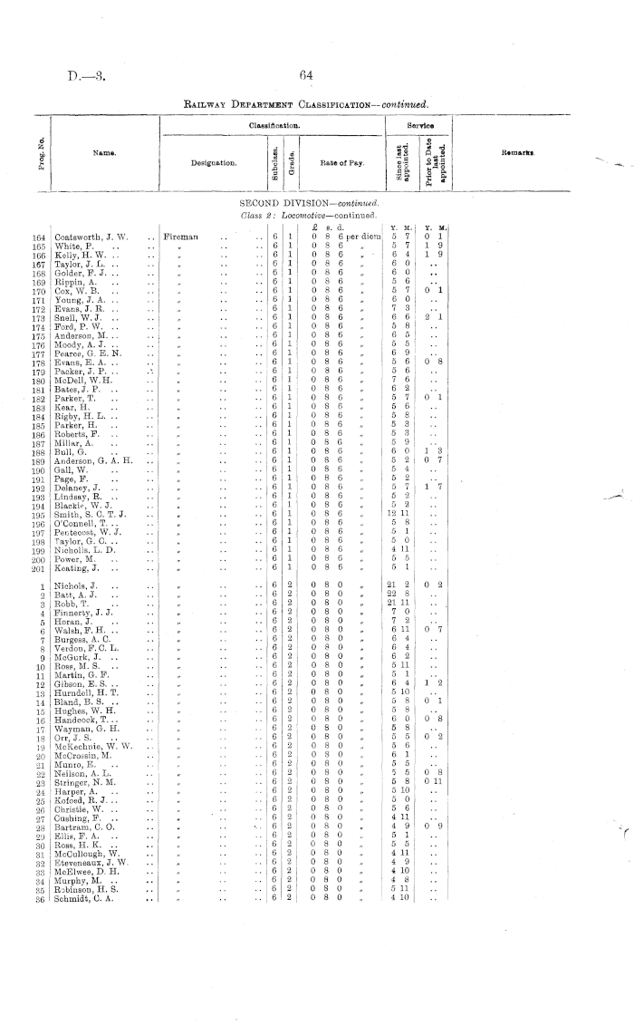 Classification. Service 6 i »h 3 3 D O 02 -id 32 ©■9 o o a ft w « «* f_n © 05a ■+■* ri'S Nam*. Remarks, Designation. Rate of Pay. seco: D >ri r ISION— continued. Class I; 1OC1 'motive —oontinued. 202 203 204 205 206 207 208 209 210 211 212 213 214 215 216 217 218 319 220 221 222 223 224 225 226 227 228 229 230 231 232 233 234 235 236 237 238 239 240 241 242 243 244 245 246 247 248 249 250 251 252 253 254 255 256 257 258 259 260 261 262 263 264 265 266 267 268 269 270 271 272 273 274 275 276 Bell, J. H. C. Bradley, R. G. 0. V. Denham, F. 0. McMullen, M. 3. Pascoe, 0. A. .. Bums, F. H. .. Wright, J. H, Muirhead, J. .. Rasmussen, 0. L. M. Kerr, 0. V. .. Hiokey, J. E. P. Bright, J. T. .. Morgan, W. J. Faville, A. E... Ryan, 0. Easton, H. Hennessy, J. .. Summerhays, A. F. Millard, W. O. Webb, T. O. .. Teasdale, J. W. Anderson, E. L. Meyenberg, W. V. Olsen, A. J. Philpott, A. O. Burt, A. O. Walker. J. .. Trillo, G. 3. .. Vincent, E. .. Sim, J. H. Egan, J. McLoughlin, P. J. Henderson, R. Leathwick, J. Ryan, J. M. .. Dawson, T. G. Laird, A.M... Hastedt, K. G. Hume, 0. J. W. Homann, L. R. Schmelz, H. A. McDonnell, C. J. Weir, R. Brown, W. J. H. Silvester, O. E. M. Kruskopf, S. E. W. Rodgers, J. Bentley, 3. Farrell, L. Browne, M. G. Corbett, W. E. Gill, W. E. H. Neville, J. Casey, J. E. .. Collins, J. P. .. Goble, I. Henry, T. J. .. Keen, C. Rodgers, D. .. Hamilton, G.B, Ross, H. H. .. Mooney, G. .. Dalziel, W. M. Lincoln, J. L. West, C. V. .. Henderson, J. M. Grinter, T. .. Pardington, F. G. Donohue, T. .. Hickey, A. Middlemass, V. 0. Scott, F. W. .. Harrington, 0. R. Sadd, W. H Moore, 3. T. .. Gleaner 6 6 6 6 6 6 6 6 6 6 6 6 6 6 6 6 6 6 6 6 6 6 6 6 6 6 6 6 6 6 6 6 6 6 0 6 0 6 6 6 6 6 6 6 6 6 6 6 6 6 6 6 6 0 6 6 6 6 6 6 6 6 6 6 6 6 6 6 6 6 6 6 6 6 6 £ s. d. i 0 4 6 per diemJ 0 4 6 . 0 4 6 0 4 6 0 4 6 0 4 6 0 4 6 0 4 6 0 4 6 0 4 6 0 4 6 0 4 6 0 4 6 0 4 6 0 4 6 0 4 6 0 4 0 0 4 0 0 4 0 0 4 0 0 4 6 0 4 6 0 4 0 0 4 0 0 4 6 0 4 0 0 4 0 0 4 0 0 4 0 0 4 0 0 4 0 0 4 6 , 0 4 0 0 4 0 0 4 6 . 0 4 0 0 4 0 , 0 4 0 0 4 0 0 4 0 0 4 0. 0 4 6 0 4 0 0 4 0 0 4 0 0 4 0 0 4 0 0 4 0 0 4 0 0 4 0 0 4 0 0 4 0 0 4 0 0 4 0 0 4 0 0 4 0 0 4 0 0 4 0 0 4 0 0 4 0 0 4 0 0 4 0 0 4 0 0 4 0 0 4 0 0 4 0 0 4 0 0 4 0, 0 4 0 0 4 0 0 4 0 0 4 0 0 4 0 0 4 0 0 4 0 Y. M. 1 2 1 2 1 2 1 2 1 1 1 1 1 1 1 1 1 1 1 1 1 1 1 1 1 0 1 0 1 0 1 0 1 0 0 11 0 11 0 11 0 11 0 11 0 11 0 11 0 11 0 11 0 10 0 10 0 10 0 10 0 10 0 10 0 10 0 10 0 10 0 9 0 9 0 9 0 9 0 8 0 7 0 7 0 7 0 7 0 7 0 7 0 7 0 7 0 6 0 5 0 5 0 5 0 5 0 5 0 5 0 4 0 3 0 3 0 3 0 3 0 3 0 3 0 3 0 3 0 3 0 2 0 2 0 2 0 2 0 2 0 2 0 2 0 2 0 2 0 2 Y. M. 0 4 0 8 o"2 o"9 i"o i"s 0 2 o"i 0 - 2 o"9 o"5 0 1 l"6 o"7 o"7 o'io o"9 1 1