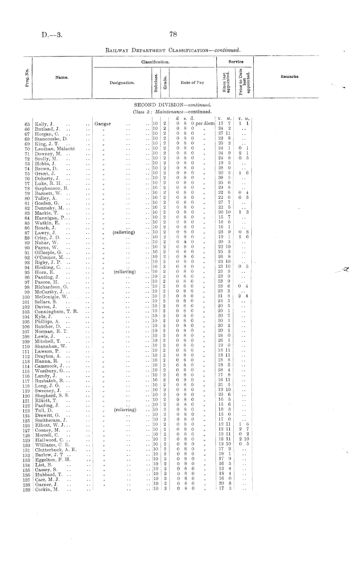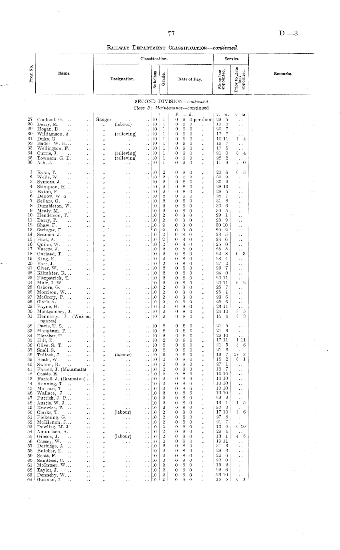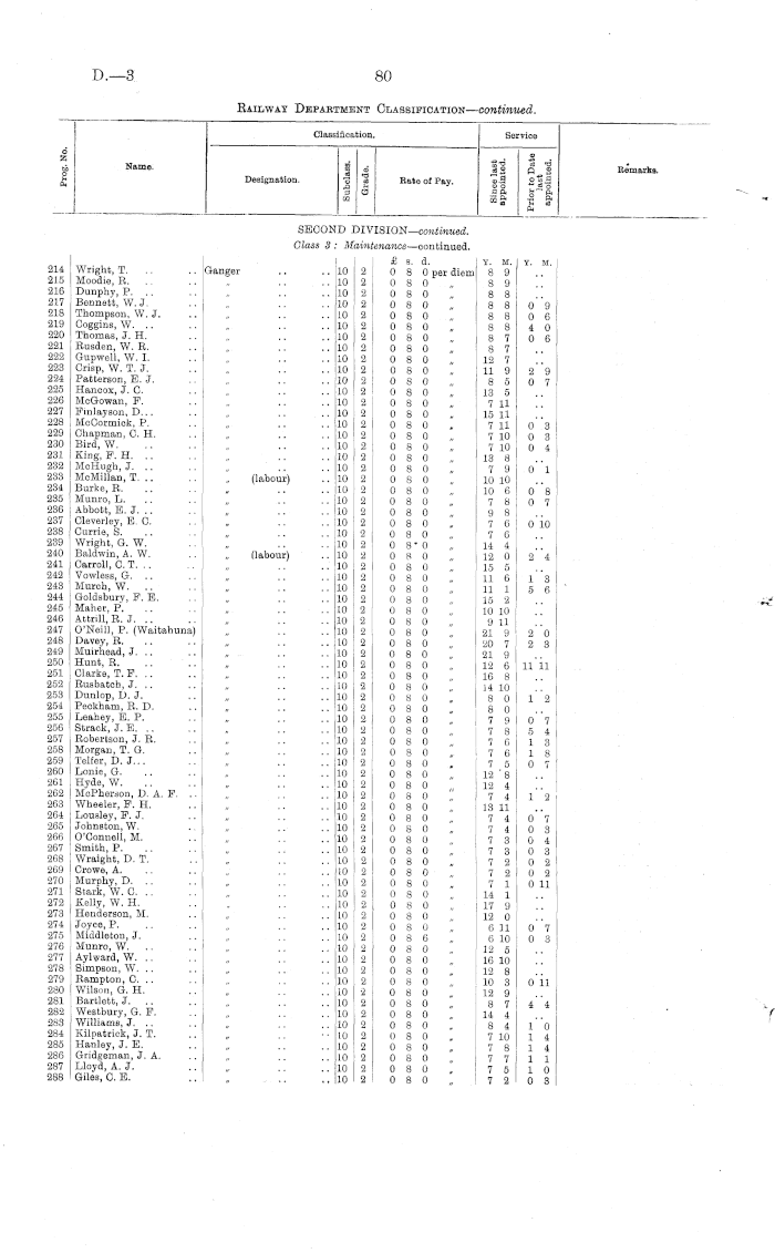 Class: Ifica! lion. Service d A A o ft ft Name. CO CO d a J2 a QQ a ■o o) ft o Rate of Pay. a ■5,03 cd 03 3$ 02 a .9 ° "1.9 oj o ** <3 o oft ft- a B a .8 a * P * ft Remarks. Designation. SECON DIV ISION — continued. Class 3 r .aint 'enance —continued. 189 190 191 192 193 194 195 190 197 198 199 500 501 502 503 104 105 100 107 103 109 110 111 !12 113 514 115 110 117 118 119 120 121 Austin, A. Tobeek, P. .. Burns, J. Jones, H. E. .. Bennett, J. E. Hardy, T. M. .. Osborne,' J. Murphy, 0. .. Phelan, J. A... Moore, E. R. .. McLaren, D. .. McCullough, J. Morrison, T. .. Murdoch, A. J. Lee, W. J. Leatham, C.J, Huckstep, H. J. Pinlay, J. Cheeseman, O. Evans, T. Gorkery, J. Work, W, N. .. Pringle, W. .. Jephcoate, T. O'Neill, P. (Granity) .. Edmonds, W. Hodgson, R. .. Hale, O. Stringer, C. H. McCallum, A. G. Morgan, F. G. Elliott, G. Syme, W. Ganger 10 10 10 10 10 10 10 10 10 10 10 10 10 10 10 10 10 10 10 10 10 10 10 10 10 10 10 10 10 10 10 10 10 2 2 2 2 2 2 2 2 2 2 2 2 2 2 2 2 2 2 2 2 2 2 2 2 2 2 2 2 2 2 2 2 2 £ s. d. 0 8 0 per diem 0 8 0 0 8 0 0 8 0 0 8 0 0 8 0 0 8 0 0 8 0 0 8 0 0 8 0 0 8 0 0 8 0 0 8 0 0 8 0 0 8 0 0 8 0 0 8 0 0 8 0 0 8 0 0 8 0 0 8 0 0 8 0 0 8 0 0 8 0 0 8 0 0 8 0 0 8 0 0 8 0 0 8 0 0 8 0 0 8 0 0 8 6 0 8 0 Y. M. 6 11 6 10 6 10 11 9 6 8 6 7 6 7 6 7 11 6 6 4 6 4 6 4 6 4 6 3 12 11 12 5 9 0 11 1 8 8 8 0 6 2 6 2 6 1 6 0 6 0 5 11 5 11 5 10 5 10 5 9 5 9 11 4 11 0 Y. M. 0 11 0 1 0 7 0 6 1 8 1 5 0 2 0 9 0 8 0 7 0 1 0 8 1 9 0 8 2 4 .1 0 0 3 2 10 0 5 0 5 1 2 1 4 0 2 0 10, 0 4 1 2 0 5 (labour) 2*0 1 2 3 4 5 6 7 8 9 10 11 12 13 14 15 16 17 18 19 20 21 22 23 24 25 26 27 28 29 30 31 32 33 34 35 30 37 38 39 40 41 42 43 Patrick, A. Huddlestone, R. J. Pachnatz, F. .. Livingstone, J. O'Keefe, J. Dillicar, J. H. Skinner, G. .. Treanor, H. .. Hamilton, R. .. Duncan, W. .. Patterson, R. J. McPherson, C Walker, J. Olds, J. G. Cook, T. Cussen, M. .. Walsh, L. Wood, G. Tomlin.E. O'Keeffe, A. .. Parker, G. E. P. Aitken, W. (58 M.L.) .. Harris, J. Sleeman, J. .. Pert, J. McGahan, J. .. Walton, J. Cameron, J. .. Duncan, R. (Dunedin).. Duncan, J. Staunton, J. .. Staunton, T. .. Griffith, J. Garrard, G. .. Smith,!. Cameron, S. .. Sutton, J. Quigley, N. .. Serpless, J. Pinlay,D. Bryant, E. Newman, W. Thomas, J. H... Surfaoeman Fencer Surfaceman Labourer Surfaceman Surfaceman-miner Surfaoeman 11 11 11 11 11 12 11 11 11 11 11 11 1.1 11 13 11 11 1.1 1.1 1.1 11 11 11 11 11 11 11 11 11 11 11 11 11 11 II 11 11 11 11 11 11 11 11 i 0 7 0 0 7 0 0 7 0 0 7 0 0 7 0 0 7 6 0 7 0 0 7 0 0 7 0 0 7 0 0 7 0 0 7 0 0 7 0 0 7 0 0 7 0 0 7 0 0 7 0 0 7 0 0 7 0 0 7 0 0 8 0 0 7 0 0 7 0 0 7 0 0 7 0 0 7 0 0 7 0 0 7 0 0 7 6 0 7 0 0 7 6 0 7 0 0 7 0 0 7 0 0 7 0 0 7 0 0 7 0 0 7 0 0 7 0 0 7 0 0 7 0 0 7 0 0 7 0 31 9 15 4 29 10 12 9 16 7 7 10 12 11 5 0 13 4 16 6 12 2 20 3 10 9 25 0 25 2 22 8 23 11 15 6 19 5 15 0 10 0 14 0 12 6 31 9 31 4 30 10 30 9 30 7 30 7 30 5 30 3 30 0 29 11 29 10 29 10 29 10 29 7 29 2 29 1 29 0 28 5 28 3 28 2 2'io 1 7 2 8 1 5 2 1 o"i 0 2 o"2 1 0 2 7 2 0