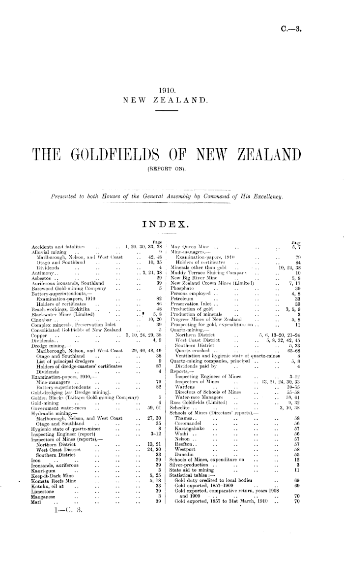 THE GOLDFIELDS OF NEW ZEALAND (REPORT ON)., Appendix to the Journals of the House of Representatives, 1910 Session I, C-03