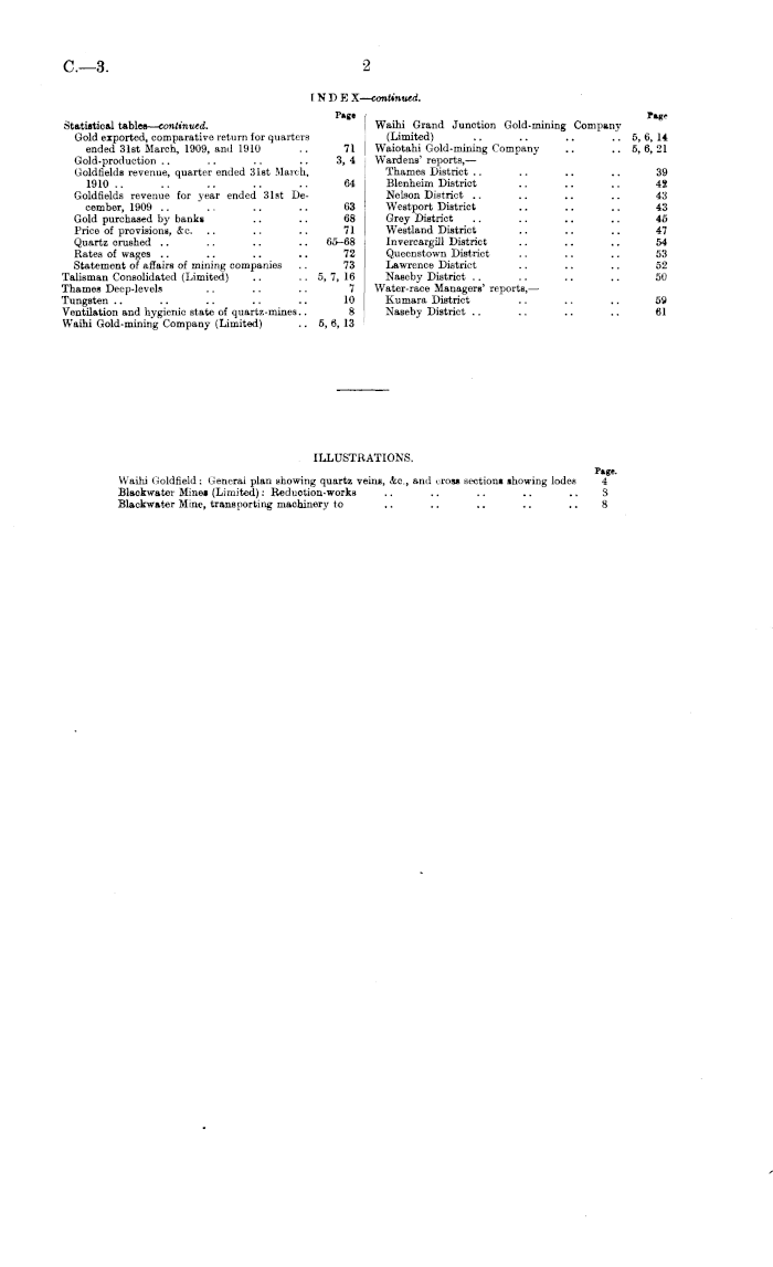 I **R' Waihi Grand Junction Gold-mining Company (Limited) .. .. .. .. 5, 6, 14 Waiotahi Gold-mining Company .. .. 5, 6, 21 Wardens' reports,— Thames District .. .. .. .. 39 Blenheim Distriot .. .. .. 48 Nelson District .. .. .. .. 43 Westport District .. .. .. 43 Grey District .. .. .. .. 46 Westland District .. .. .. 47 Invercargill District .. .. .. 54 Queenstown District .. .. .. 53 Lawrence District .. .. .. 52 Naseby District .. .. .. .. 50 Water-race Managers' reports, — Kumara District .. .. .. 59 Naseby District .. .. .. .. 61