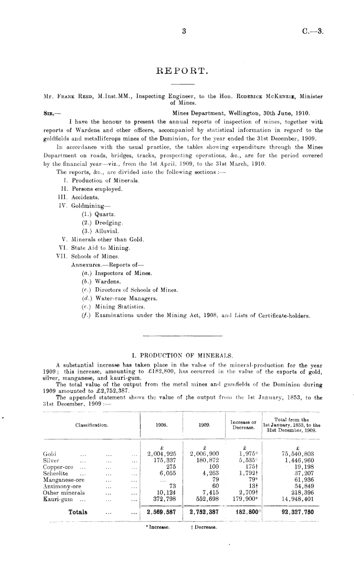 REPOET. Mr. Fkank Reed, M.lnst.MM., Inspecting Engineer, to the Hon. Roderick McKenzie, Minister of Mines. Sir, — Mines Department, Wellington, 30th June, 1910. I have the honour to present the annual reports of inspection of mines, together with reports of Wardens and other officers, accompanied by statistical information in regard to the goldfields and metalliferous mines of the Dominion, for the year ended the 31st December, 1909. In accordance with the usual practice, the tables showing expenditure through the Mines Department on roads, bridges, tracks, prospecting operations, &c, are for the period covered by the financial year—viz., from the Ist April, 1909, to the 31st March, 1910. The reports, &c, are divided into the following sections : —■ 1. Production of Minerals. 11. Persons employed. 111. Accidents. IV. Goldmining— (1.) Quartz. (2.) Dredging. (3.) Alluvial. V. Minerals other than Gold. VI. State Aid to Mining. VII. Schools of Mines. Annexures. —Reports of — (a.) Inspectors of Mines. (b.) Wardens. (c.) Directors of Schools of Mines. (d.) Water-race Managers, (c.) Mining Statistics. (/.) Examinations under the Mining Act, 1908, and Lists of Certificate-holders.