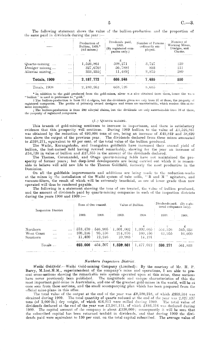Northern Inspection District. Waihi Goldfield.- -Waihi Cold-mining Company (Limited): By the courtesy of Mr. H. P. Barry, M.lnst.M.M., superintendent of the company's mine and operations, I am able to present cross-sections showing the remarkable vein system operated upon at this mine, these sections have never previously been published. The magnitude and unique characteristics of this the most important gold-mine in Australasia, and one of the greatest gold-mines in the world, will be at once seen from these sections, and the small accompanying plan which has been prepared from the official mine-plans in this office. The total value of the output at the end of the year was £8,180,218, of which £959,594 was obtained during 1909. The total quantity of quartz reduced at the end of the year was 2,827,137 tons (of 2,000 Ib.) dry weight, of which 416,813 were milled during 1909. The total value of dividends declared at the end of the year was £3,561,111, of which £446,316 was declared during 1909. The capital account of the company is about £330,000; consequently it will be seen that the subscribed capital has been returned tenfold in dividends, and that during 1909 the dividends paid were equivalent to 130 per cent, on the total capital subscribed. The average value of