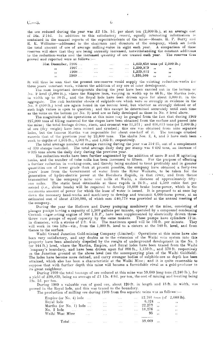 the ore reduced during the year was £2 13s. Id. per short ton (2,0001b.), at an average cost of 16s. 214 d. In addition to this satisfactory record, equally interesting information is contained in the annual reports of the superintendents of the mine—Messrs. H. P. Barry and R. E. Williams—addressed to the chairman and directors of the company, which set forth the total amount of ore of average milling-value in sight each year. A comparison of these reserves will show that they are being annually increased, notwithstanding the constant additions to the reduction-works and the increased quantity of ore treated each year. The reserve* thus proved and reported were as follows : — 31st December, 1906 ... ... ... ... 1,029,658 tons (of 2,000 lb.; 1907 1,299,979 „ 1908... ... ... ... 1,329,872 „ 1909... ... ... ... 1,335,586 „ Jt will thus be seen that the present ore-reserve would supply the existing reduction-works for three years' constant work, without the addition of any ore of later development. The most important developments during the year have been carried out in the bottom or No. 9 level (1,000 11.), where the Empire lode, varying in width up to 46 ft., the Martha lode, ill width up to 80 ft., and the Royal lode have been driven upon for about 3,000 ft. in the aggregate. The rich lenticular shoots of sulphide-ore which were so strongly in evidence in the No. 8 (850 ft.) level are again found in the bottom level, but whether as strongly defined or of such high values is open to question; and this cannot be determined accurately until such time as the veins on the bottom (or No. 9) level are as fully developed as those in No. 8 level above. The magnitude of the operations at this mine may be gauged from the fact that during 1909 227,000 tons of filling material for the stopes have been obtained from the surface and passed into the mine; the total footage driven, risen, and crosscut was 11,571; and 416,813 tons (of 2,000 lb.) of ore (dry weight) have been mined and crushed; this ore was obtained from nine separate lodes, but tiie famous Martha was responsible for about one-half of it. The tonnage crushed exceeds that of the previous year by 23,600 tons. The shafts Nos. 2, 4, and 5 have each been sunk to depths of 1,075 ft., 1,002 ft., and 1,035 ft. respectively. The total average number of stamps running during the year was 31425, out of a complement ol 330 stamps installed. The total average daily duty per stamp was 1492 tons, an increase of 0*325 tons above the daily duty during the previous year. The reduction-works have been further augmented by the addition of more B and M agitating tanks, and the number of tube mills has been increased to fifteen. For the purpose of effecting a further reduction in working-costs, and thereby being enabled to treat profitably and in greater quantities ore of lower grade than at present possible, the company have obtained a forty-two years lease from the Government of water from the River Waikato, to be taken for the generation of hydro-electric power at the Horahora Rapids, in that river, and from thence transmitted to the company's mine and mills at Waihi, a distance of approximately fiftyone miles. The static head obtainable at these rapids is 24 ft., and 4,580 cubic feet per second (i.e., sluice heads) will be required to develop 10,000 brake horse-power, which is the maximum amount of power for which the lease of water is issued. It is proposed to at once lay down the necessary head-works and machinery to develop and transmit 6,000-horse power, at an estimated cost of about £150,000, of which sum £40,778 was provided at the annual meeting of the company. During the year the Hathorn and Davey pumping machinery at the mine, consisting of plunger puaps having a capacity of 1,500 gallons per minute, operated by a compound condensing Cornish smgte-aoting engine of 900 1.H.P., have been supplemented by electrically driven threethrow ram pumps of equal capacity by the same makers. These pumps have cylinders 12 in. in diameter, with a stroke of 2 ft. 6 in. The maximum speed will be 105 ft. per minute. They will work in two lifts —viz., from the I,oooft. level to a cistern at the 540 ft. level, and from thence to the surface. Waihi (irand Junction Gold-mining Company (Limited): Operations at this mine have also been very satisfactory, and any doubts as to the extension of the Waihi vein system into this property have been absolutely dispelled by the results of underground development in the No. 5 (or 944 ft.) level, where the Martha, Empire, and Royal lodes have been traced from the Waihi Jompany's boundary, and have been driven upon for 800 ft., 1,150 ft., and 570 ft. respectively in the Junction ground at the above level (see the accompanying plan of the Waihi Goldfield). The lodes have become more defined, and carry stronger bodies of sulphide-ore as depth has been attained, which also has been a characteristic at the Waihi Mine; and it is quite reasonable to suppose that with further depth this mine will become a formidable rival as a gold-producer to its great neighbour. During 1909 the total tonnage of ore reduced at this mine was 59,609 long tons (2,240 lb.), for a yield of £99,839, being an average of £1 13s. 4"Bd. per ton, the cost of mining and treating being 19s. 2d. per ton. During 1909 a valuable run of good ore, about 120 ft. in length and 15 ft. in width, wai pioved in the Royal lode, and this was traced to the boundary. The production of milling ore during 1909 from five separate veins was as follows : — Empire (or No. 4) lode ... ... ... ... 12,701 tons (of 2,0001b). Royal lode ... ... ... ... ... 6,324 ~ Martha (or No. 1) lode ... ... ... ... 22,273 ~ No. 2 lode ... ... ... ... ••• 18,276 ~ Waihi West Mine ... ... ... •■• 95 ~ ~ Total ... ... ... .. ■■• 59,669 „