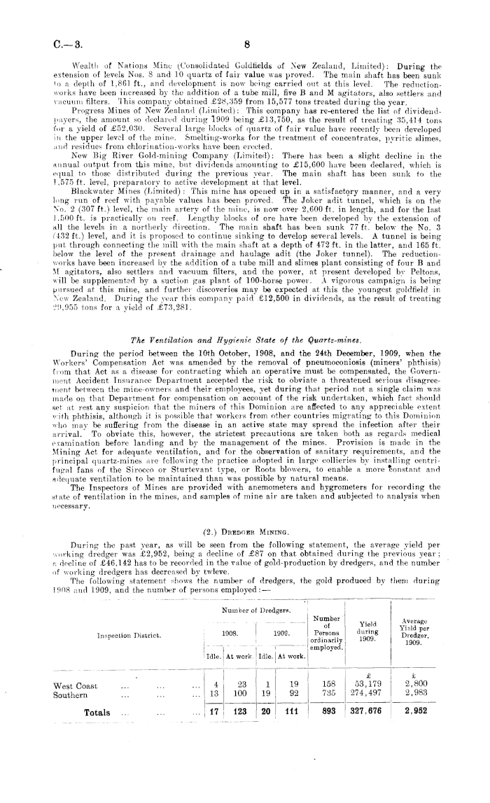 Wealth of Nations Mine (Consolidated Goldfields of .New Zealand, Limited): During the extension of levels Nos. 8 and 10 quartz of fair value was proved. The main shaft has been sunk to a depth of 1,861 ft., and development is now being carried out at this level. The reductionworks have been increased by the addition of a tube mill, five B and M agitators, also settlers and vacuum filters. This company obtained £28.359 from 15,577 tons treated during the year. Progress Mines of New Zealand (Limited): This company has re-entered the list of dividendpayers, the amount so declared during 1909 being £13,750, as the result of treating 35,414 tons for a yield of £52,030. Several large blocks of quartz of fair value have recently been developed in the upper level of the mine. Smelting-works for the treatment of concentrates, pyritie slimes, find residues from chlorination-works have been erected. New Big River Gold-mining Company- (Limited): There has been a slight decline in the annual output from this mine, but dividends amounting to £15,600 have been declared, which is equal to those distributed during the previous year. The main shaft has been sunk to the 1.575 ft. level, preparatory to active development at that level. Blackwater Mines (Limited) : This mine has opened up in a satisfactory manner, and a very long run of reef with payable values has been proved. The Joker adit tunnel, which is on the No. 2 (307 ft.) level, the main artery of the mine, is now over 2,600 ft. in length, and for the last 1,500 ft. is practically on reef. Lengthy blocks of ore have been developed by the extension of all the levels in a northerly direction. The main shaft has been sunk 77 ft. below the No. 3 (432 ft.) level, and it is proposed to continue sinking to develop several levels. A tunnel is being put through connecting the mill with the main shaft at a depth of 472 ft. in the latter, and 165 ft. helow the level of the present drainage and haulage adit (the Joker tunnel). The reductionworks have been increased by the addition of a tube mill and slimes plant consisting of four B and M agitators, also settlers and vacuum filters, and the power, at present developed by Peltons, will be supplemented by a suction gas plant of 100-horse power. A vigorous campaign is being pursued at this mine, and further discoveries may be expected at this the youngest goldfield in \i \\ Zealand. During the year this company paid £12,500 in dividends, as the result of treating 29,955 tons for a yield of £73,281. The Ventilation and Hygienic State of the Quartz-mines. During the period between the 10th October, 1908, and the 24th December, 1909, when the Workers' Compensation Act was amended by the removal of pneumoconiosis (miners' phthisis) from that Act as a disease for contracting which an operative must be compensated, the Government Accident Insurance Department accepted the risk to obviate a threatened serious disagreement between the mine-owners and their employees, yet during that period not a single claim was made, on that Department for compensation on account of the risk undertaken, which fact should set at rest any suspicion that the miners of this Dominion are affected to any appreciable exteid with phthisis, although it is possible that workers from other countries migrating to this Dominion who may be suffering from the disease in an active state may spread the infection after their arrival. To obviate this, however, the strictest precautions are taken both as regards medical examination before landing and by the management of the mines. Provision is made in the Mining Act for adequate ventilation, and for the observation of sanitary requirements, and the principal quartz-mines are following the practice adopted in large collieries by installing centrifugal fans of the Sirocco or Sturtevant type, or Roots blowers, to enable a more constant and adequate ventilation to be maintained than was possible by natural means. The Inspectors of Mines are provided with anemometers and hygrometers for recording the state of ventilation in the mines, and samples of mine air are taken and subjected to analysis when necessary. (2.) DrtEDnmt Mining. During the past year, as will be seen from the following statement, the average yield per working dredger was £2,952, being a decline of £87 on that obtained during the previous year: a decline of £46,142 has to be recorded in the value of gold-production by dredgers, and the number of working dredgers has decreased by twleve. The following statement shows the number of dredgers, the gold produced by them during 1908 and 1909, and the number of persons employed: —