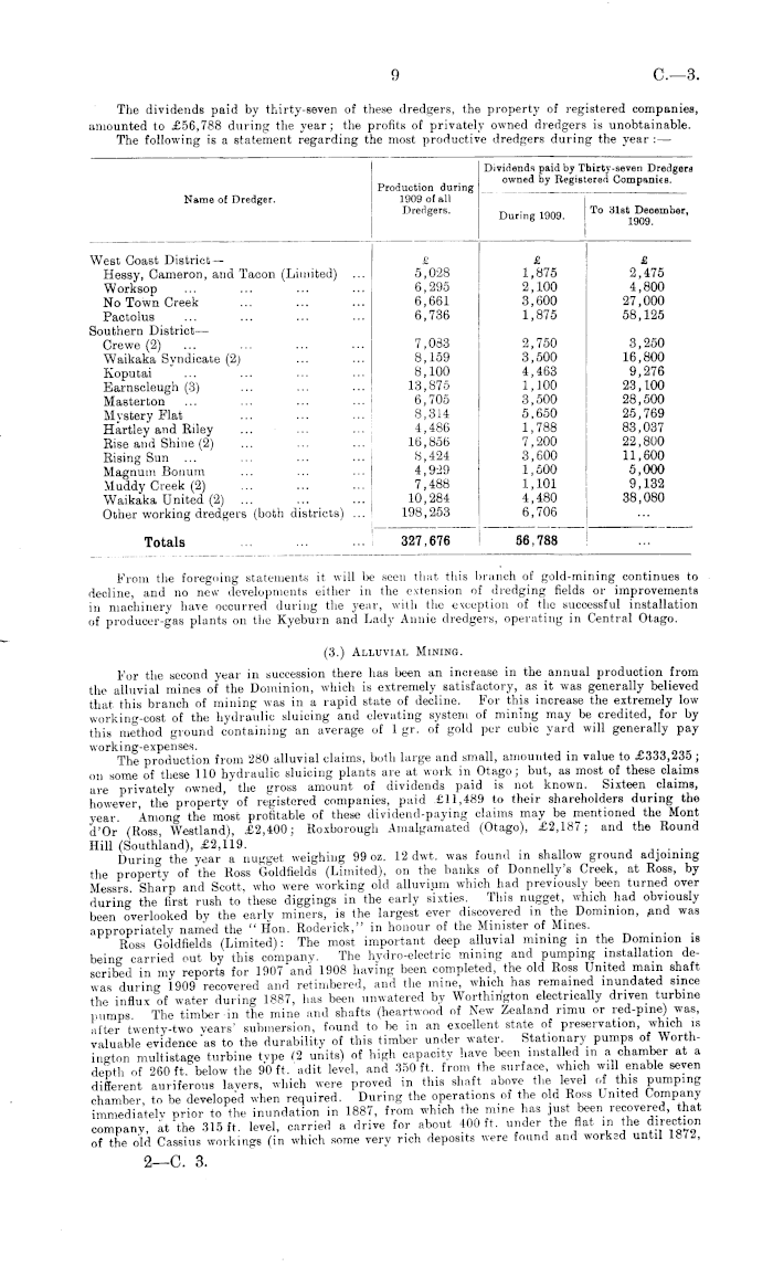 Dividends paid by Thirty-seven Dredgers owned by Registered Companies. Name of Dredger. Production during 1909 of all Dredgers. During 1909. To 3l8t December, 1909. Vest Coast District— Hessy, Cameron, and Taoon (Limited) Worksop No Town Creek Pactolus louthern District — Crewe (2) Waikaka Syndicate (2) Koputai Earnscleugh (3) Masterton Mystery Flat Hartley and Edey Eise and Shine (2) Rising Sun ... Magnum Bonum Muddy Creek (2) Waikaka United (2) ... ... Other working dredgers (both districts) ... £ 5?028 6,295 6,661 6,736 7,083 8,159 8,100 13,875 6,705 8,314 4,486 16,856 8,424 4,929 7,488 10,284 198,253 £ 1,875 2,100 3,600 1,875 2,750 3,500 4,463 1,100 3,500 5,650 1,788 7,200 3,600 1,500 1,101 4,480 6,706 £ 2,475 4,800 27,000 58,125 3,250 16,800 9,276 23,100 28,500 25,769 83,037 22,800 11,600 5,000 9,132 38,080 Totals 327,676 56,788
