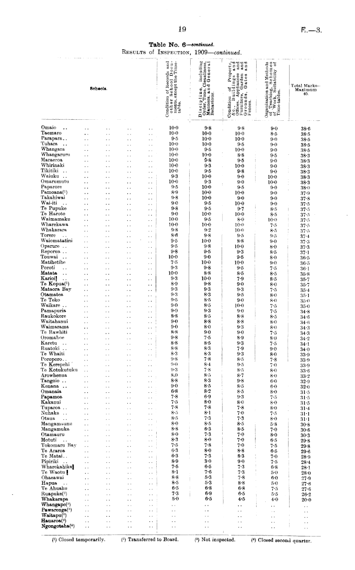 (!) Reopened first quarter, 1909. ( 2 ) Opened second quarter, 1909. (») Opened fourth quarter, 1909. (') Closed second quarter, 1909. ( 5 ) Transferred to Southland Education Hoard at end of third quarter. 1909. (») Closed temporarily, September, 1909. (') Closed temporarily, June, 1909. (") Transferred to Anckland Education Board first quarter, 1909. l»l closed first quarter, 1909. (io) Opened first quarter.