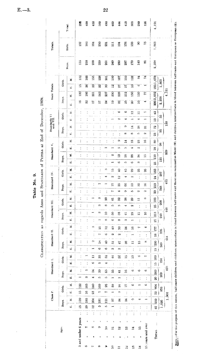 Table No. 5. Race of the Children attending the Native Village Schools on 31st December, 1909. For the purposes of this Return, half-caste children and children intermediate in blood between half-caste and Maori are reckoned as Maori, and children intermediate in blood between half-caste and European as European.